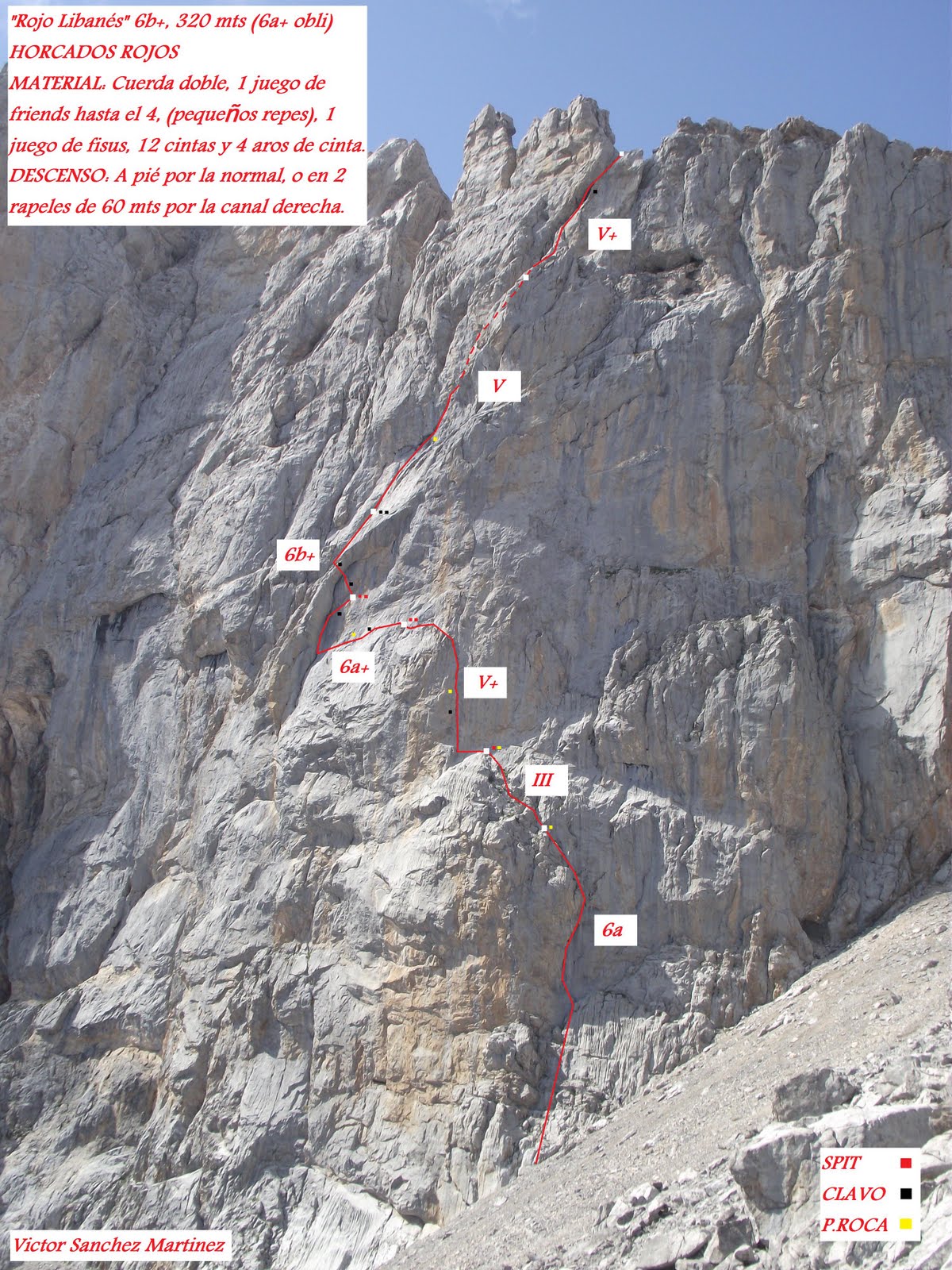 Recorrer las vías del margen derecho de Horcados Rojos es un placer, un lujo… y eso no quiere decir que sea un camino de rosas o escalada placer, estas vías hay que “ganárselas”. Son auténticas joyas de la escalada tradicional, abiertas con un estilo impecable que debería ser el referente para futuras generaciones de escaladores de montaña. Hay que tener en cuenta que no son vías para todos los públicos, cualquiera que afronte estas vías debe de estar dispuesto a aceptar el reto psicológico, no solo el físico. (texto de http://www.guiaspicos.com)
