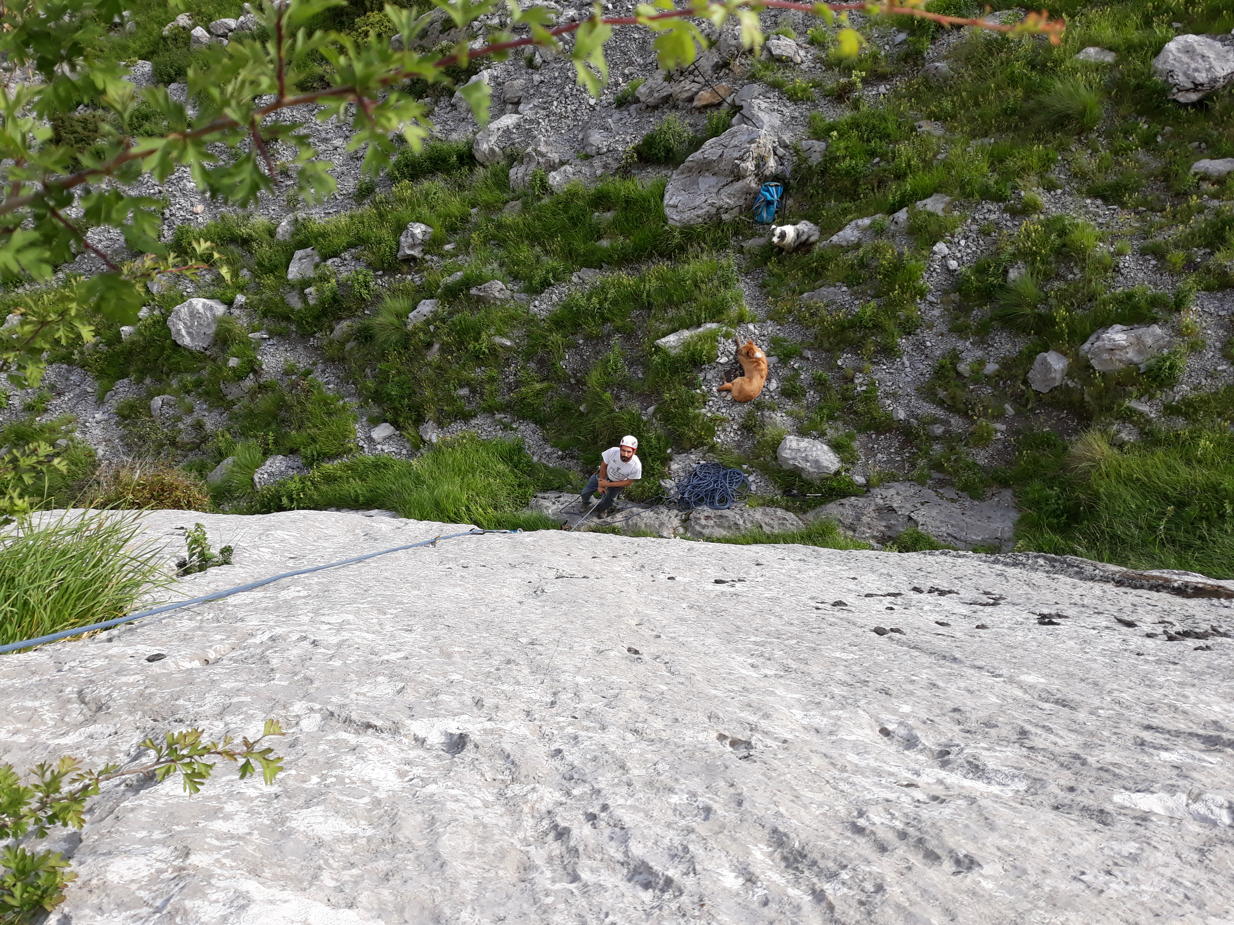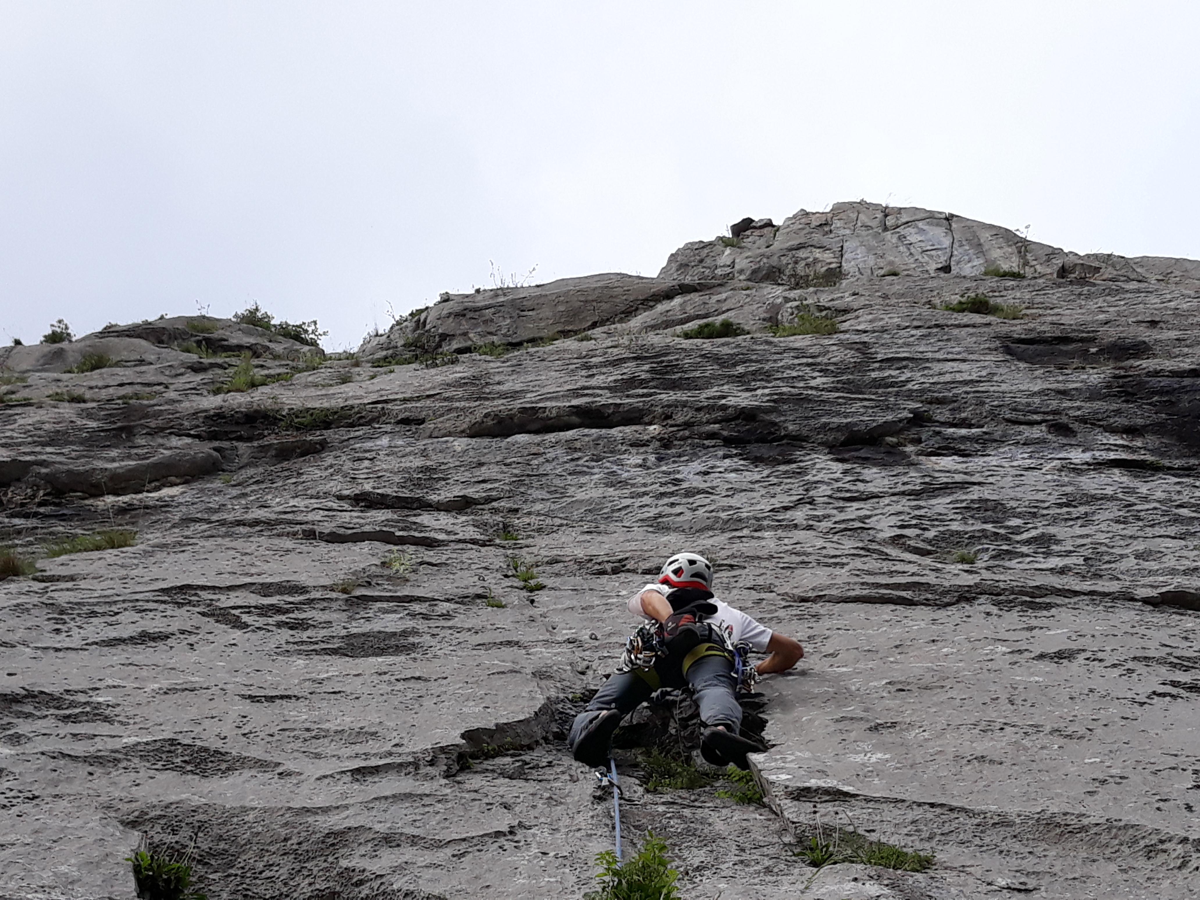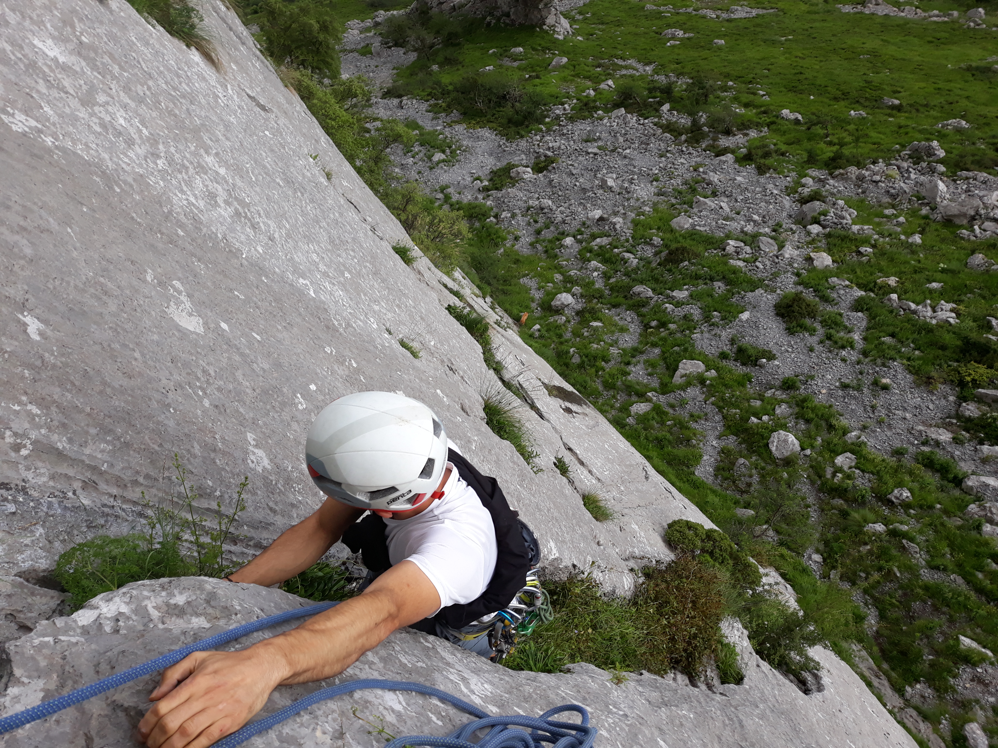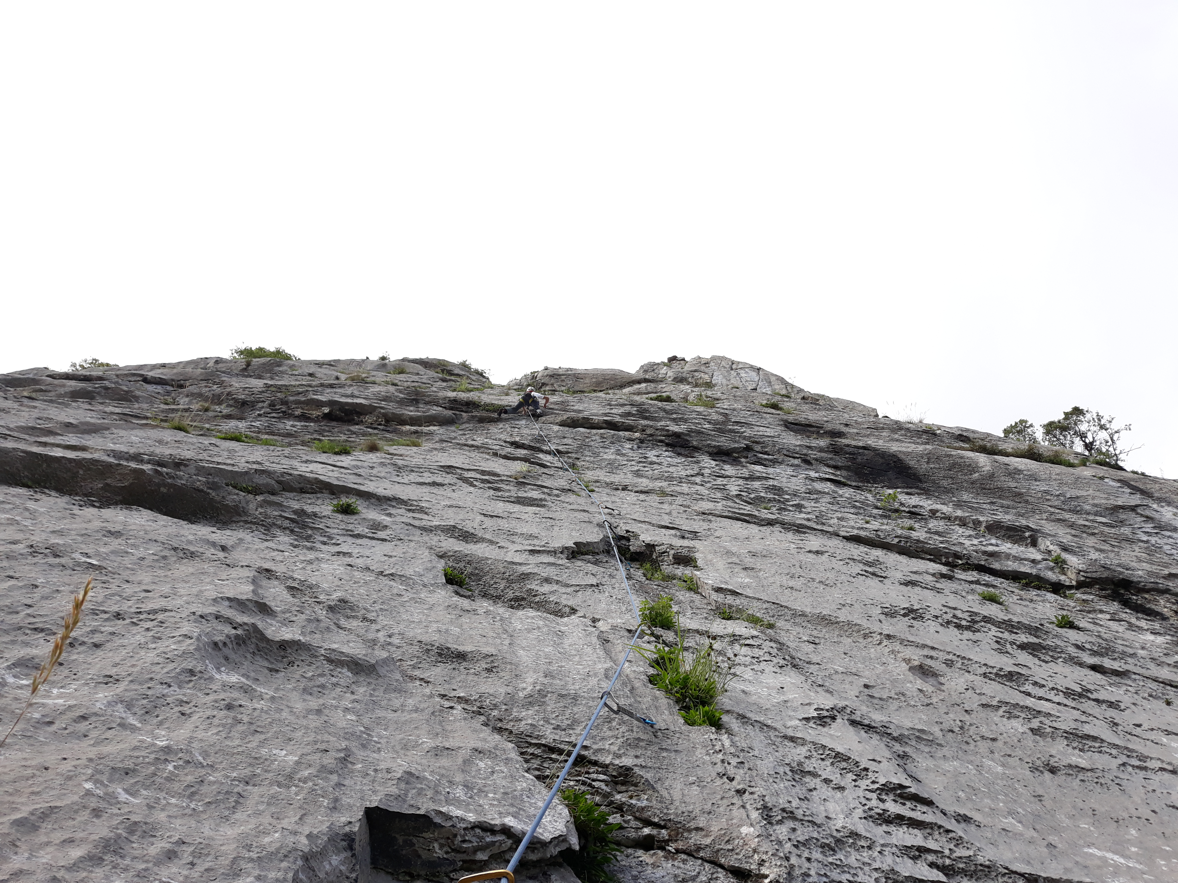 Largo 1,6a+: La primera chapa está muy alta pero se hace bien, plaquita protegida por dos parabolts para después entrar en una chimenea herbosa hasta la reunión (2 parabolts).
