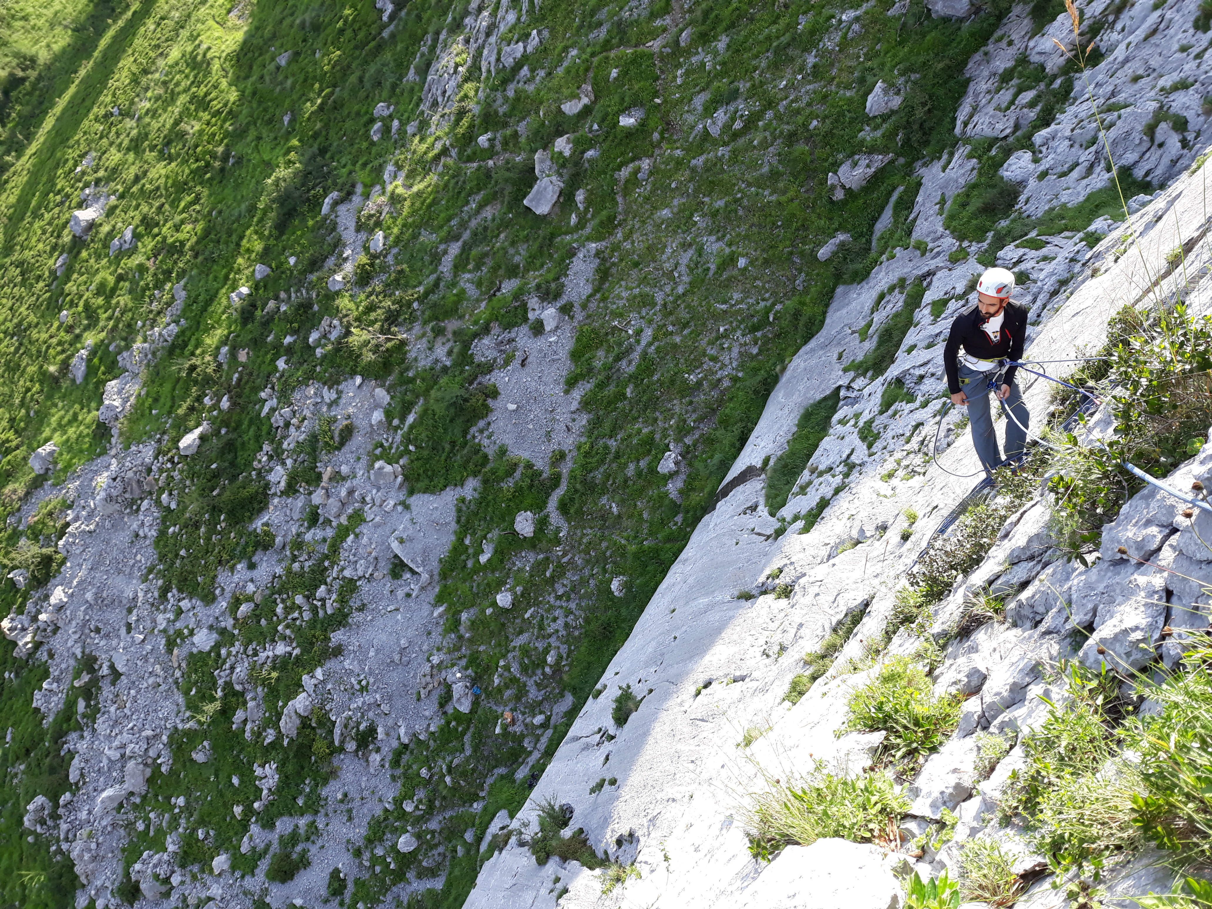 Una vez en la cima de Urrestei , tendremos que andar unos metros hacia la izquierda para alcanzar el rapel que nos depositará en el suelo.