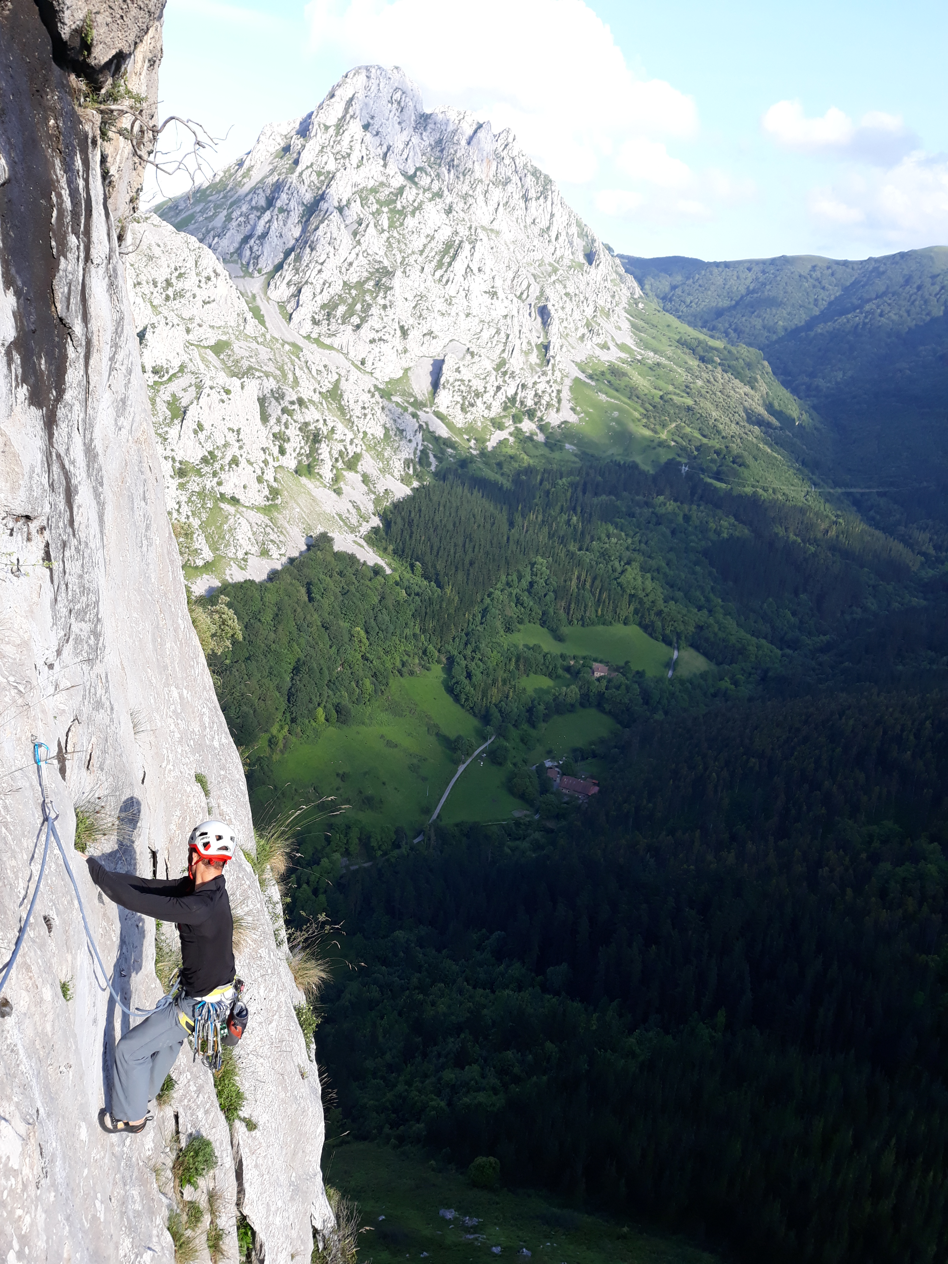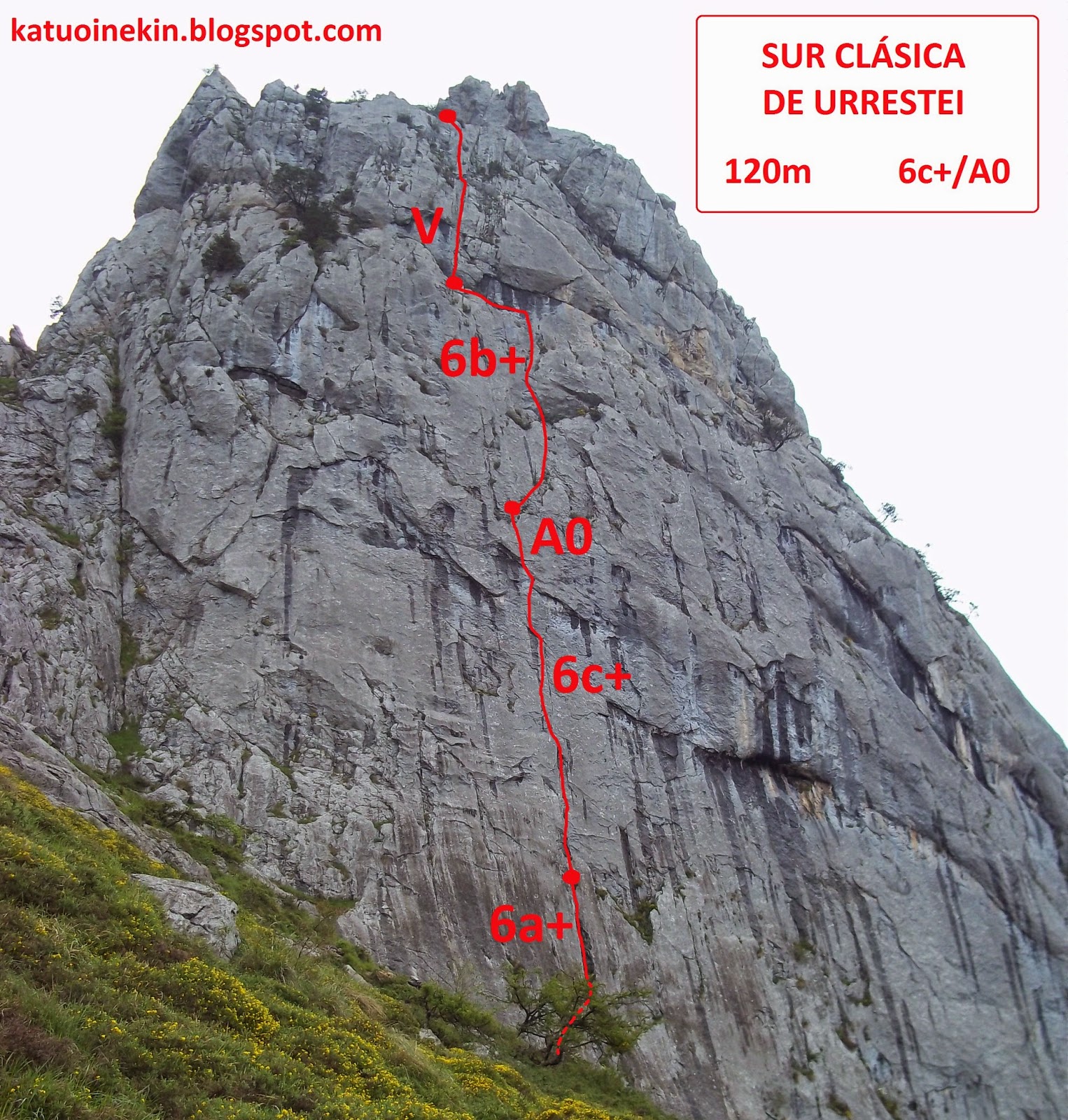 Una de las clásicas de Atxarte. Vía con ambiente y roca excelente que surca de manera directa la pared de Urrestei Sur hasta alcanzar la cima. Espectacular. Vía 5 estrellas.