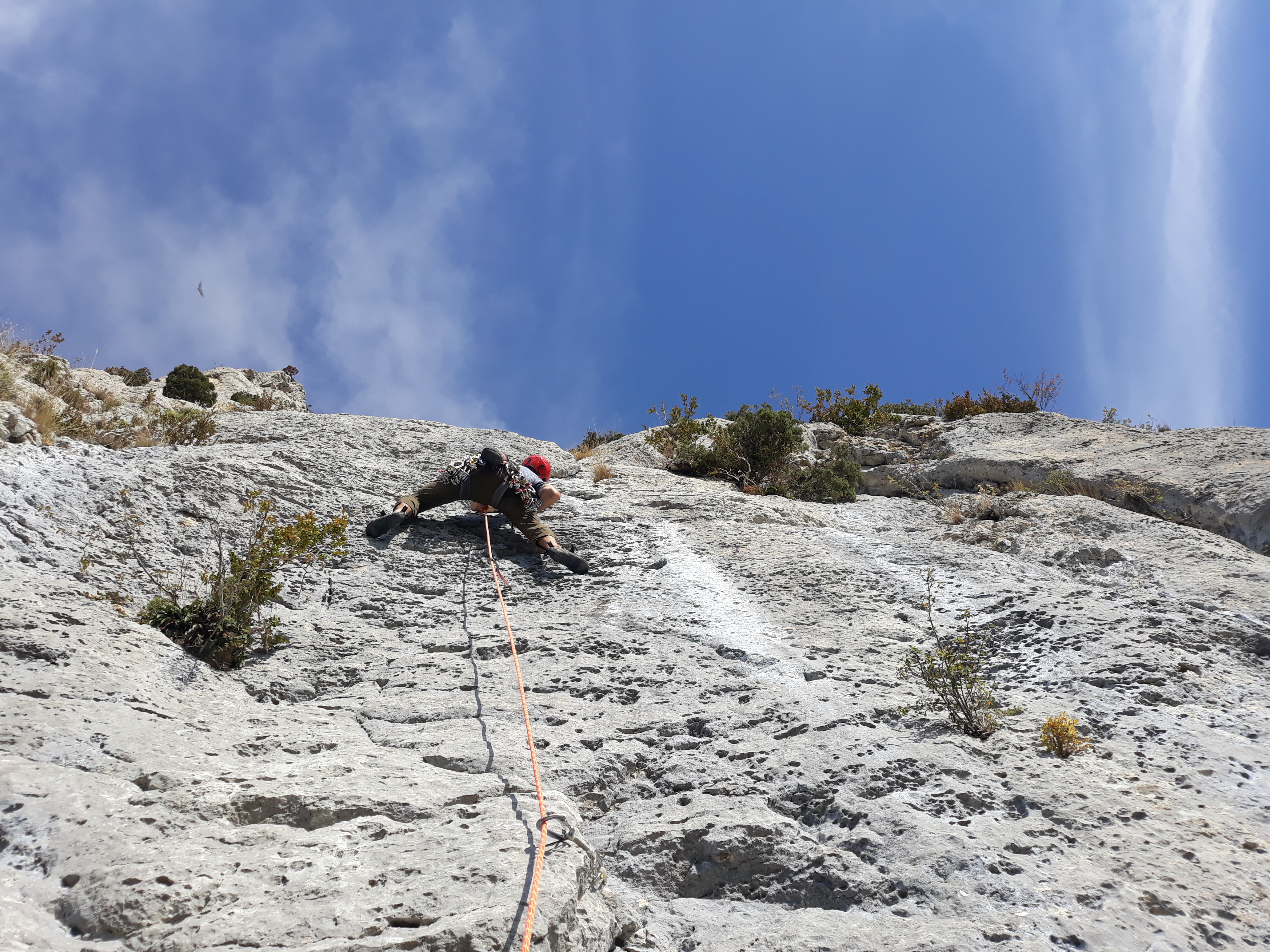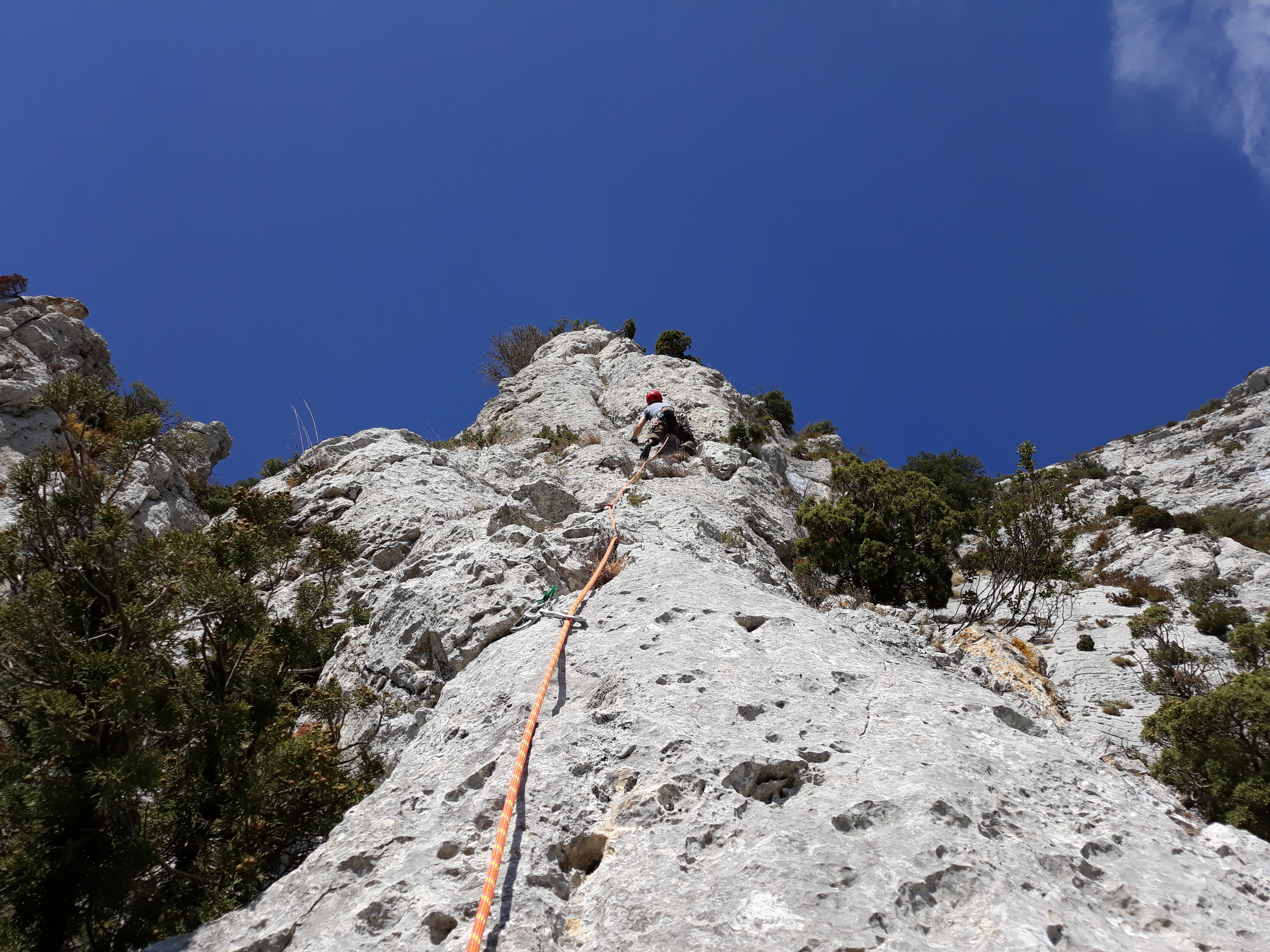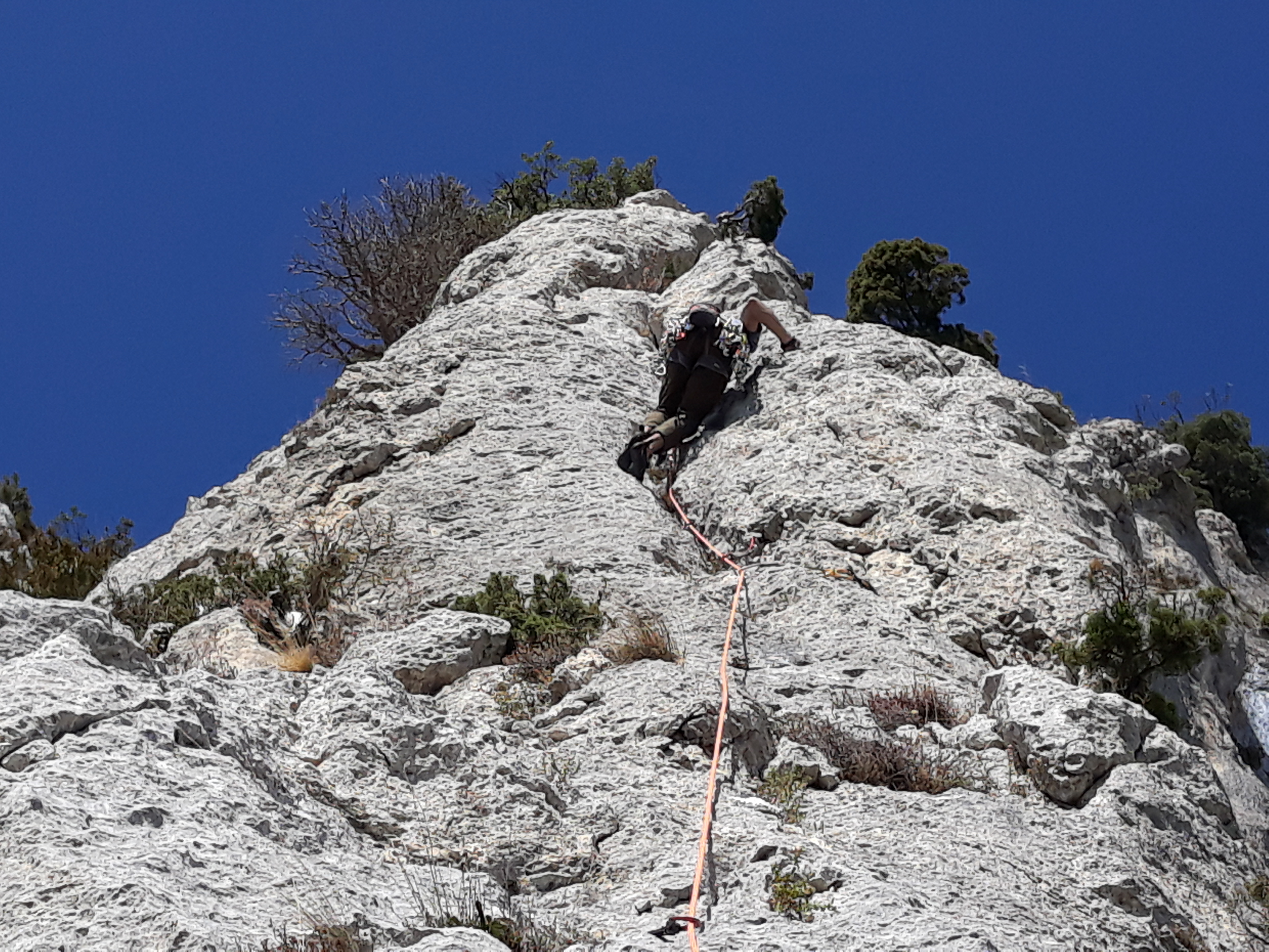 Largo 2, 6a: Salimos de la reunión con tendencia a derechas para superar un desplomillo y afrontar una placa corta con 2 parabolts. Después por terreno fácil hasta la reunión.