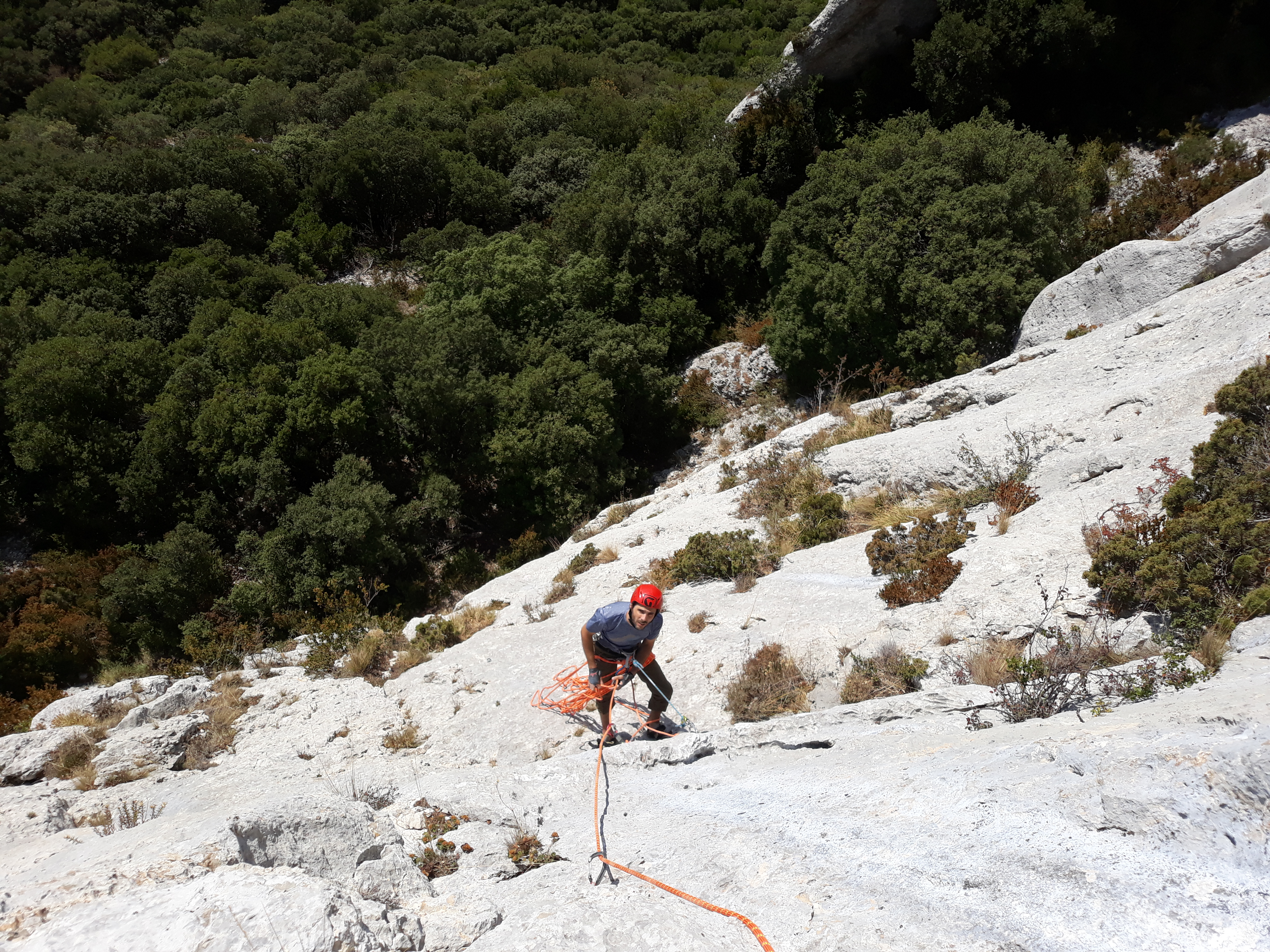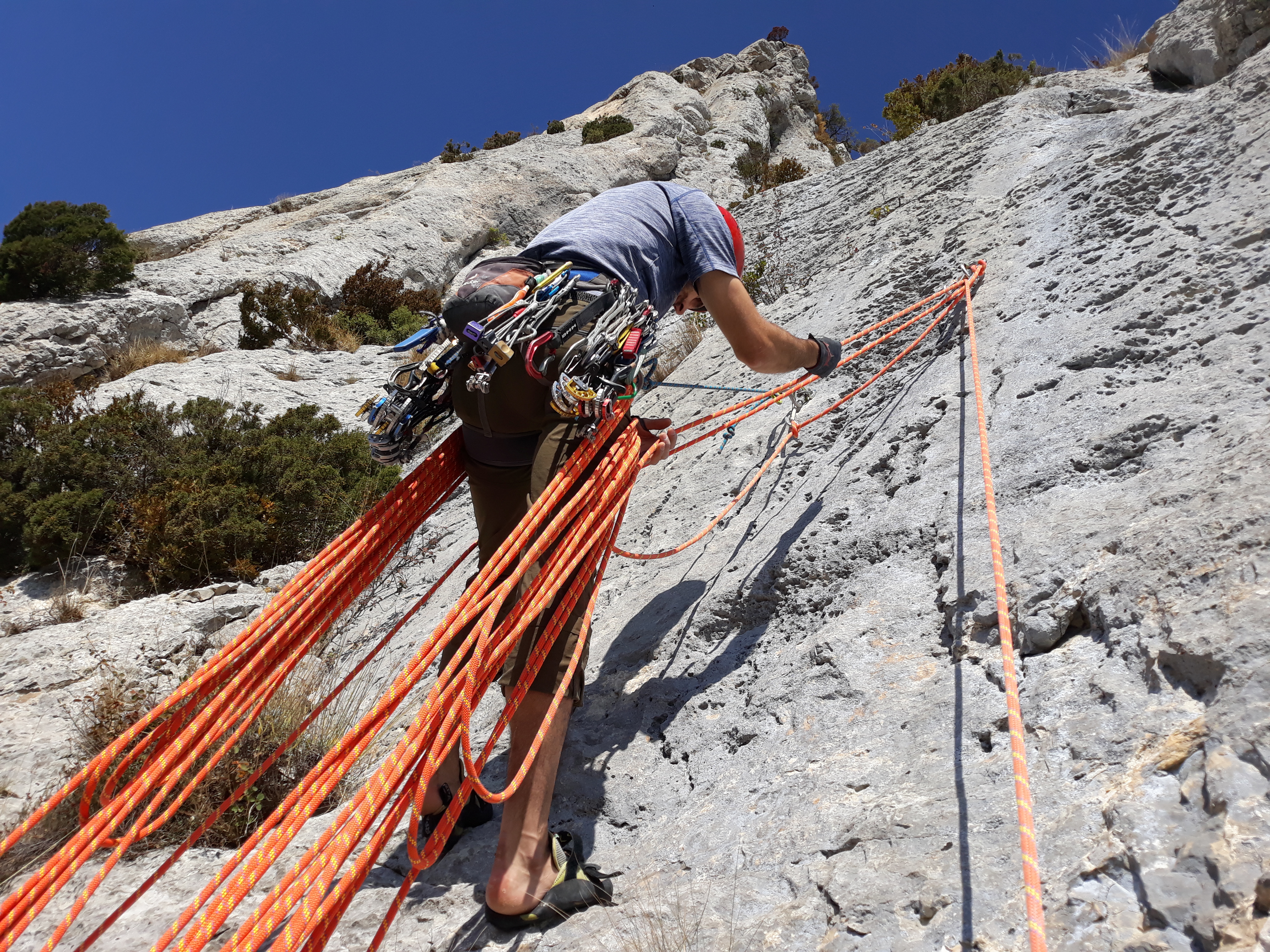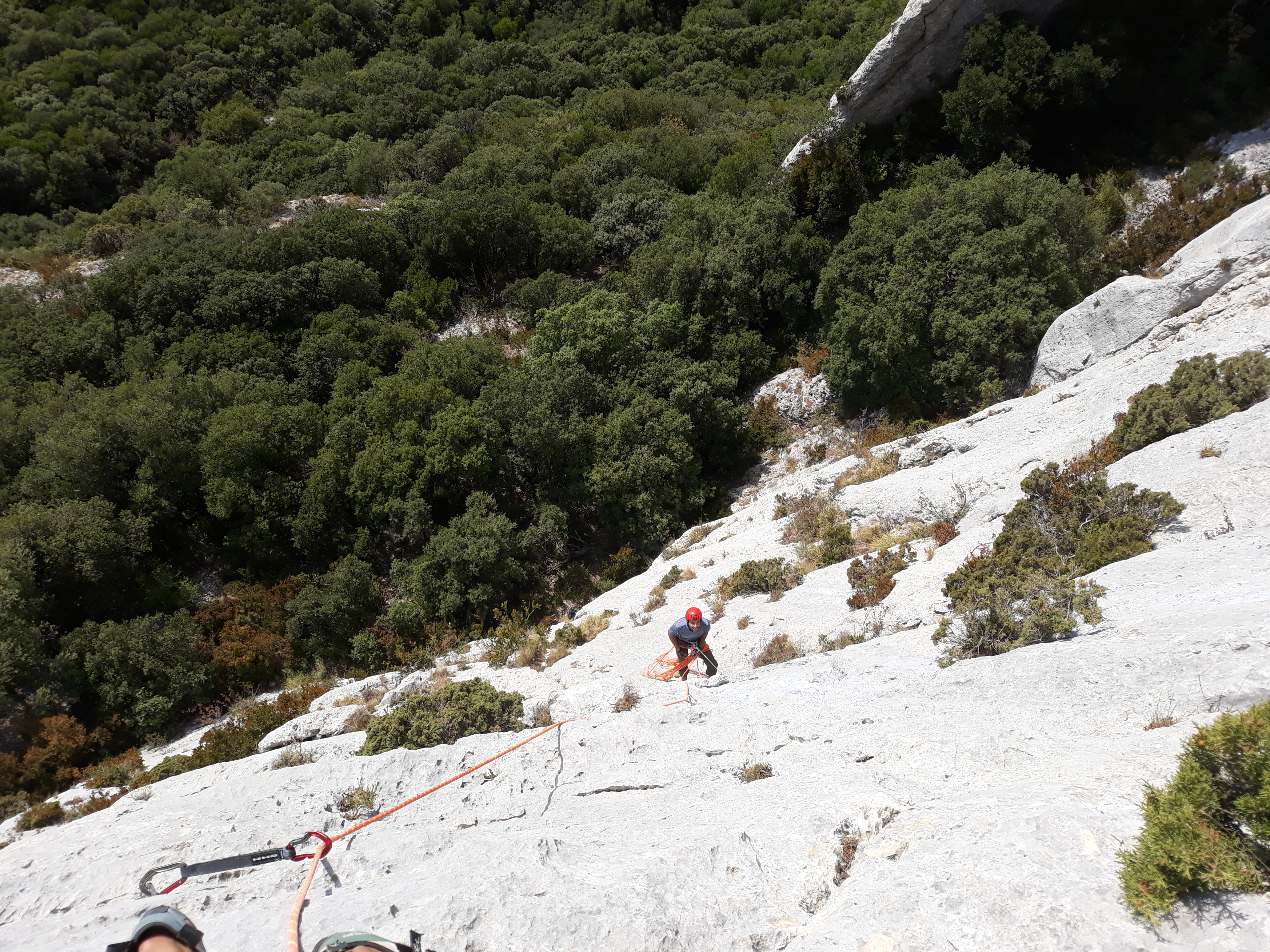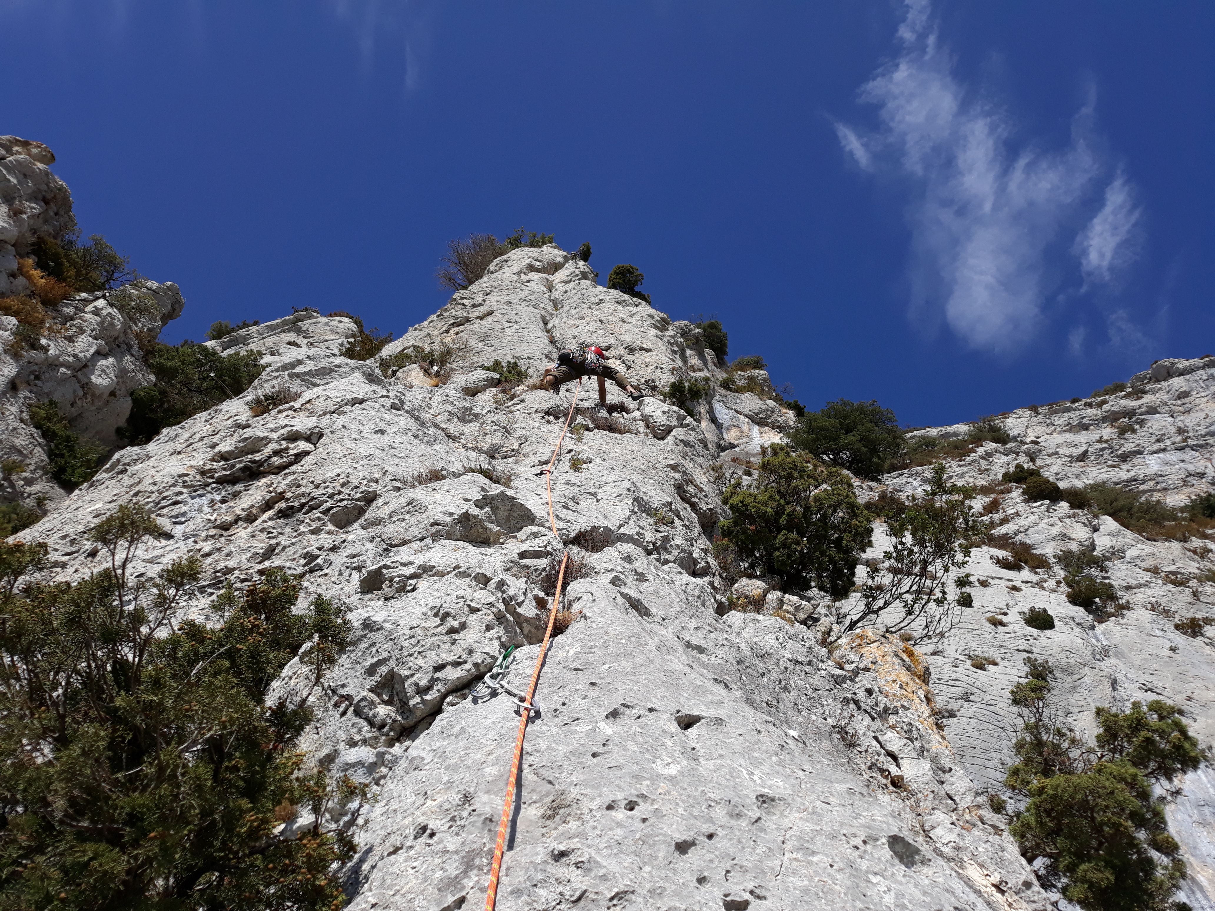 Largo 2, 6a: Salimos de la reunión con tendencia a derechas para superar un desplomillo y afrontar una placa corta con 2 parabolts. Después por terreno fácil hasta la reunión.