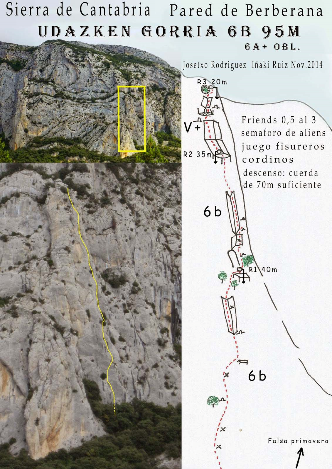 Al acabar la vía me empeñé en catar el primer largo de la vía «Udazken Gorria», una placa de agujeros pequeños que acaba en un diedro. Me pareció buenísima aunque en la tónica de Sierra Cantabria, pocos seguros fijos. Habrá que volver para escalarla, tiene muy buena pinta.