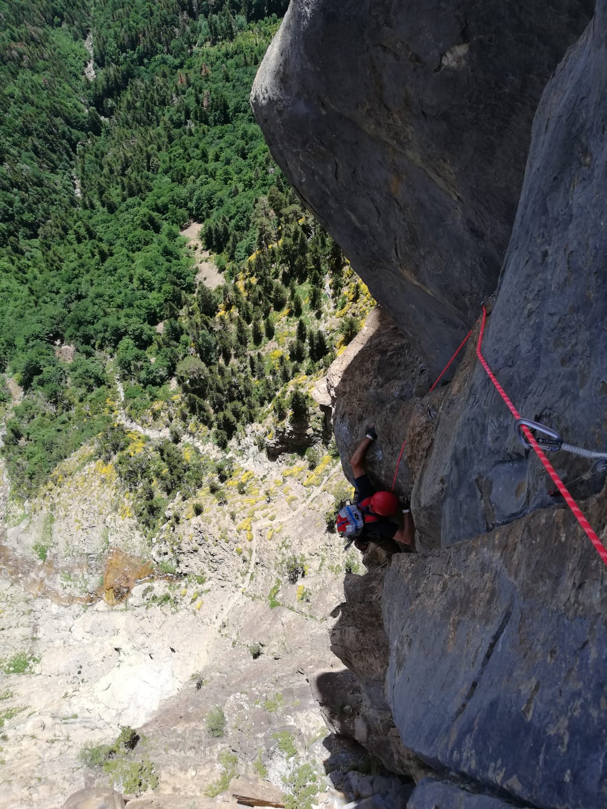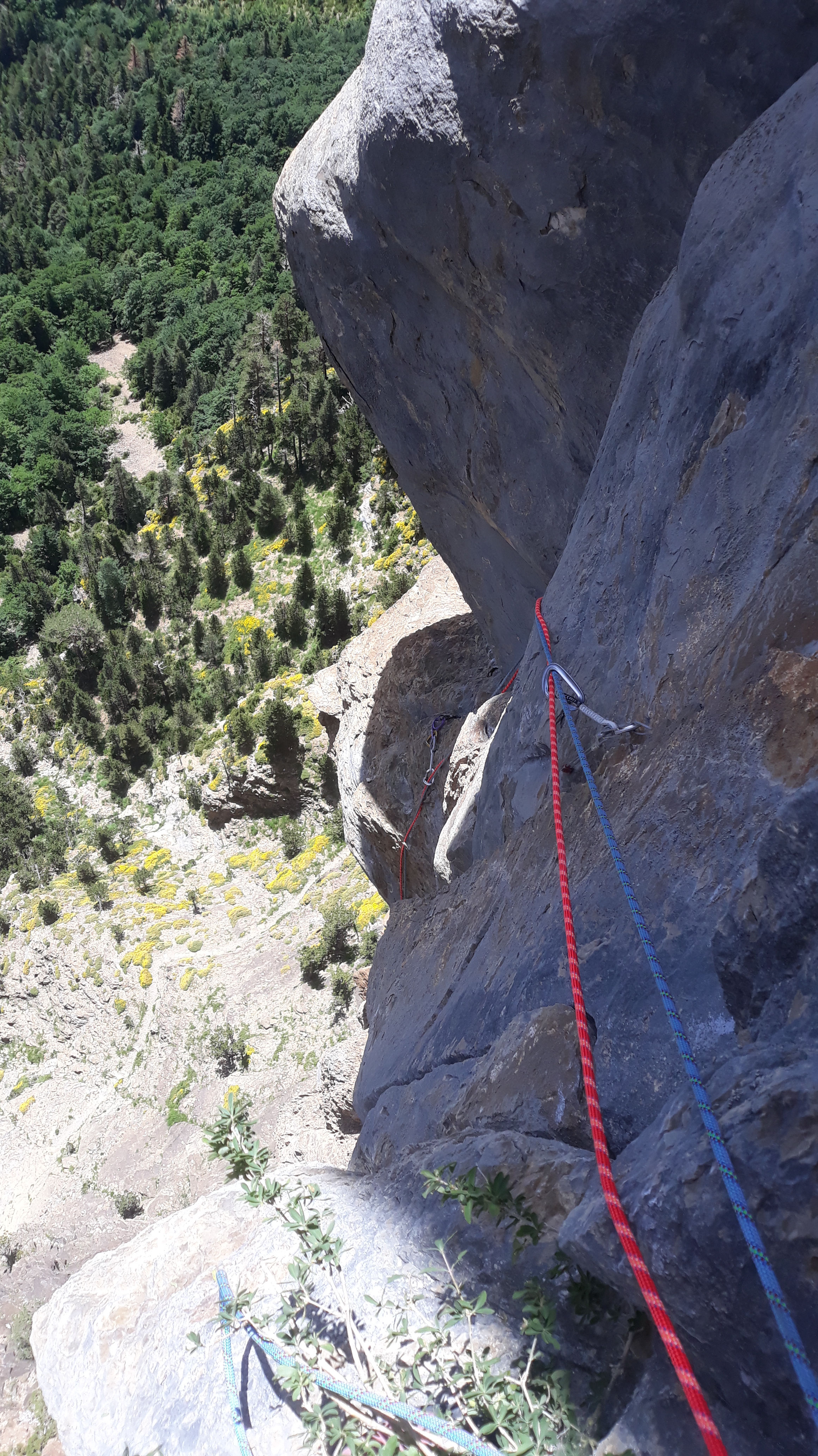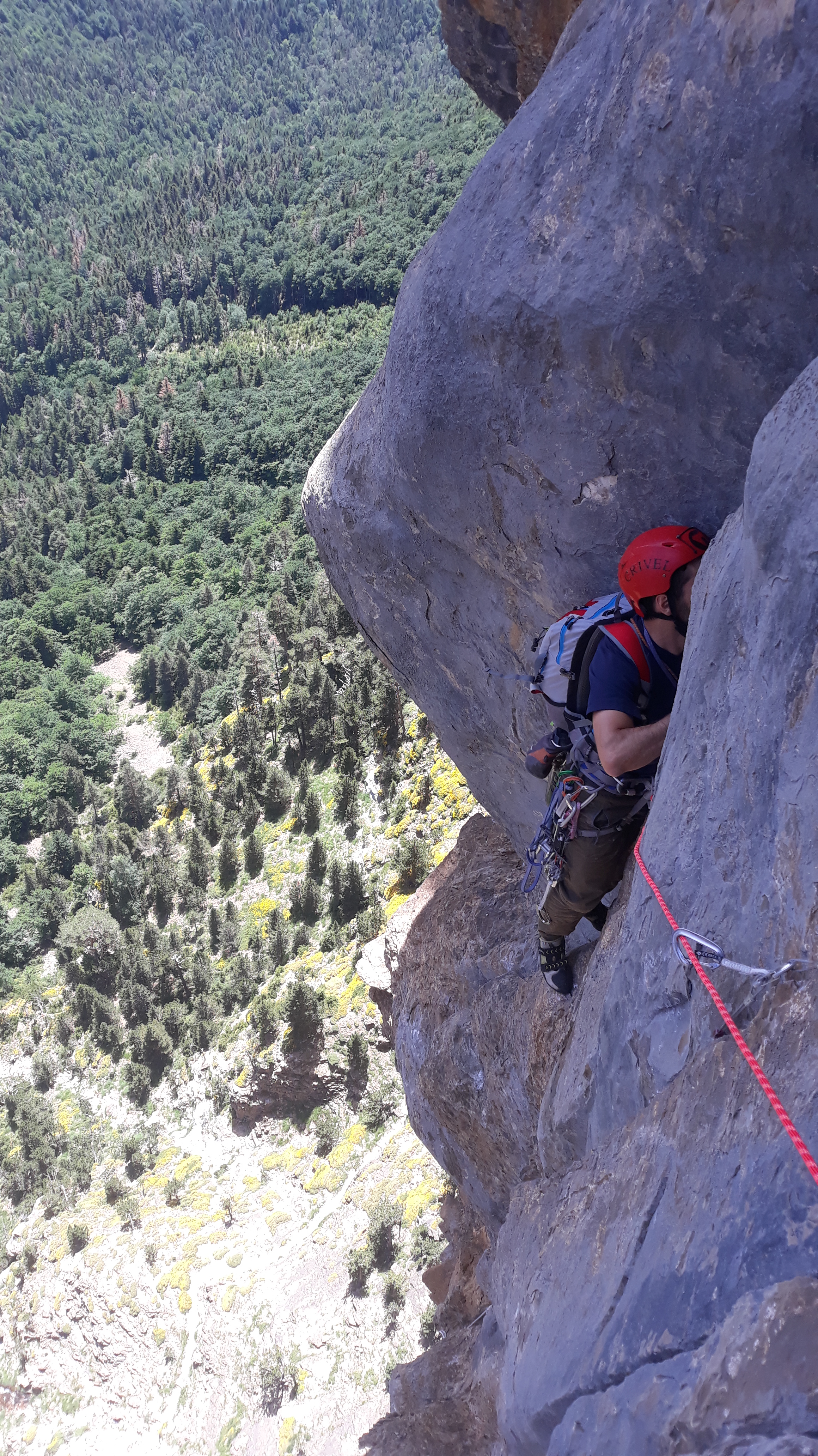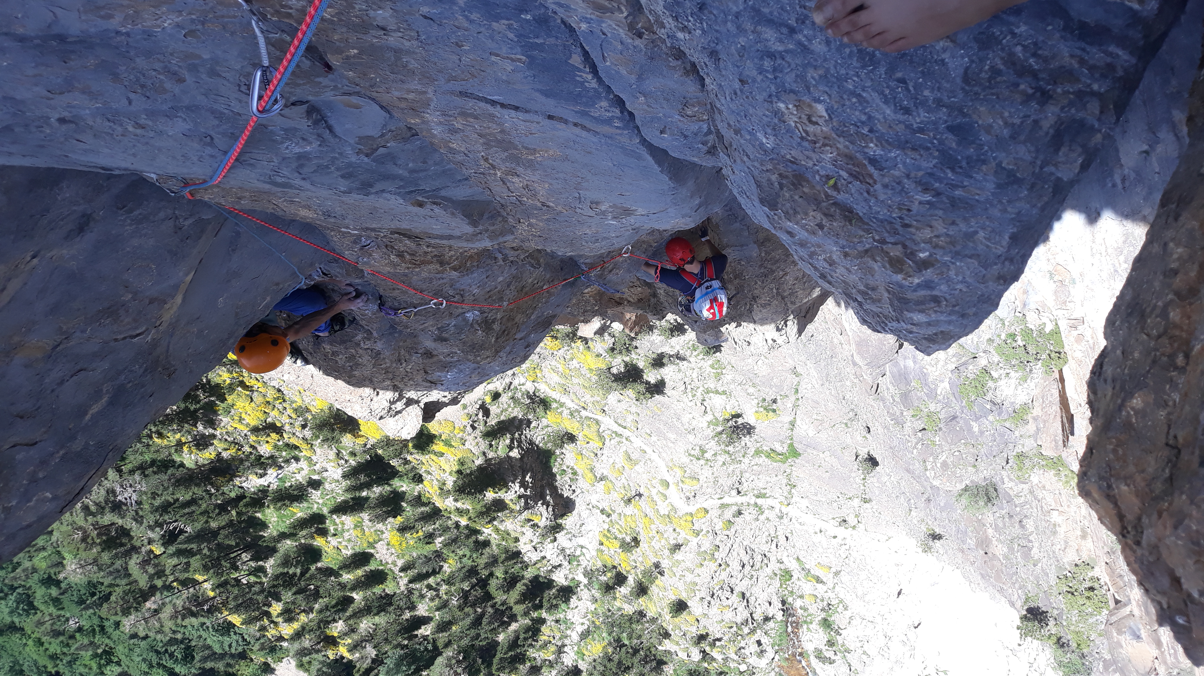 Largo 2, V+, 55 metros: Salida hacia la derecha para contornear los techos que tenemos encima de la reunión, continuamos con la tónica del diedro/chimenea pero saliendo a la placa de la derecha (roca gris) que da buen canto. Después se transforma en bavaresa tumbada guapísima…