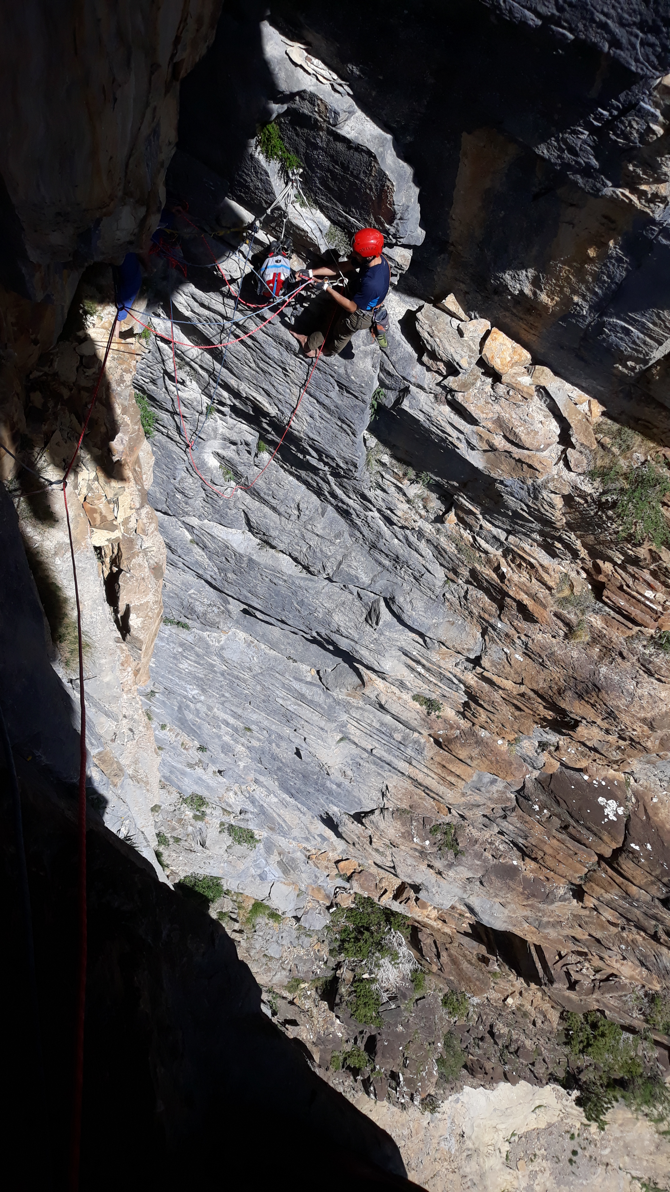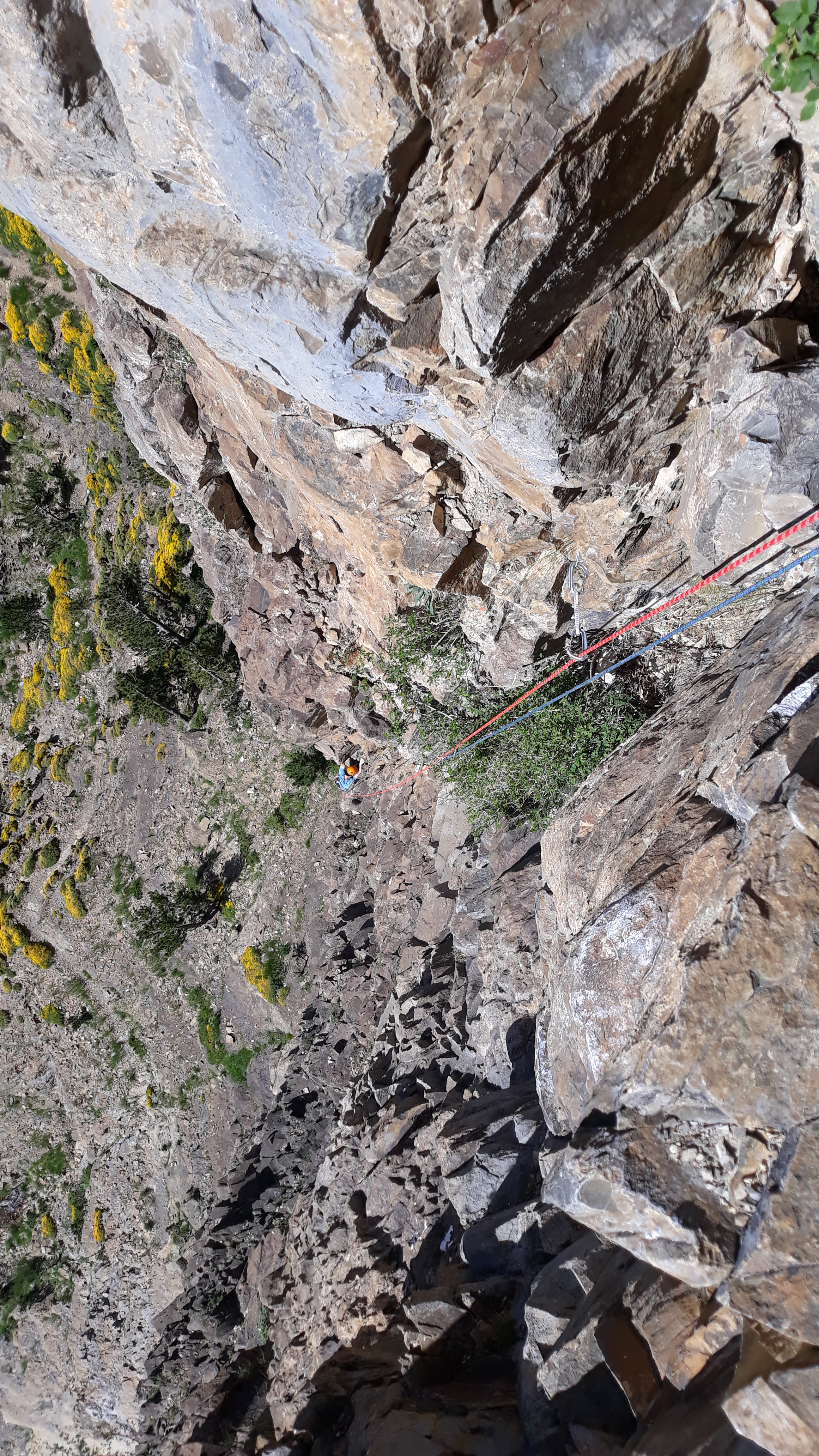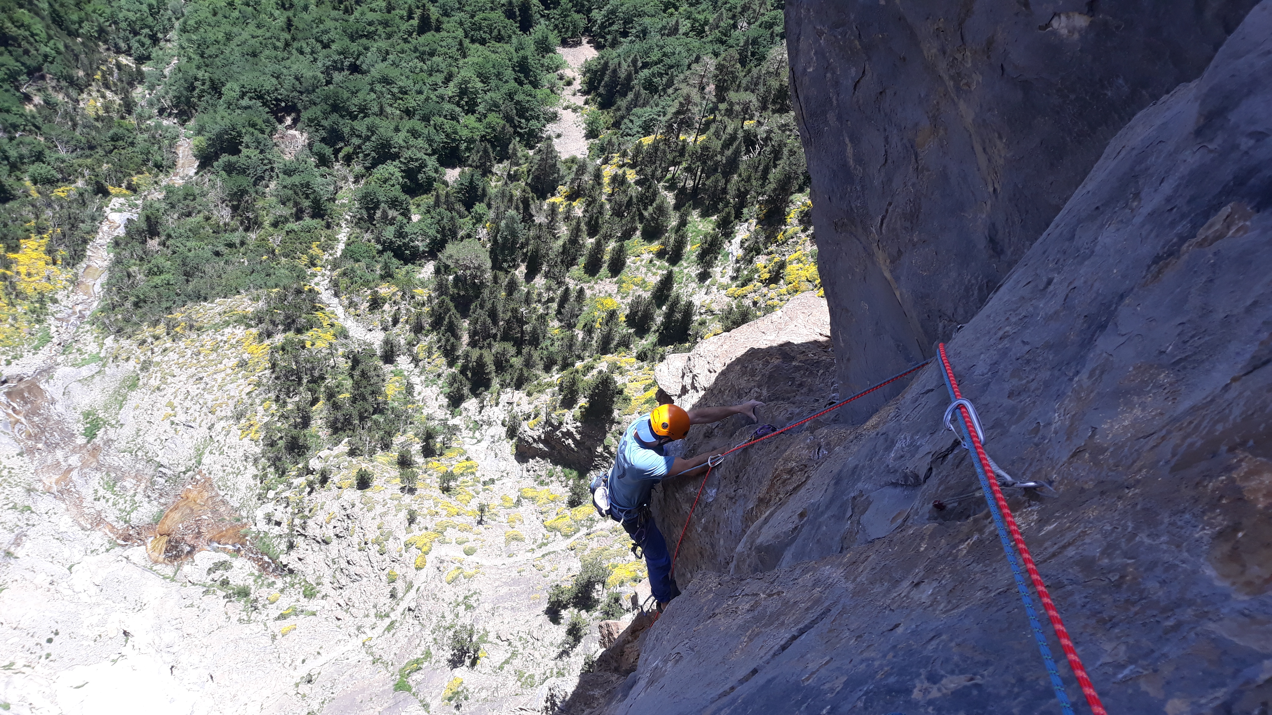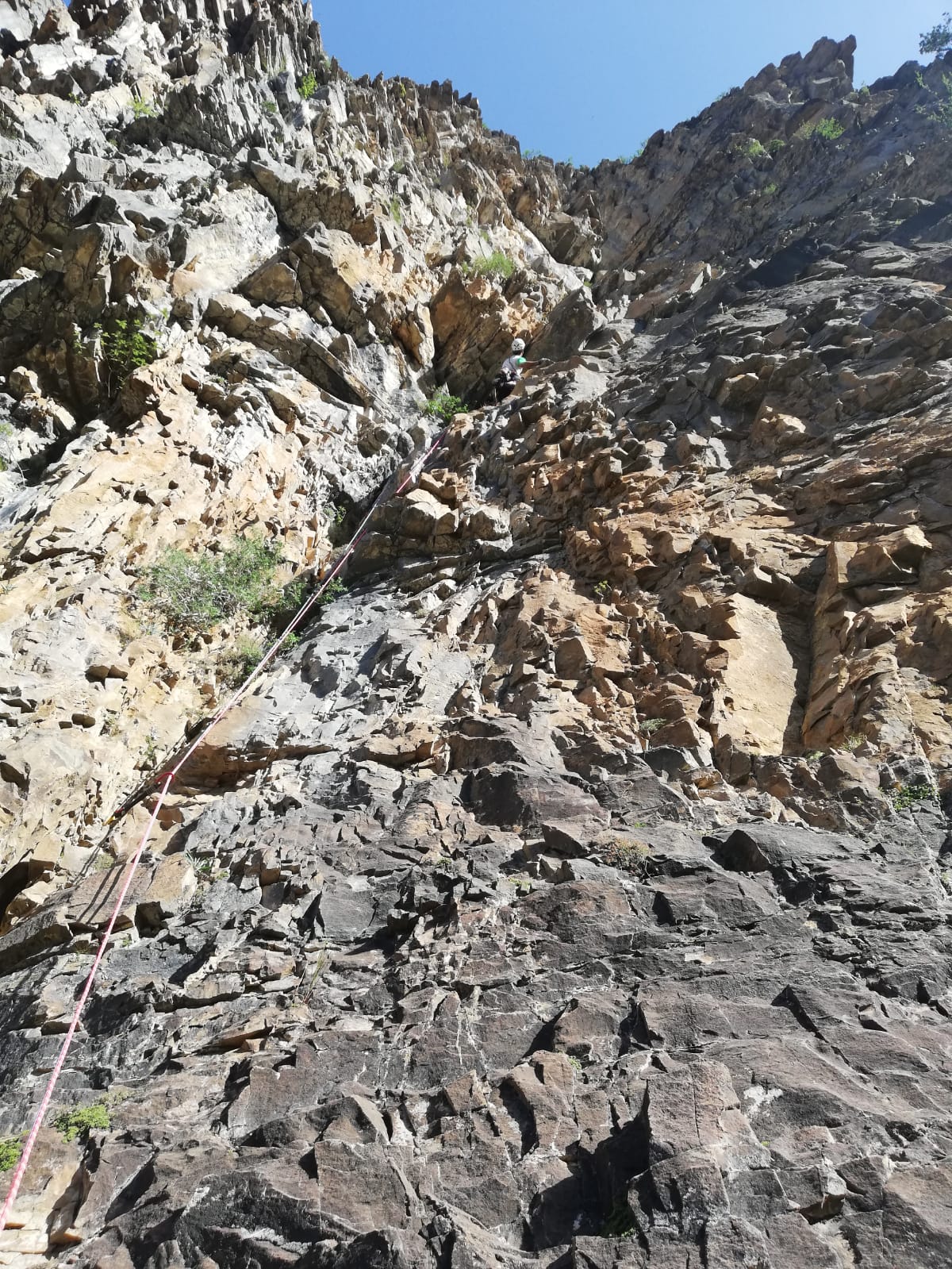 Largo 2, V+, 55 metros: Salida hacia la derecha para contornear los techos que tenemos encima de la reunión, continuamos con la tónica del diedro/chimenea pero saliendo a la placa de la derecha (roca gris) que da buen canto. Después se transforma en bavaresa tumbada guapísima…