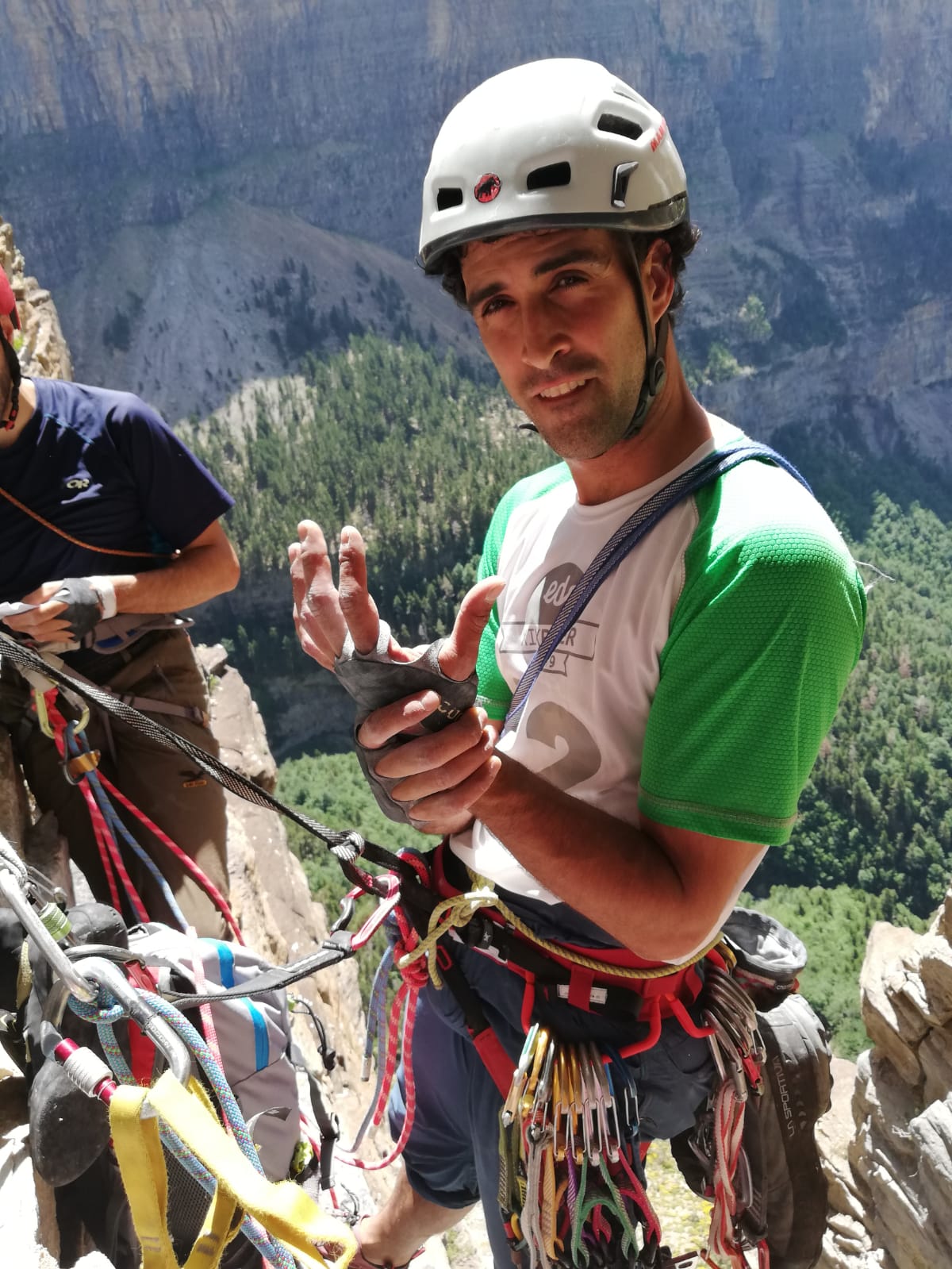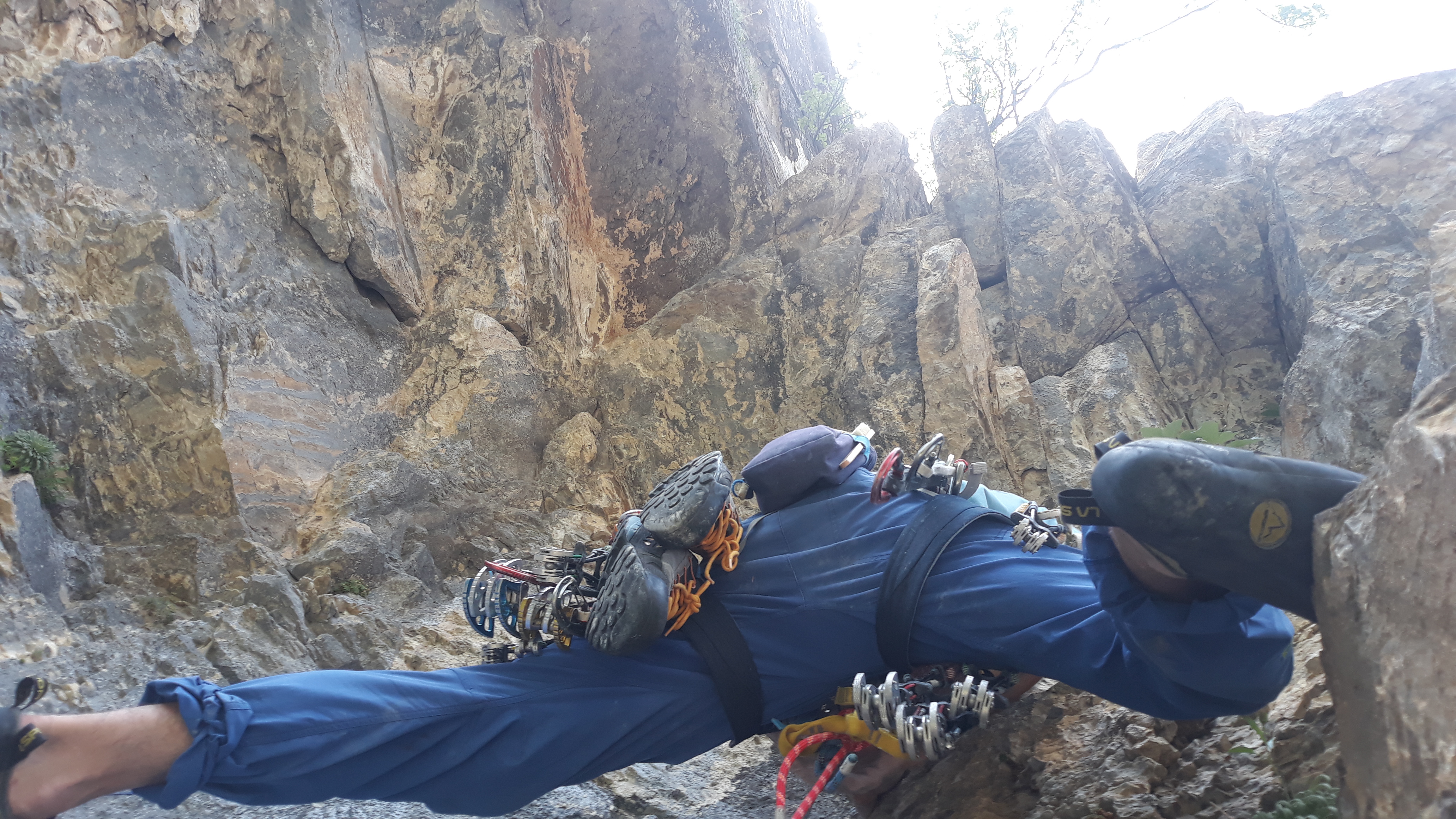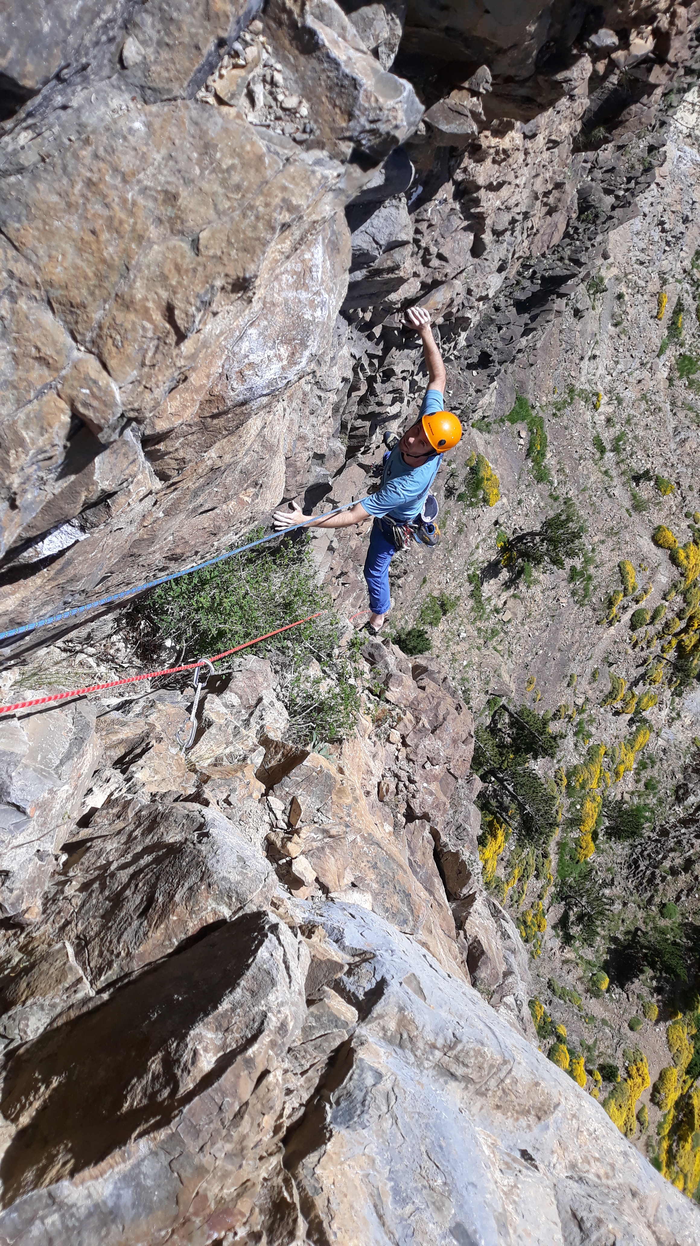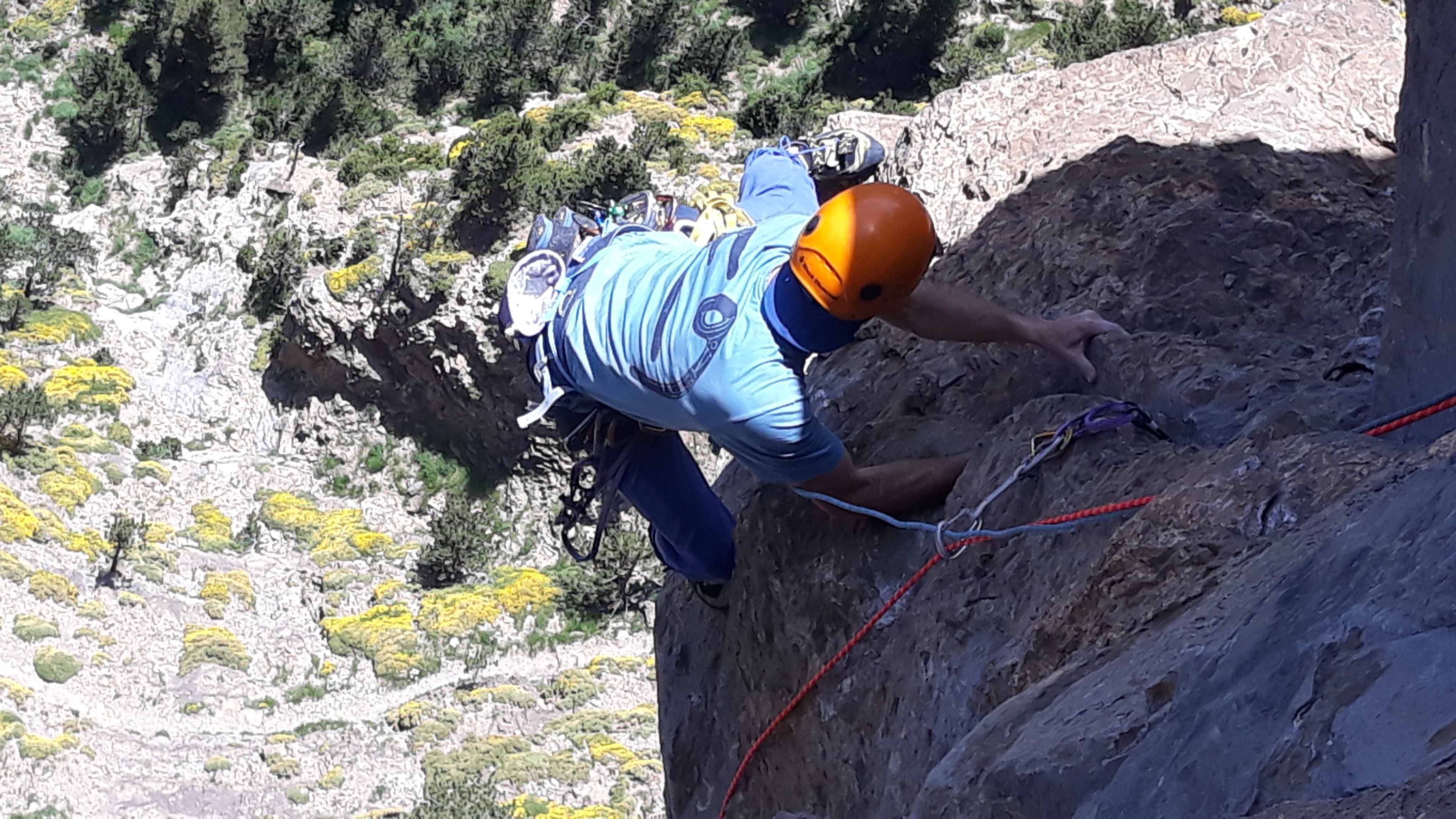 Largo 2, V+, 55 metros: Salida hacia la derecha para contornear los techos que tenemos encima de la reunión, continuamos con la tónica del diedro/chimenea pero saliendo a la placa de la derecha (roca gris) que da buen canto. Después se transforma en bavaresa tumbada guapísima…