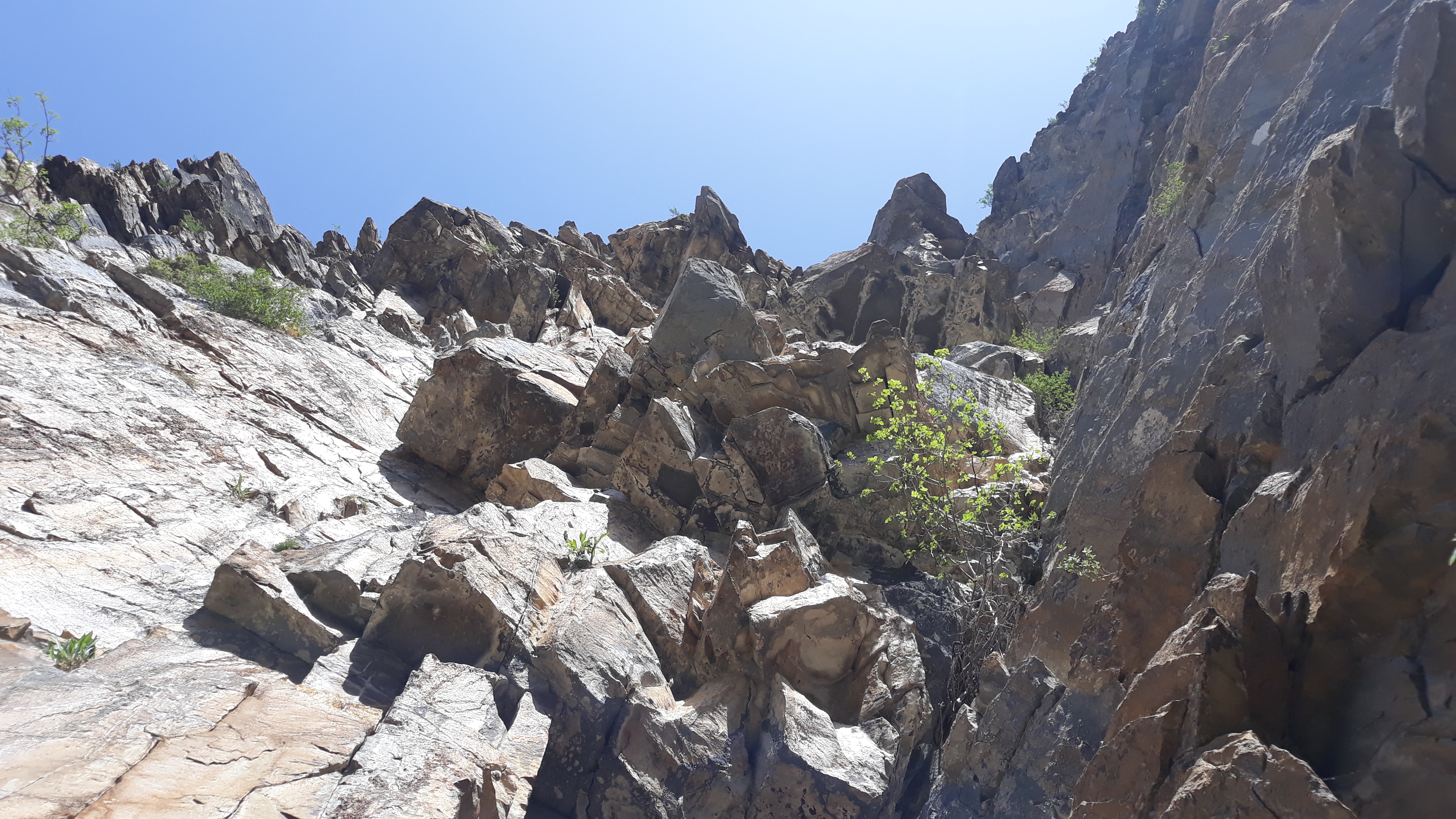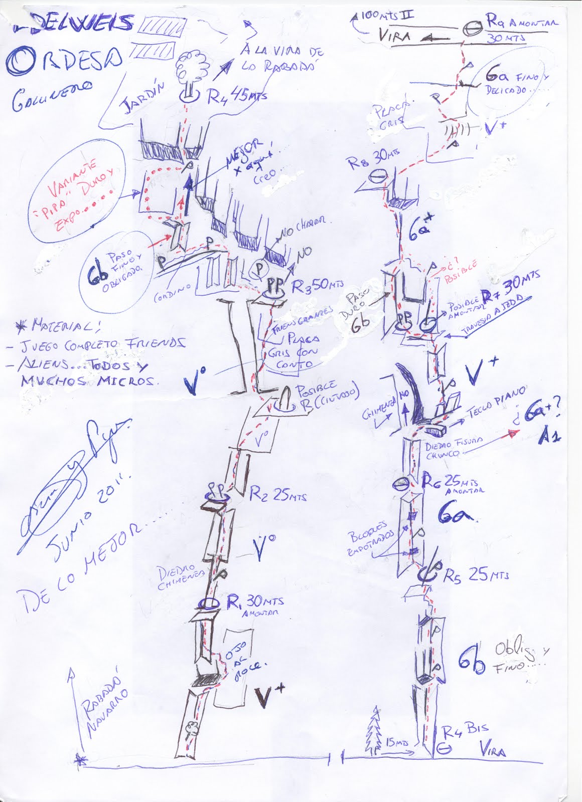 Impresionante vía con el sello de Jesús Gálvez, pocos seguros y algunas reuniones limpias. Grado obligado, si no se tiene el nivel puede resultar una aventura que se puede atragantar. Mucho ambiente y posibilidad de embarques al no tener apenas clavos la vía.