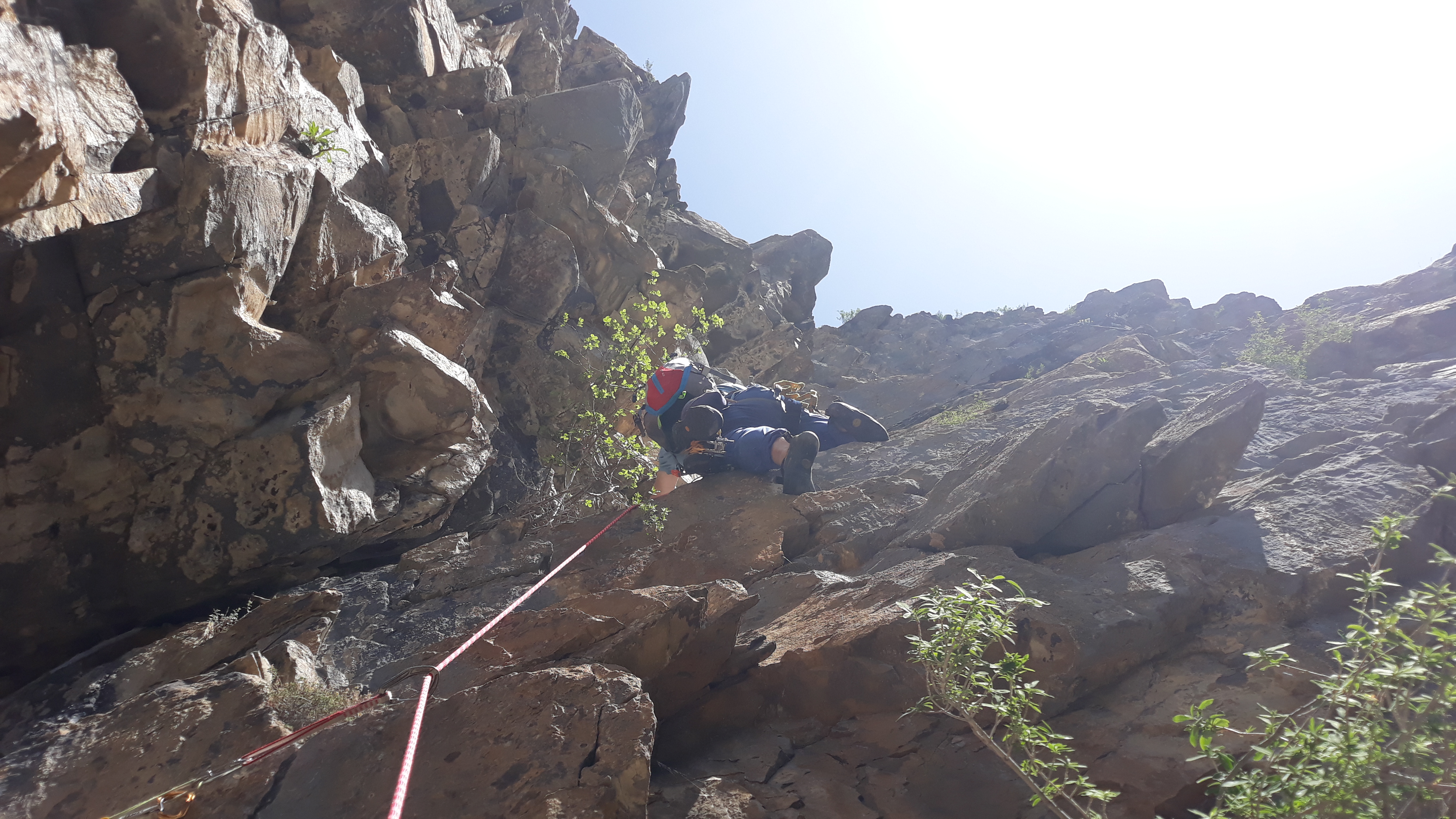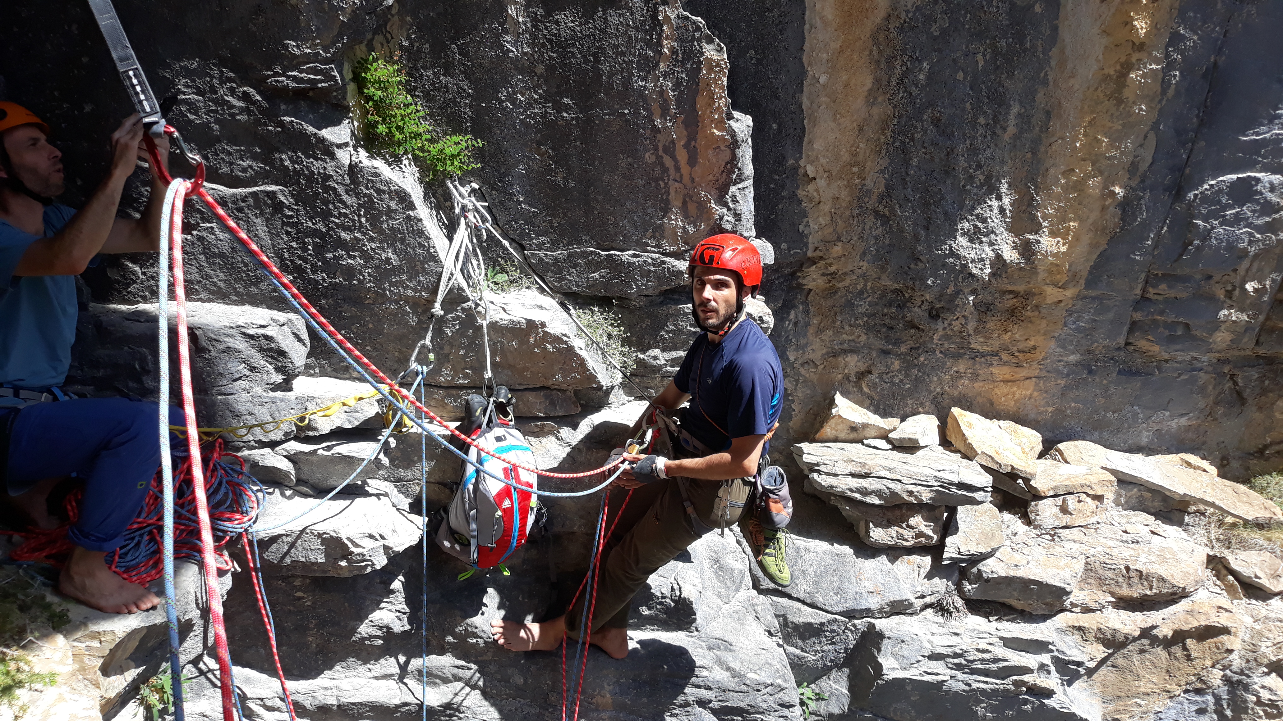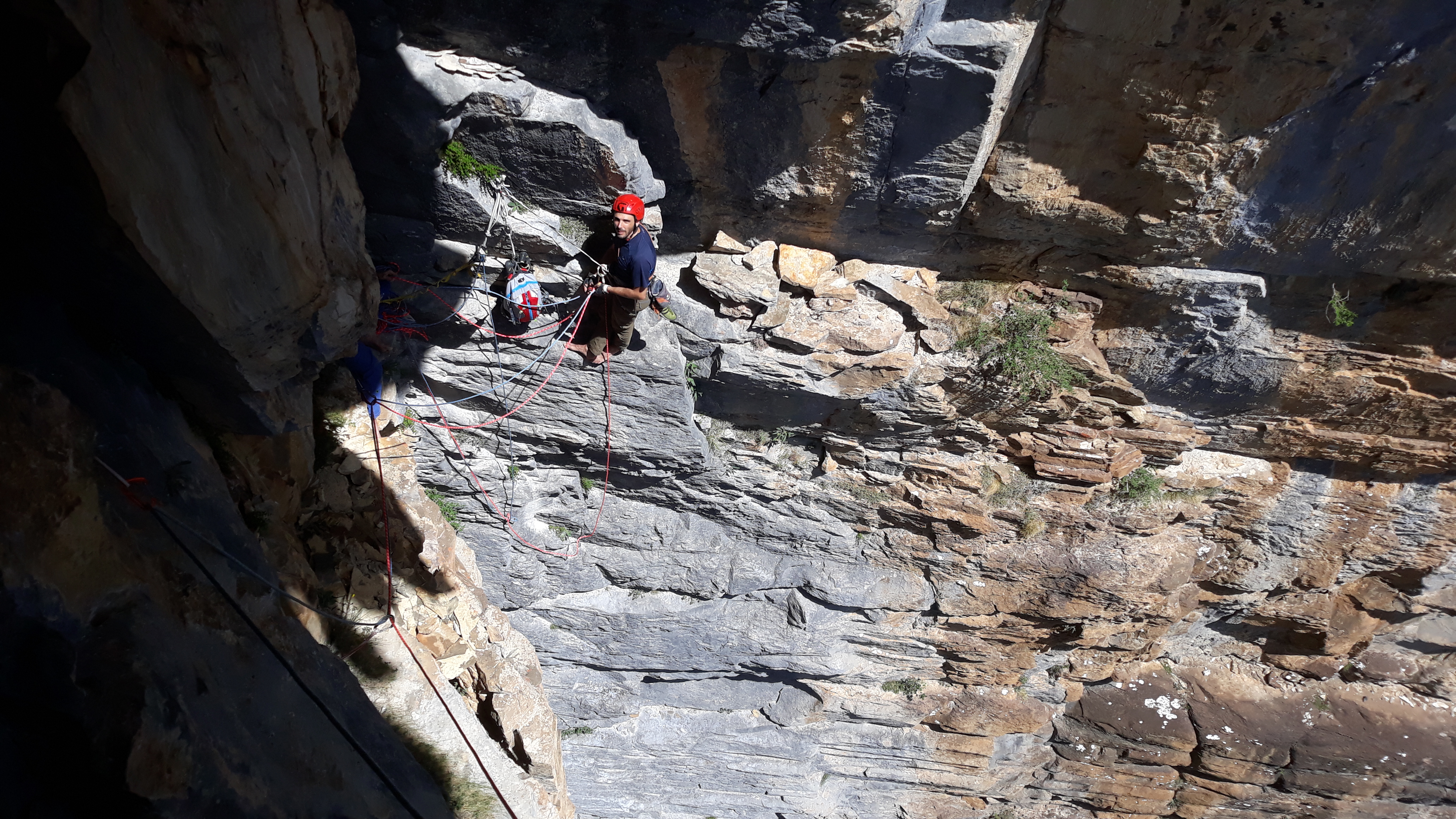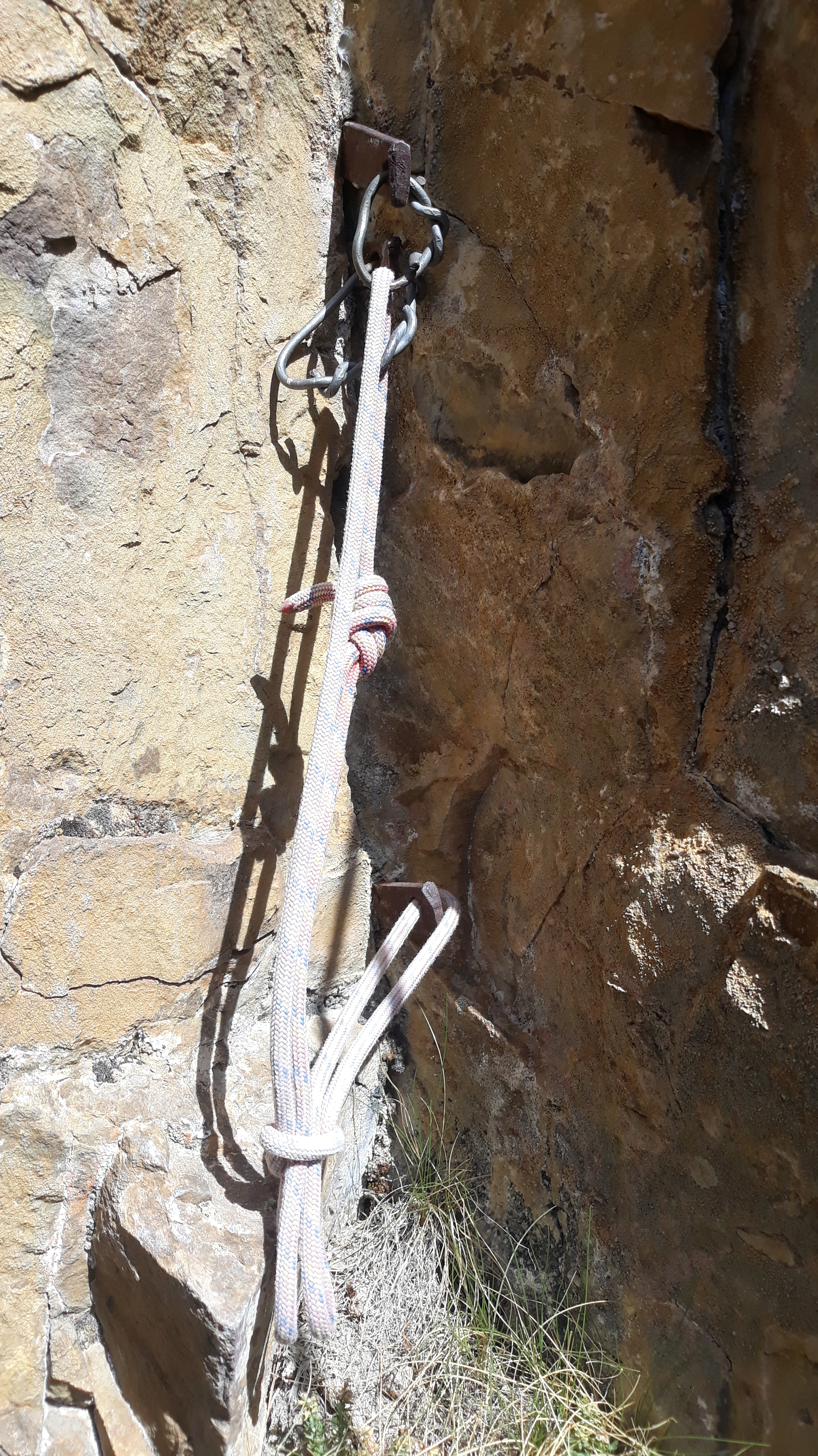 Escalamos el primer diedro (fino), encontramos un clavo. Después de superar el diedro seguimos a la izquierda en ligero descenso hasta encontrar un clavo con cordino (hay que bajar un poquito).
