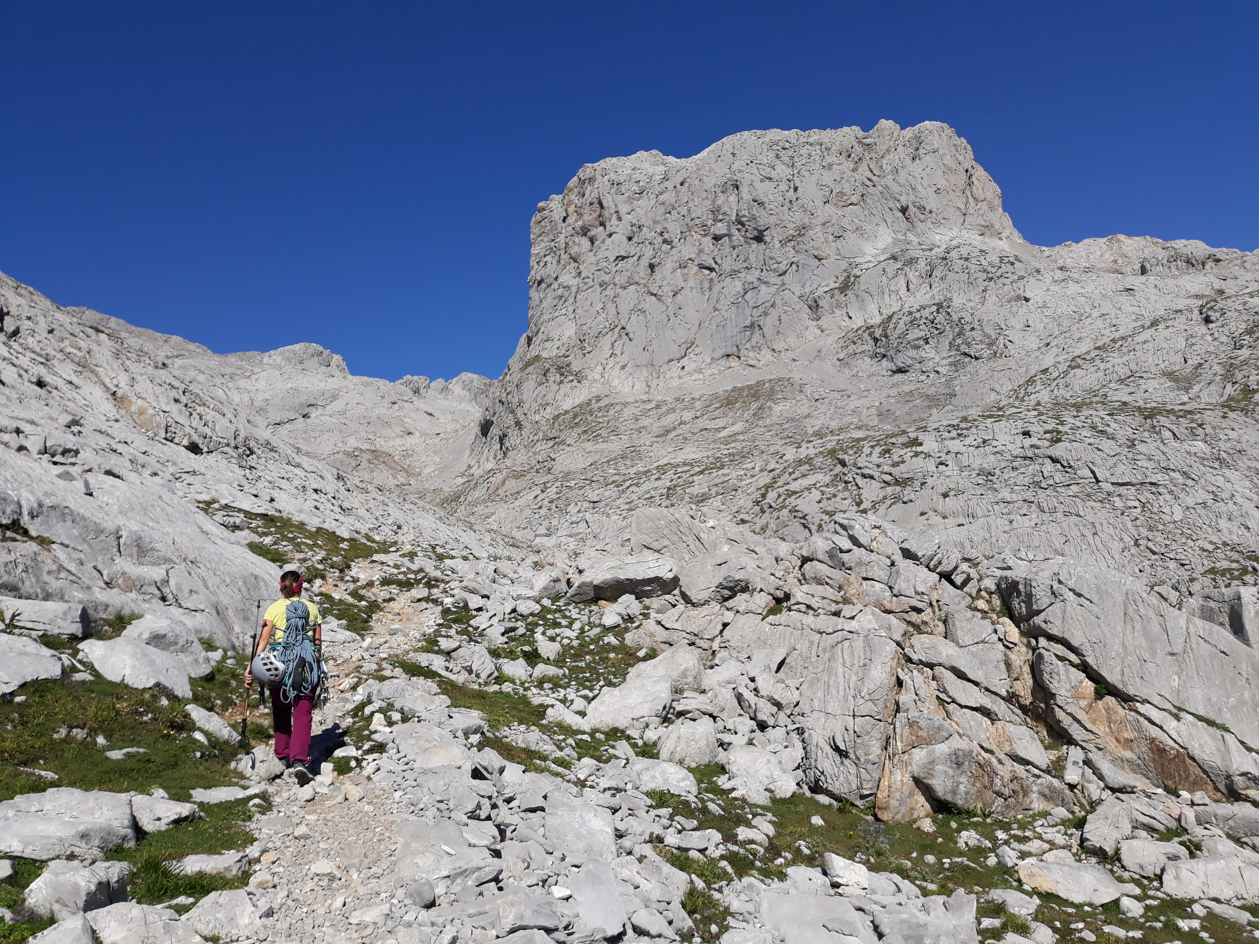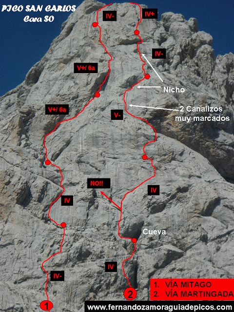 Aproximación: Desde el teleférico de fuente de seguiremos la pista que va hacia la Torre Altaiz (la pista de la izquierda, en lugar de tomar la que se dirige a Horcados Rojos y Cabaña Verónica), hasta remontar una colina que luego baja para volver a subir por la canal de San Luis. Nos encontraremos con una roca que tiene un punto rojo pintado, en ese punto torcer a la izquierda para después (30 metros) volver a girar a la derecha cuando nos encontremos con otra roca en la que se puede ver una flecha roja con el texto «Vega Liordes». A partir de ahí el sendero nos depositará en la base de la pared.