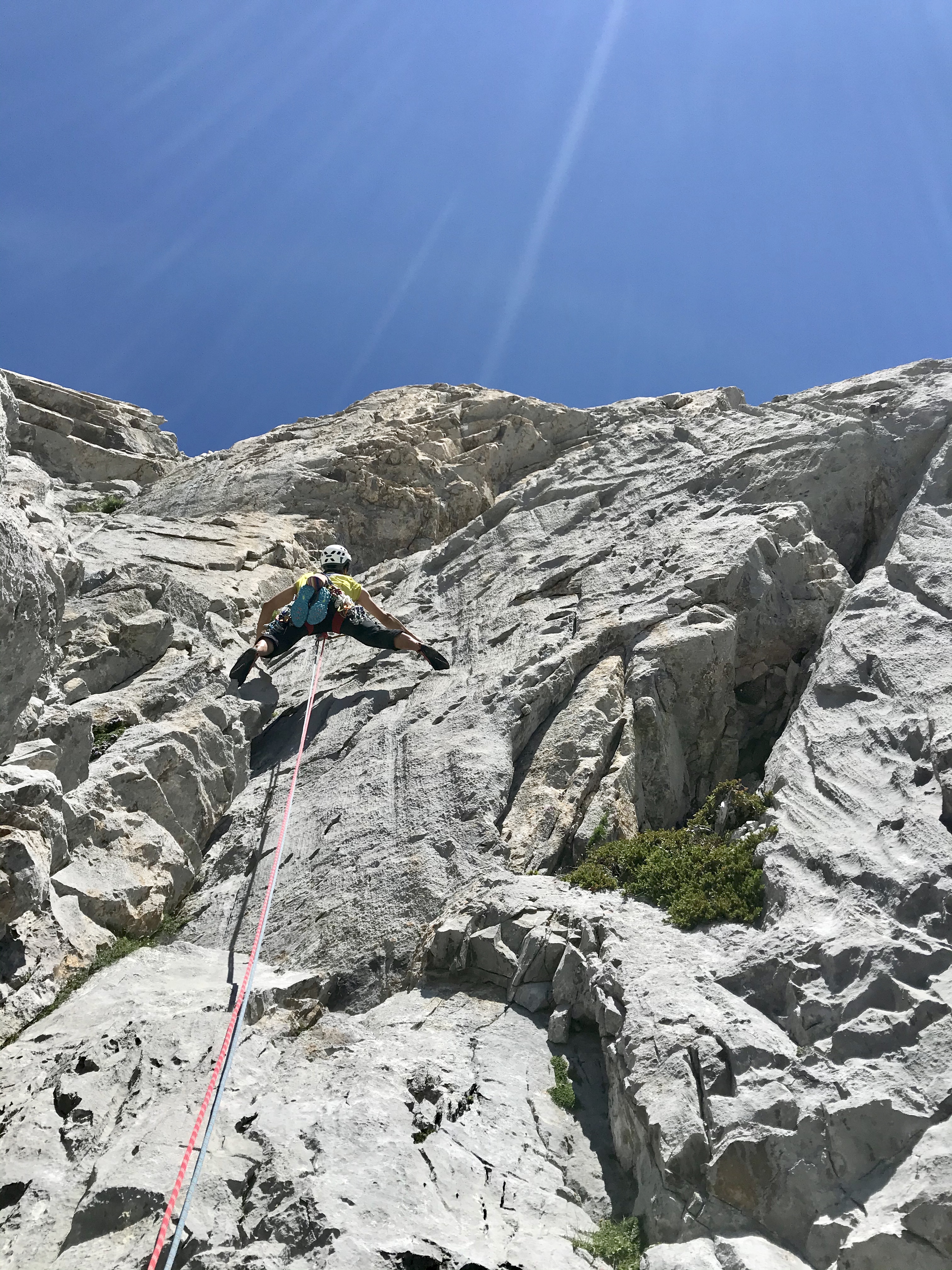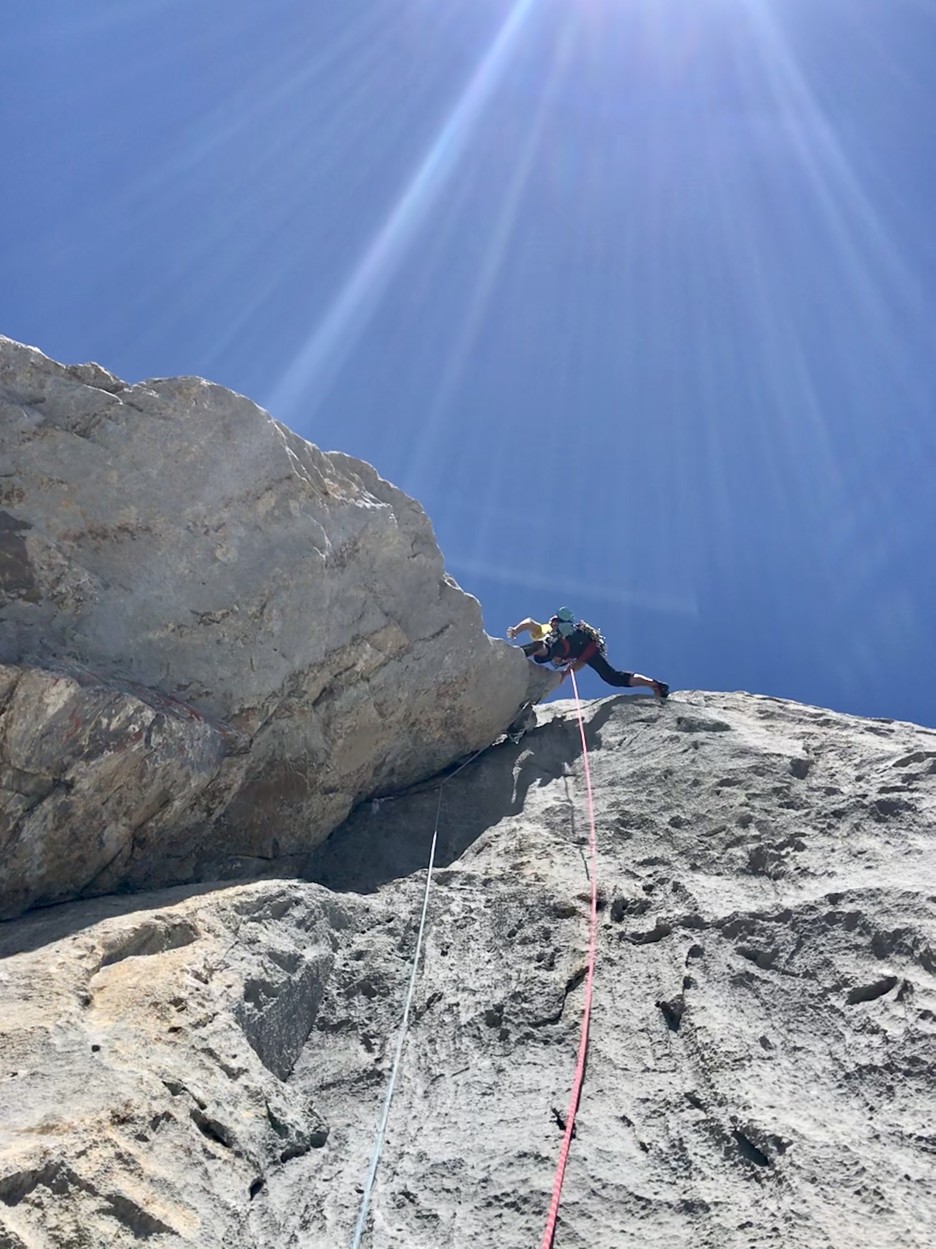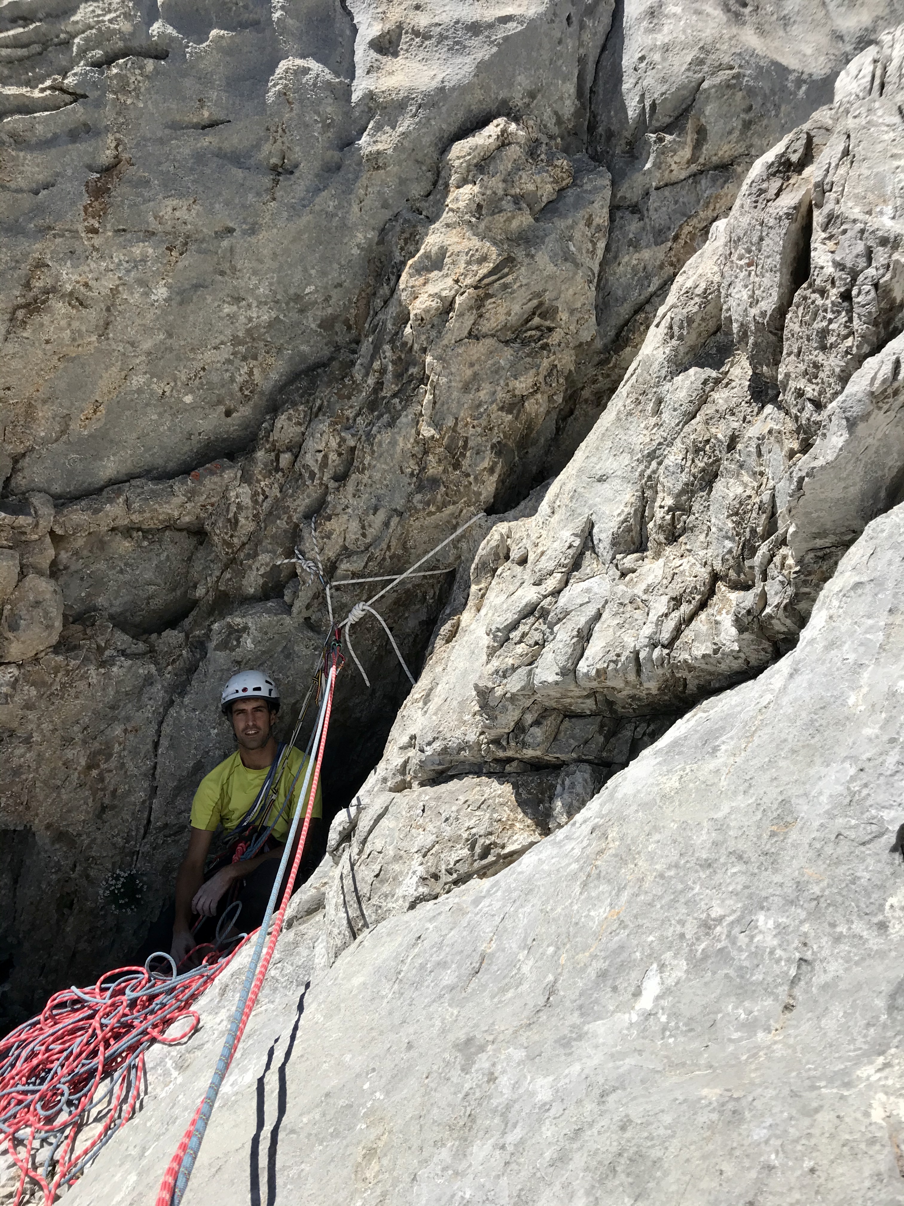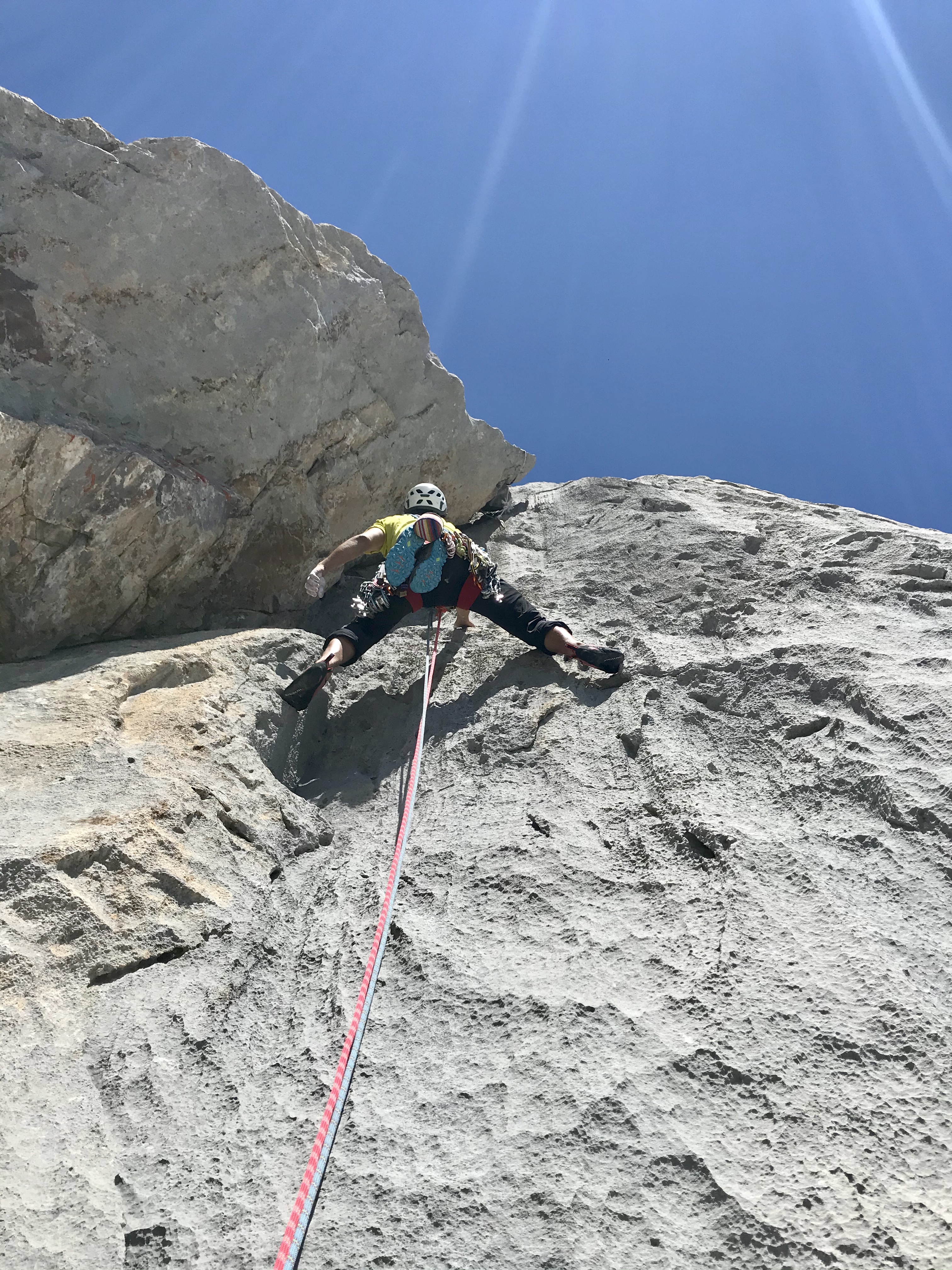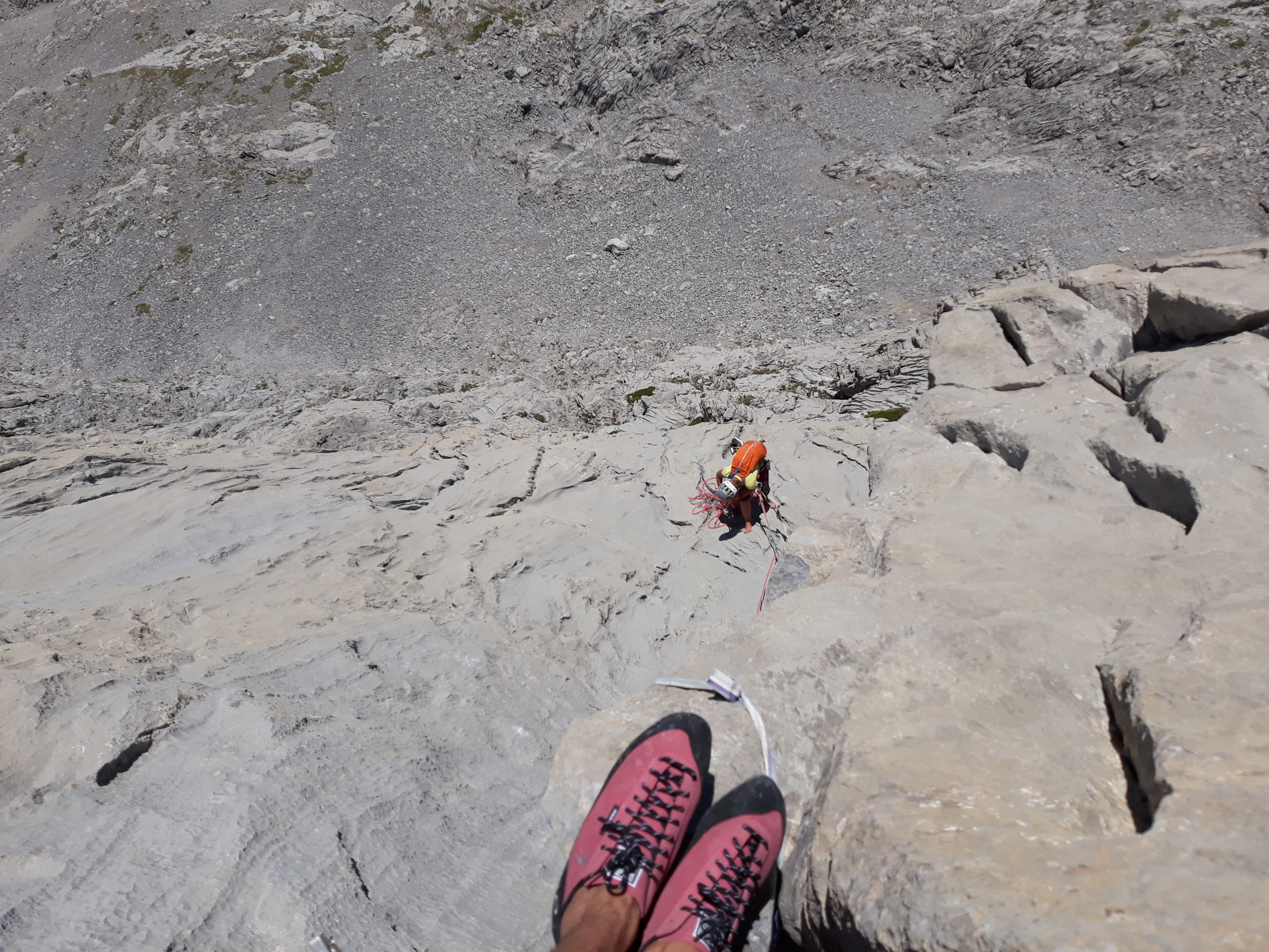 Largo 4, 6a: Avanzamos por la placa hasta un pitón salvador, para después afrontar la salida del gran «cuerno» de roca lazado con un cordino. Después avanzaremos todo lo que podamos hasta una repisa con roca suelta, donde montaremos la reunión laceando un gran bloque.