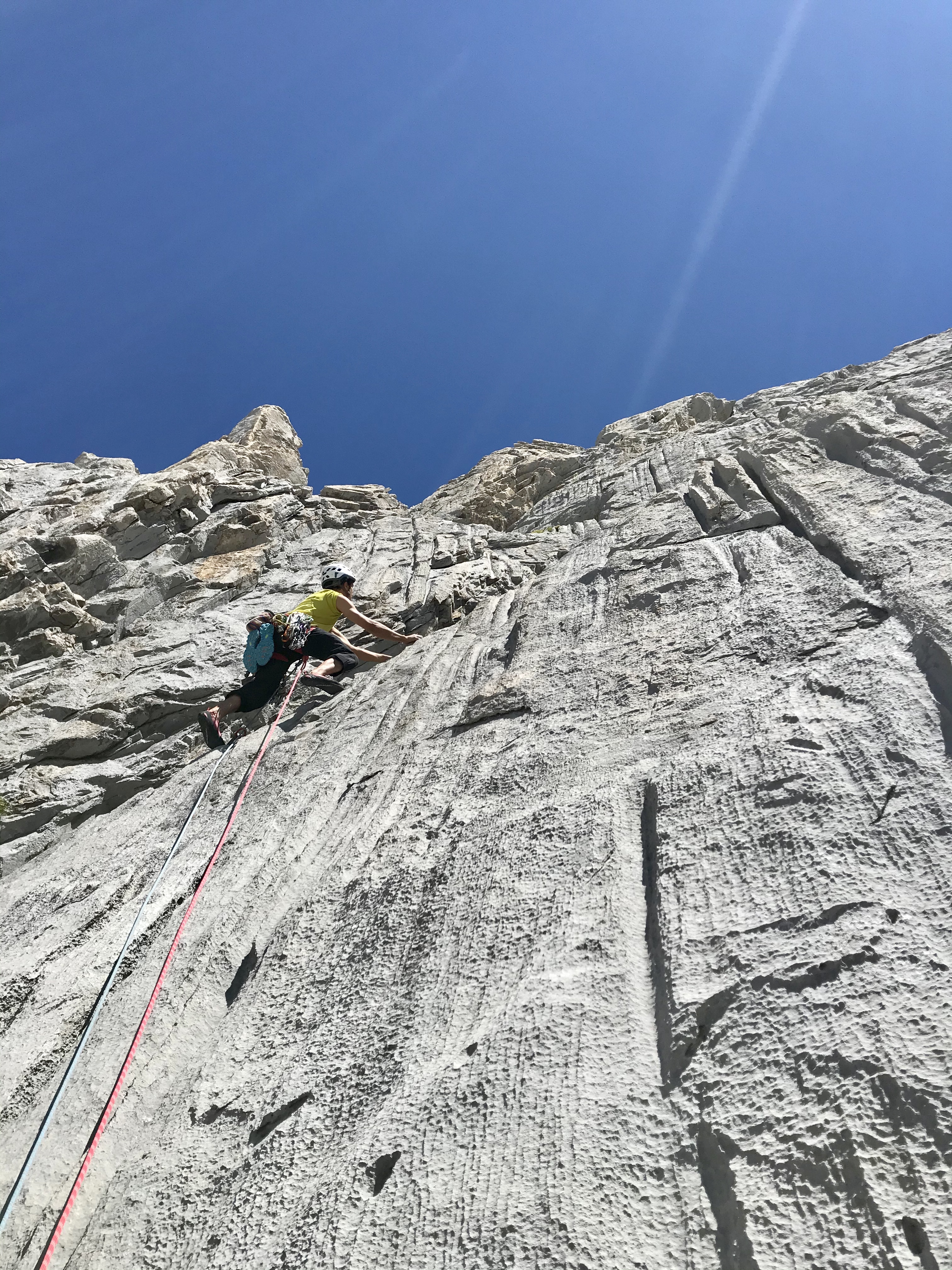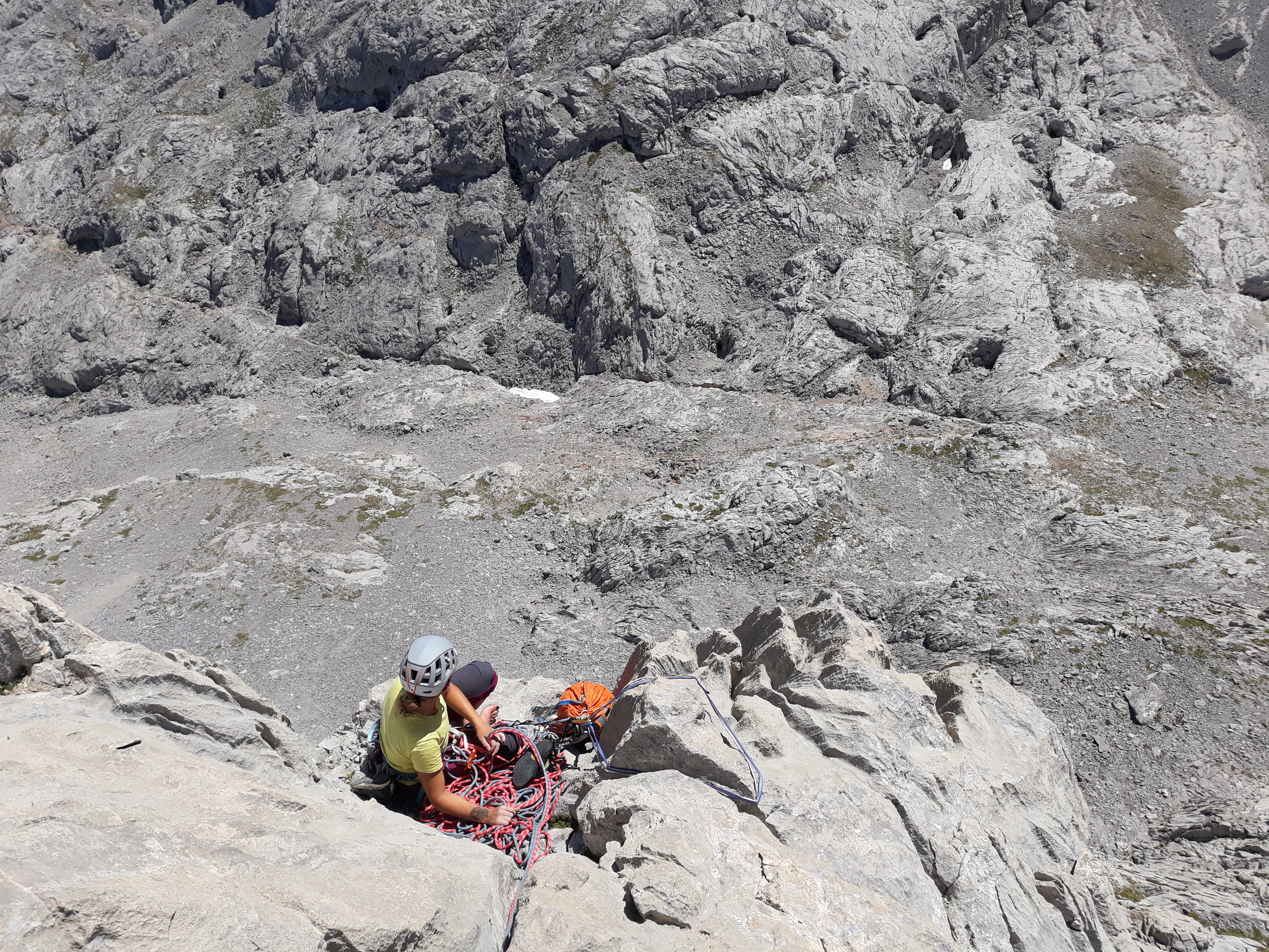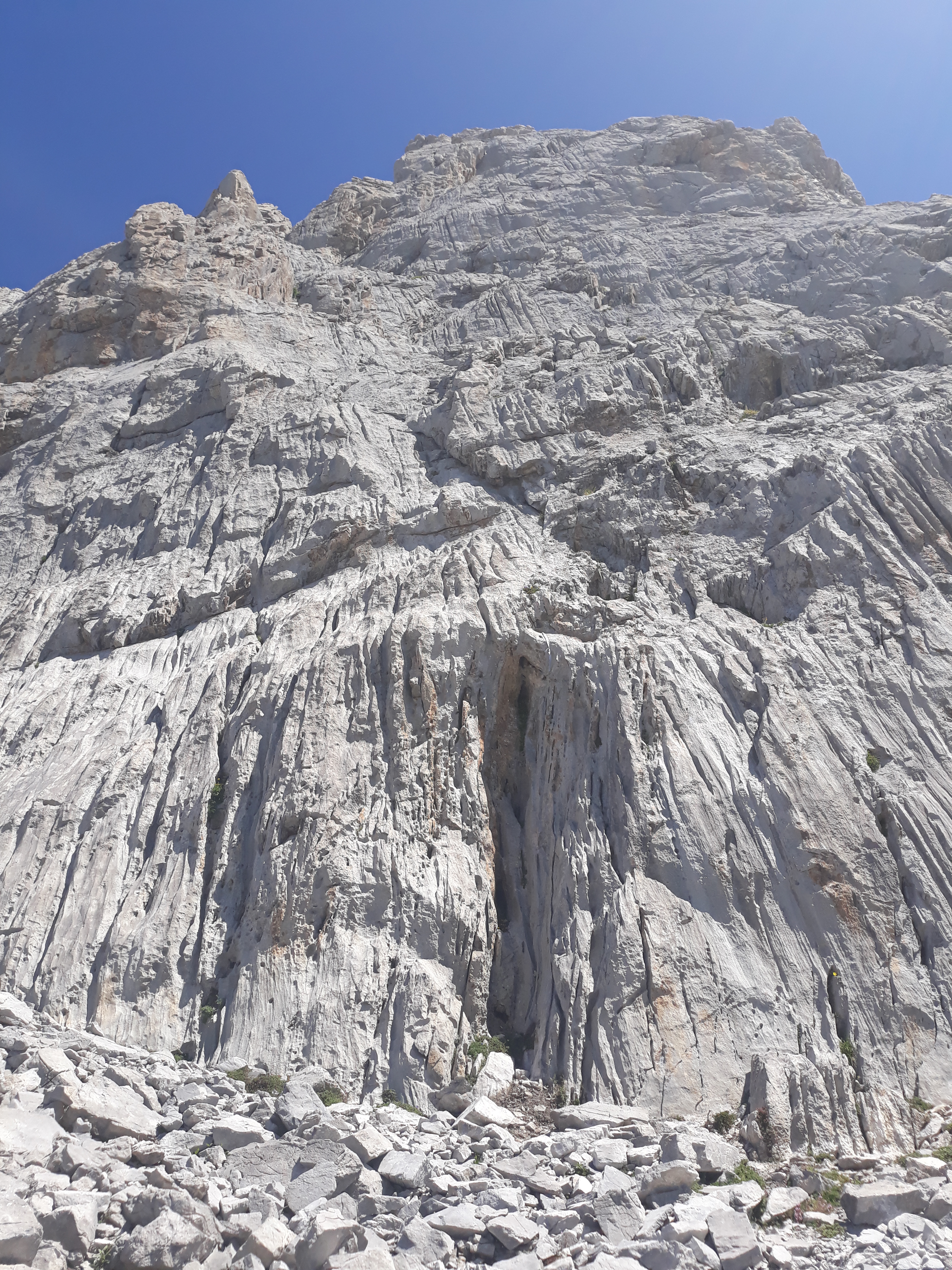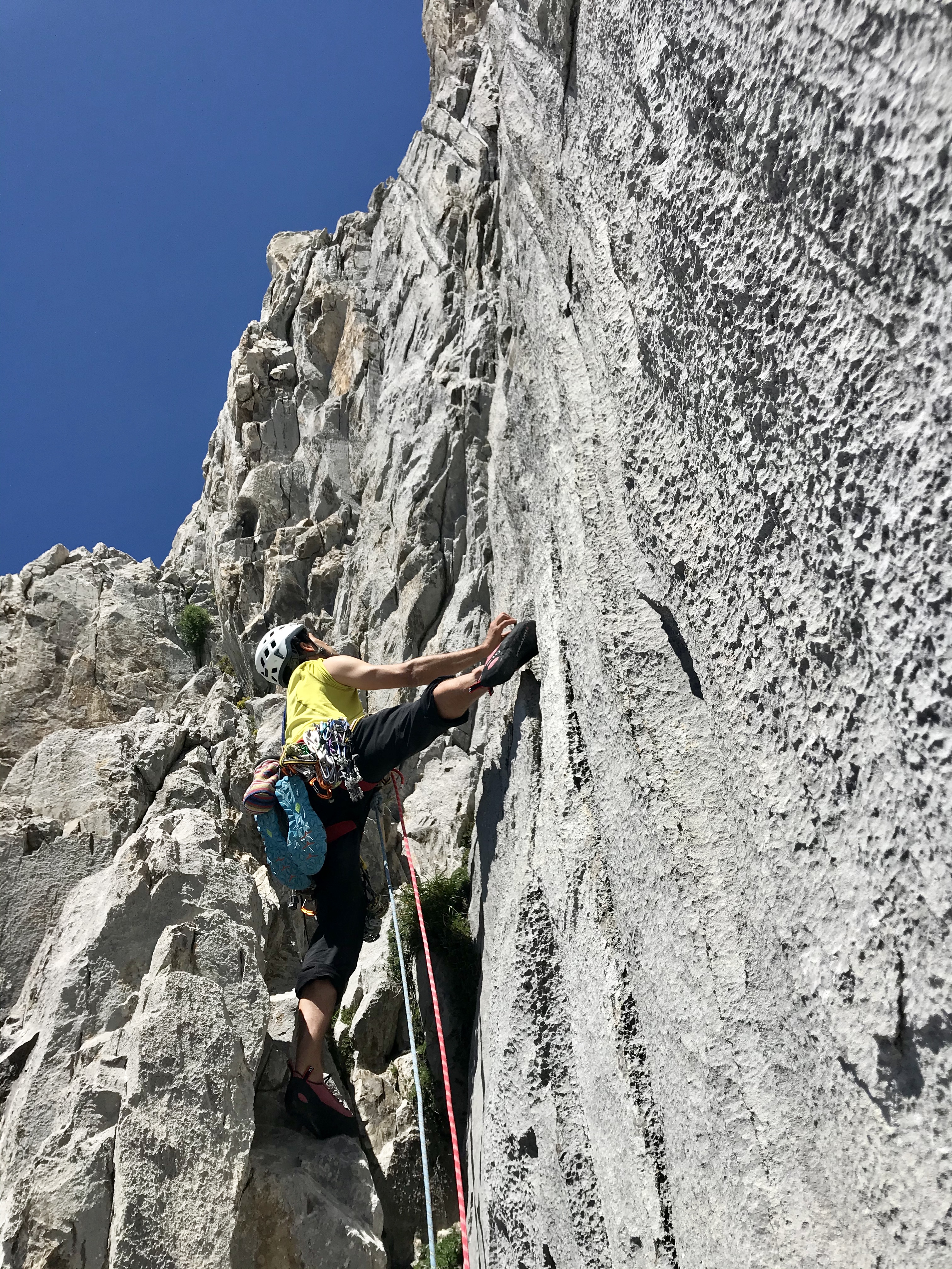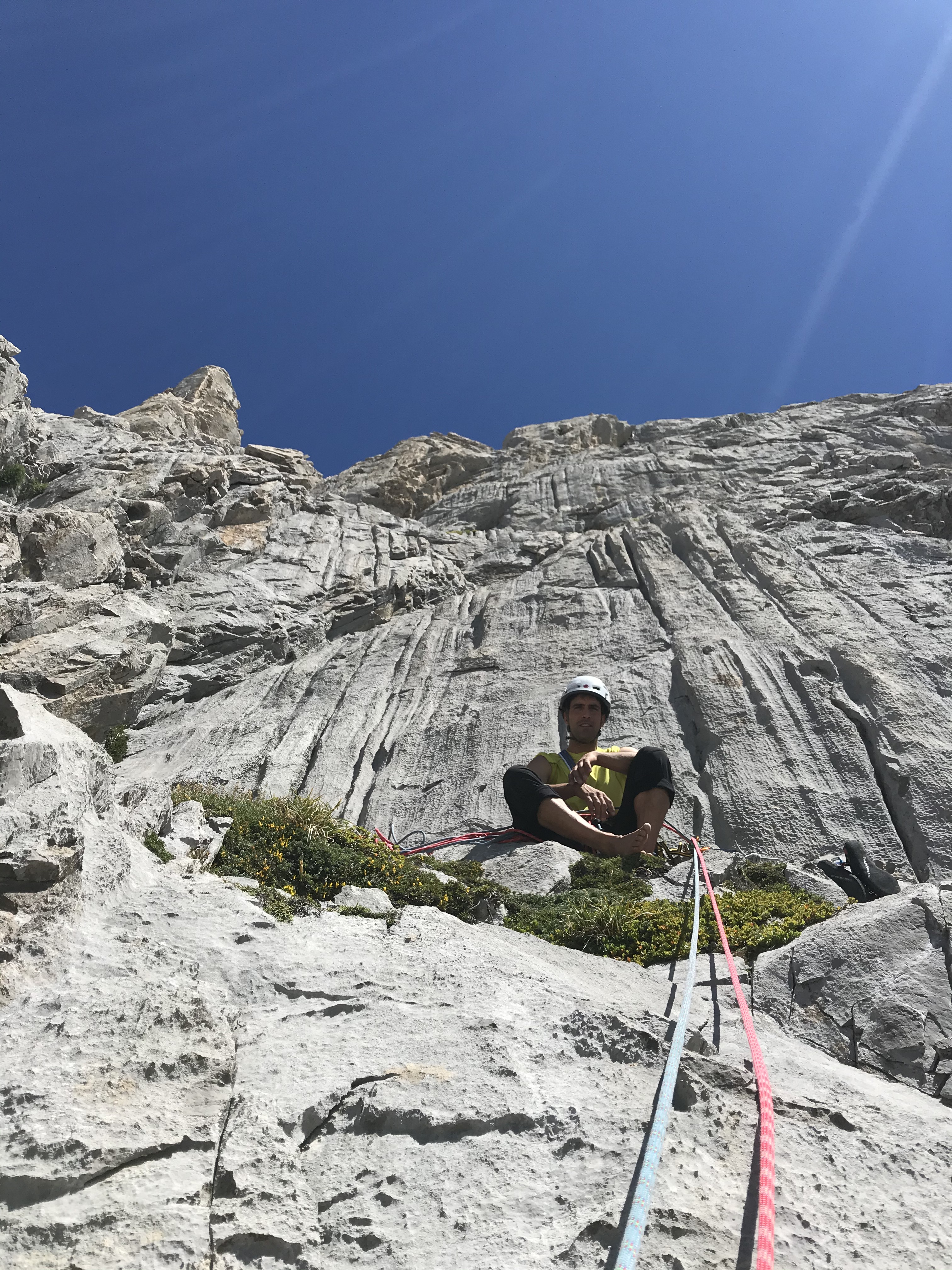 Largo 4, 6a: Avanzamos por la placa hasta un pitón salvador, para después afrontar la salida del gran «cuerno» de roca lazado con un cordino. Después avanzaremos todo lo que podamos hasta una repisa con roca suelta, donde montaremos la reunión laceando un gran bloque.