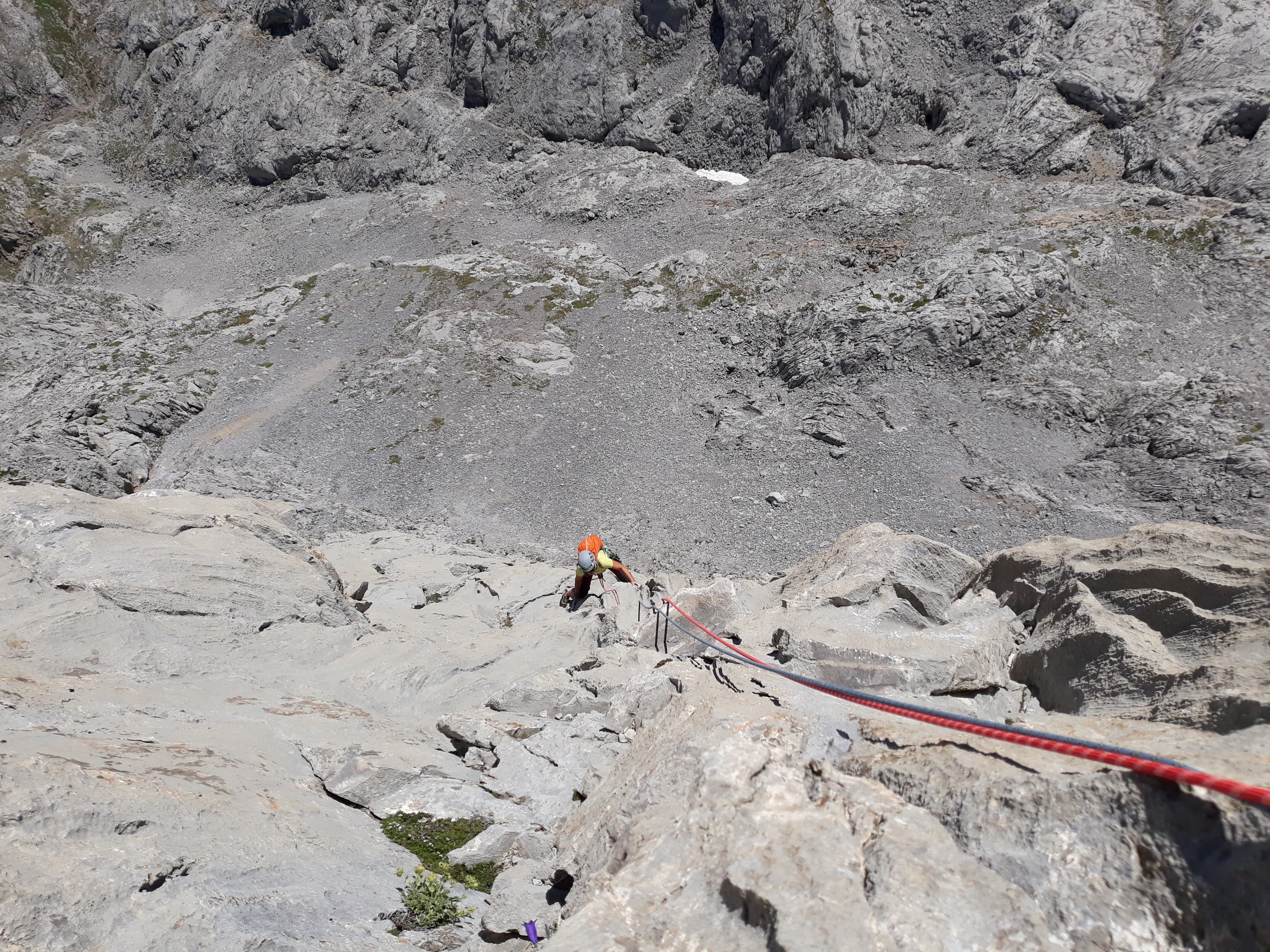 Largo 3, 6a: Largo 5 estrellas. Escalamos por el diedro hasta que nos obliga a hacer una travesía por la placa (puente de roca con cordino), para después meternos otra vez en el diedro hasta alcanzar un clavo. De ahí hasta la reunión (2 clavos) en la repisa. Increíble.