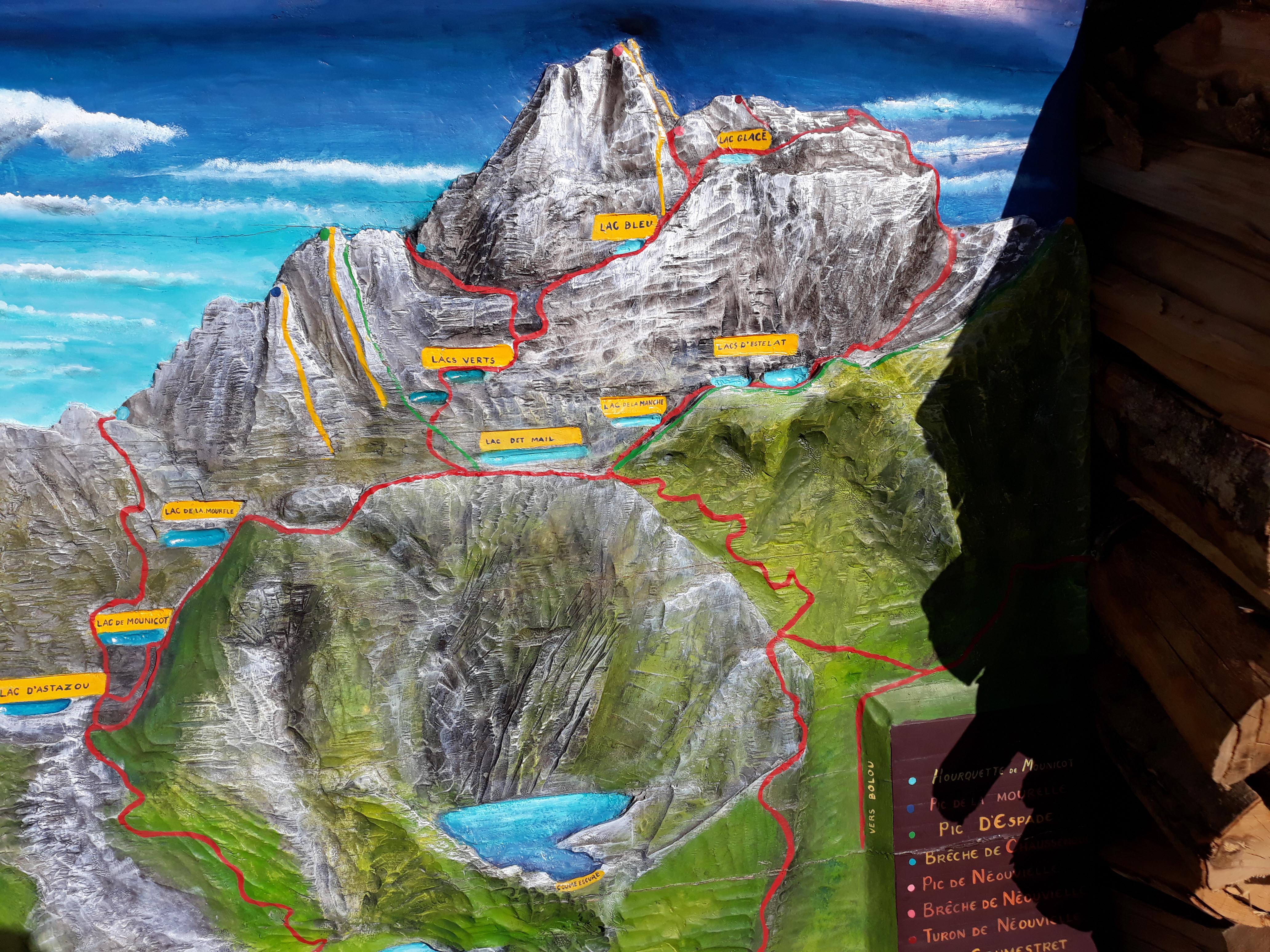En este cuadro que encontramos en la terraza del refugio, se pueden apreciar las líneas en amarillo que indican el Petit y el Grand Pic D´Espade: