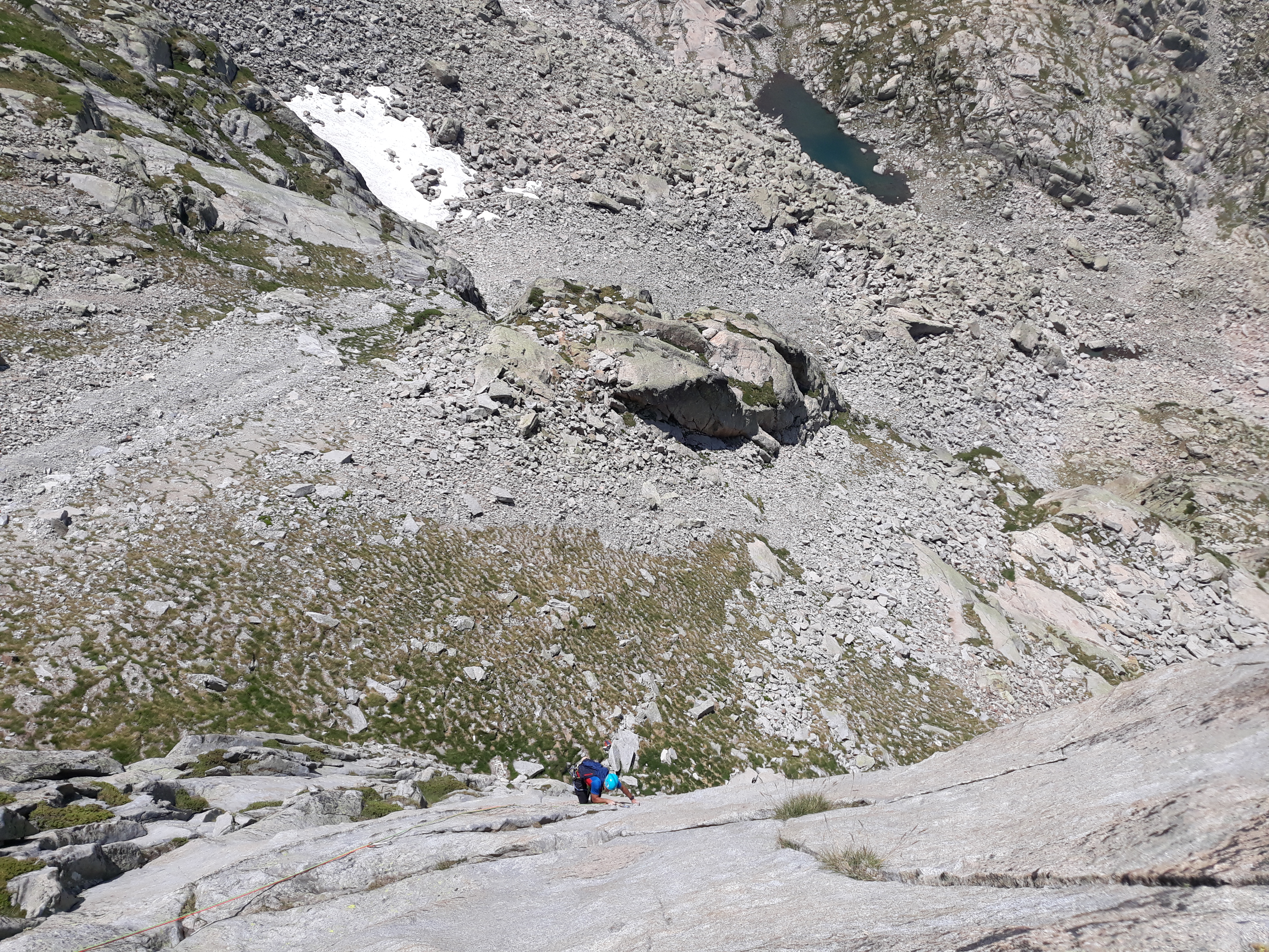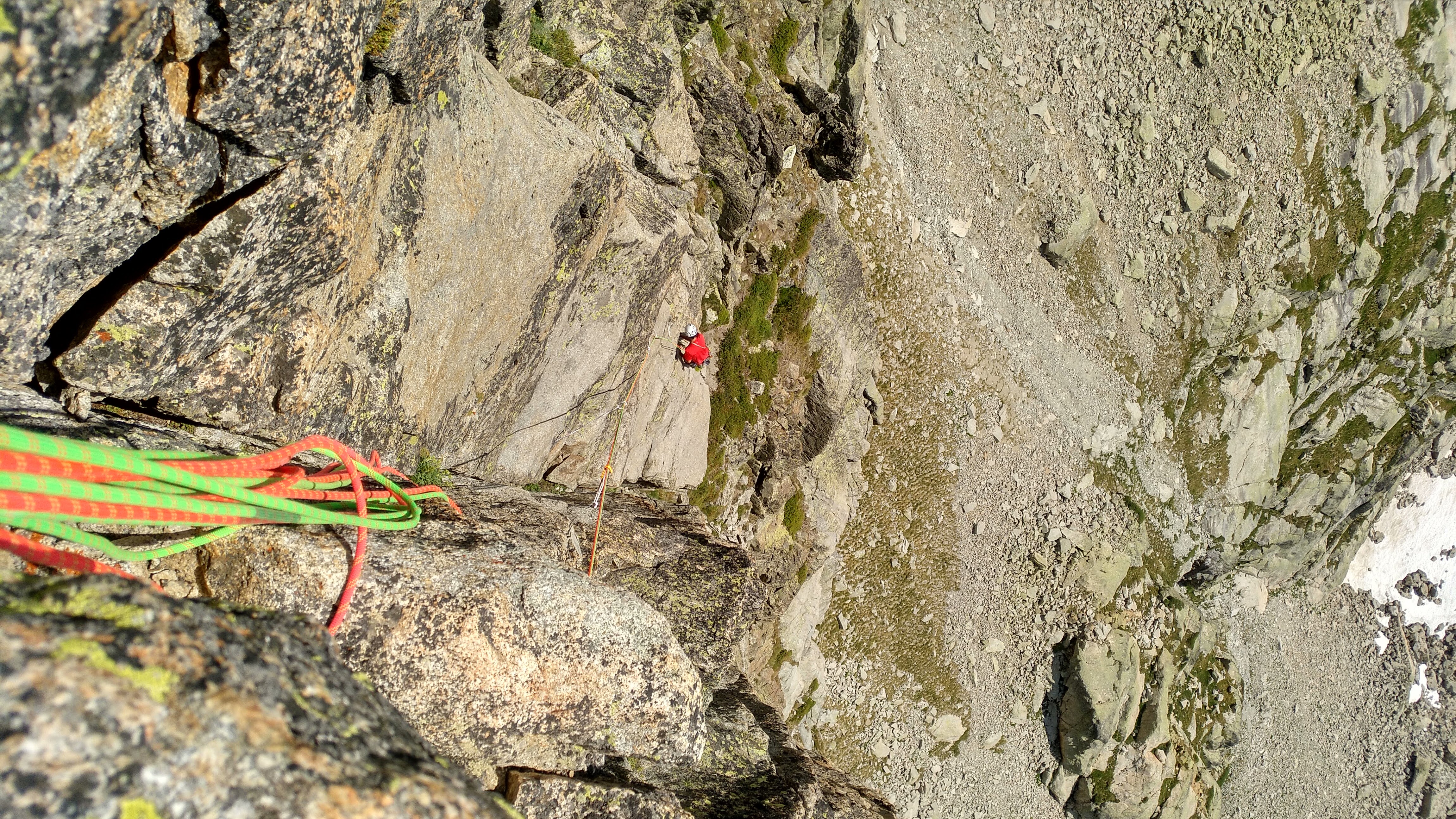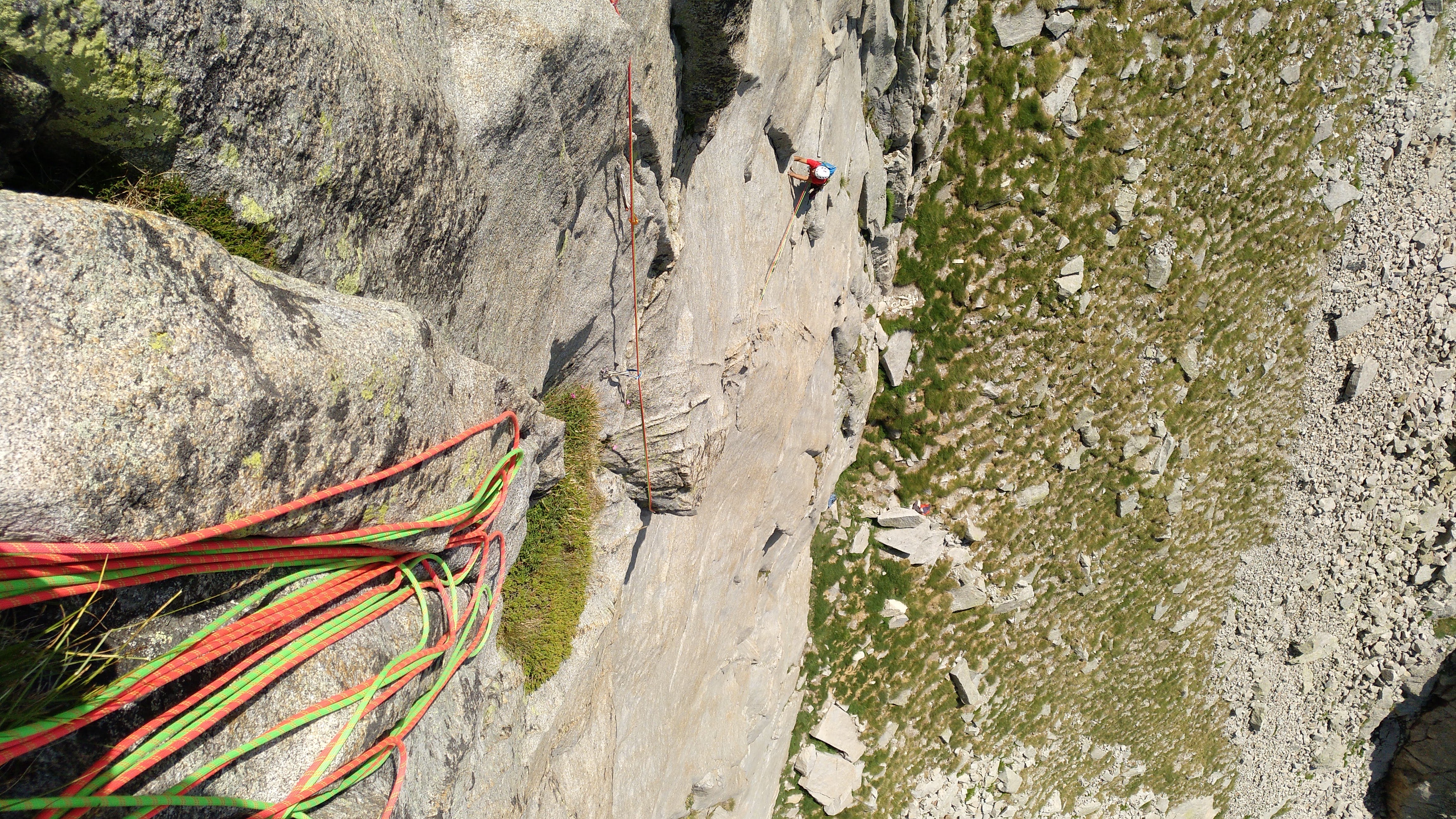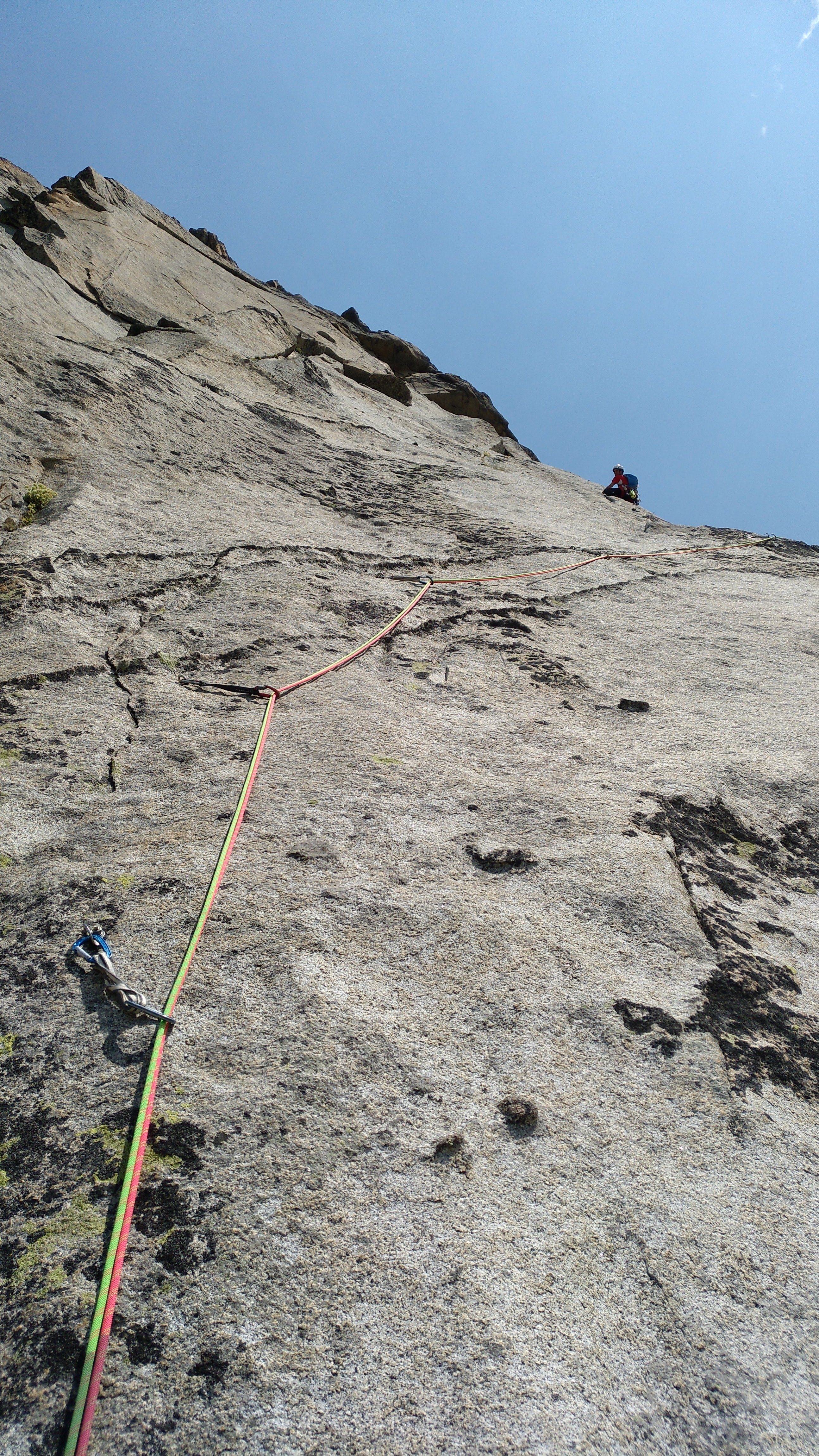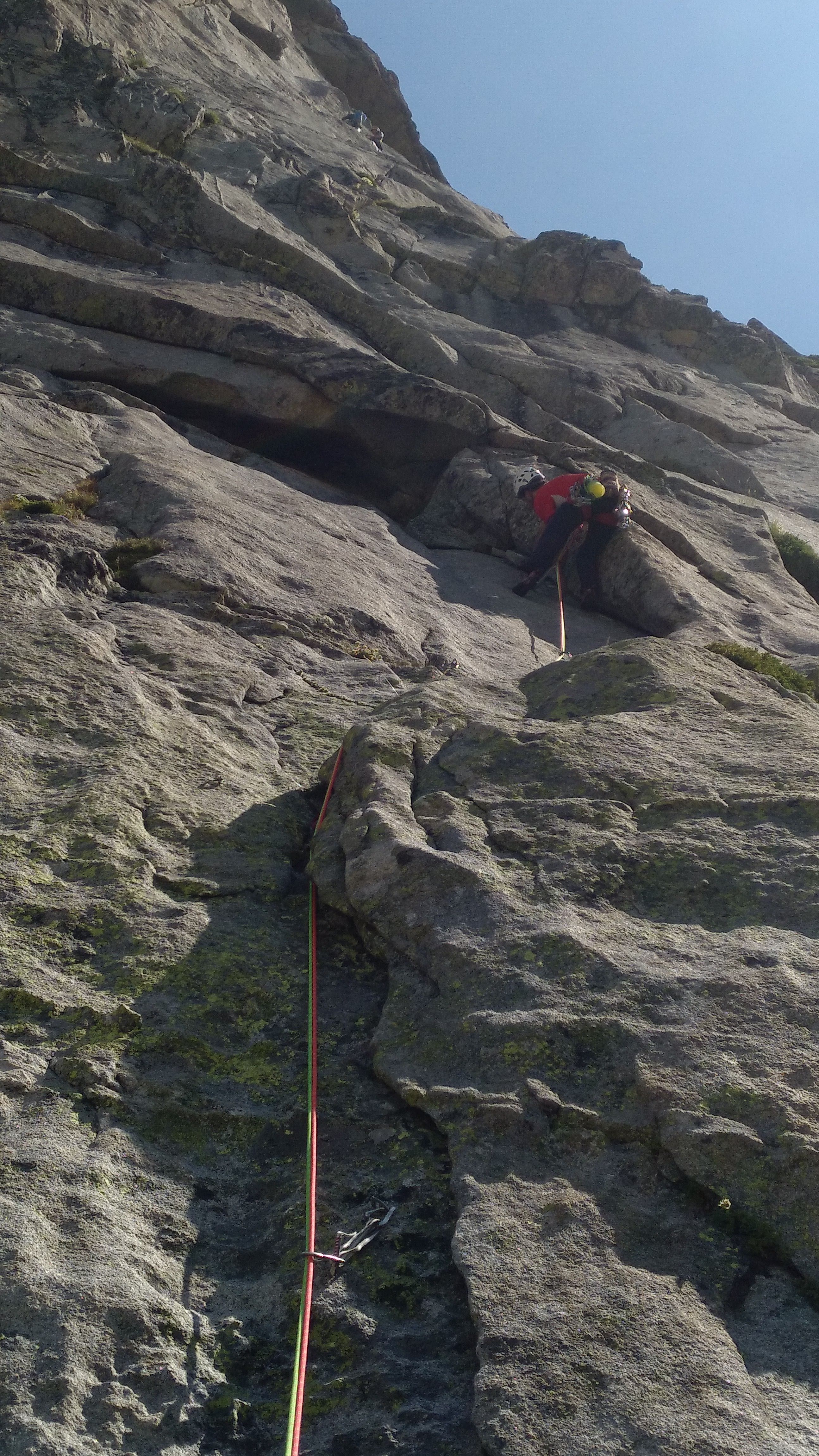 Largo 6, 6a+: Lo que pensábamos que sería el típico largo «de salida» nos sorprendió siendo un largo muy bueno, de buscar el itinerario y con alguna sorpresita. Una guinda final perfecta para una vía muy muy buena.