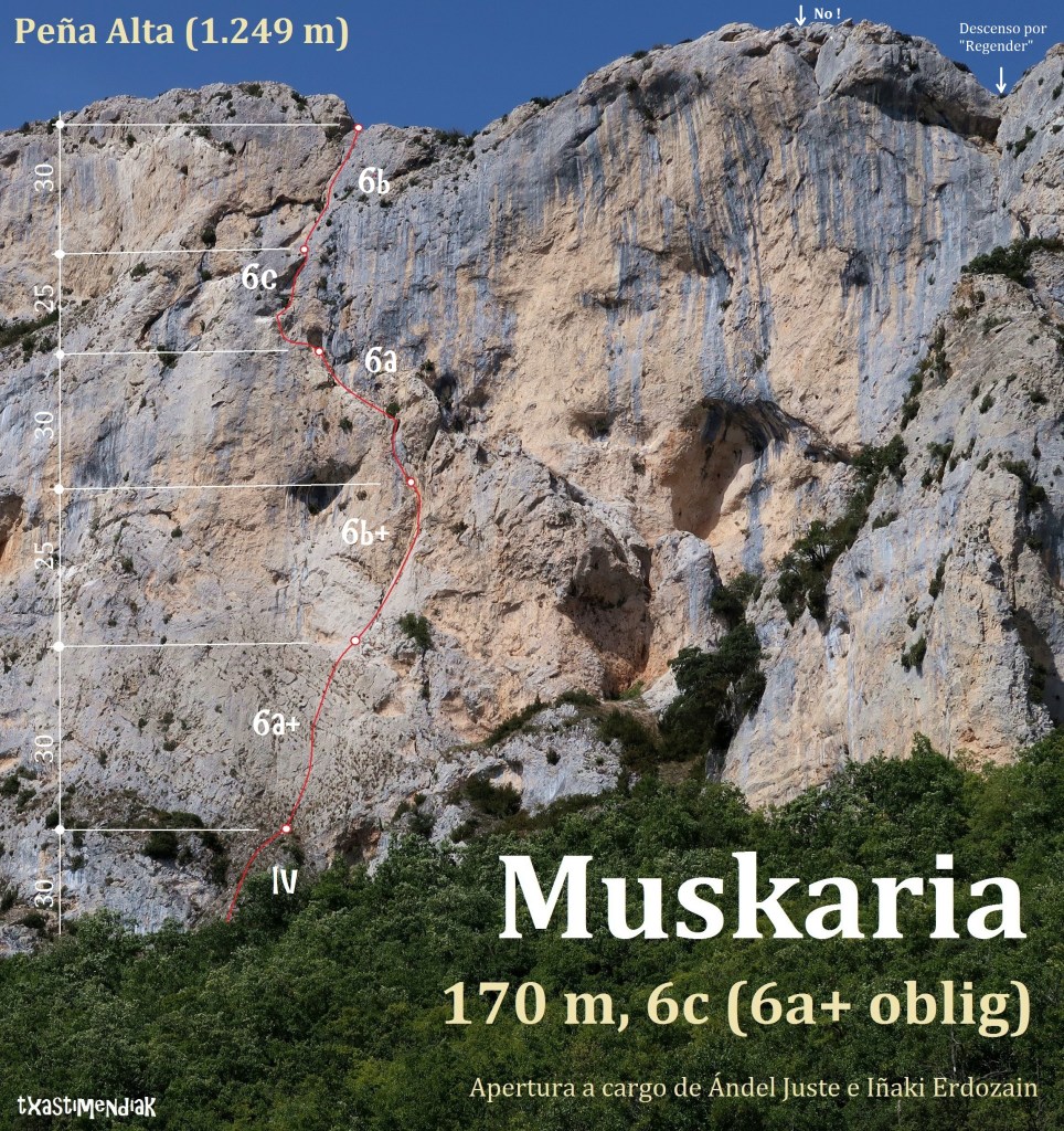 La vía Muskaria es una vía alpina, semiequipada , en la que curiosamente el largo más «complicado» es el segundo, cotado de 6a+ pero con roca mala y de difícil protección, donde habrá que templar los nervios y navegar bien. El resto de la vía, surca diedros alternando roca amarilla pinchuda con tramos de roca rota.