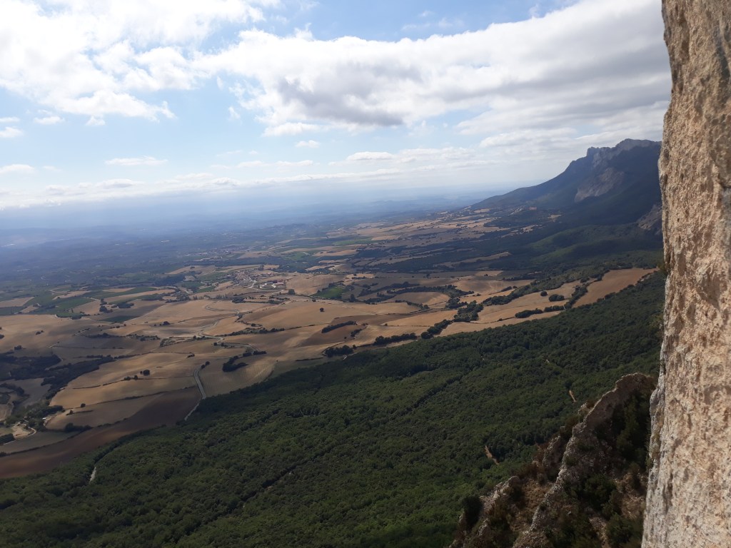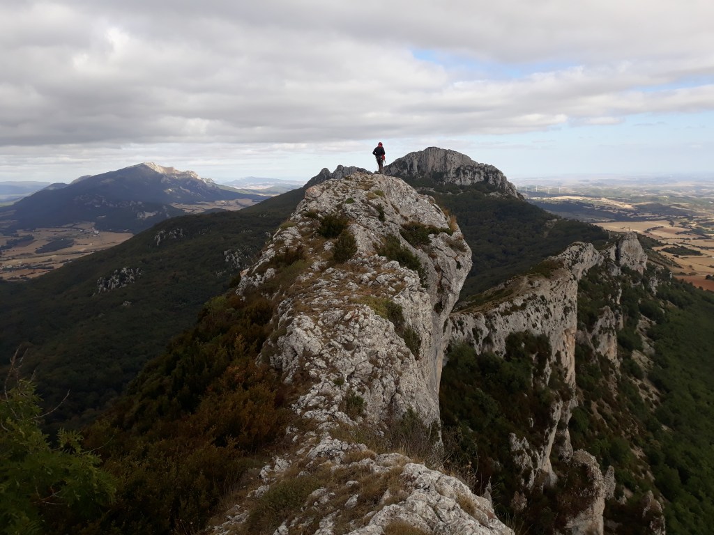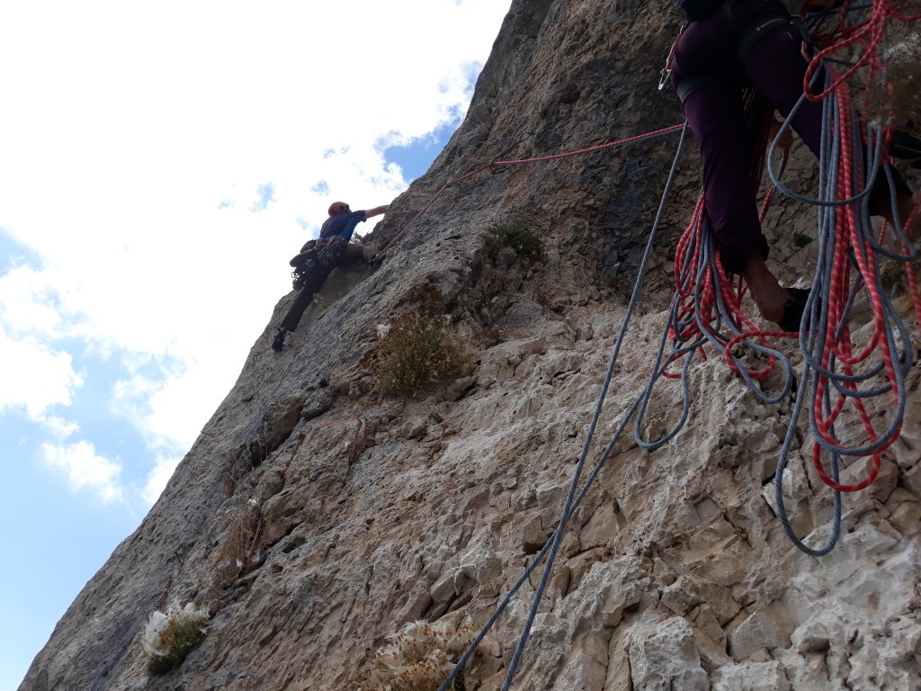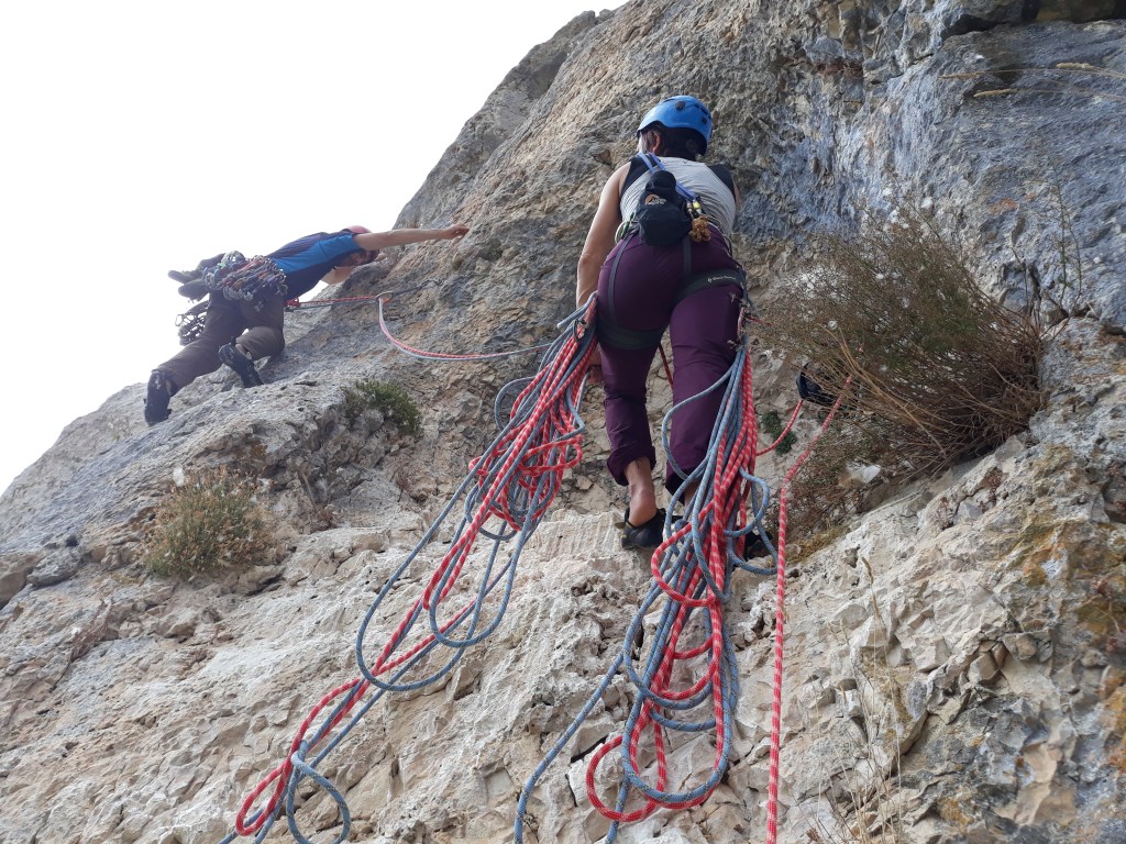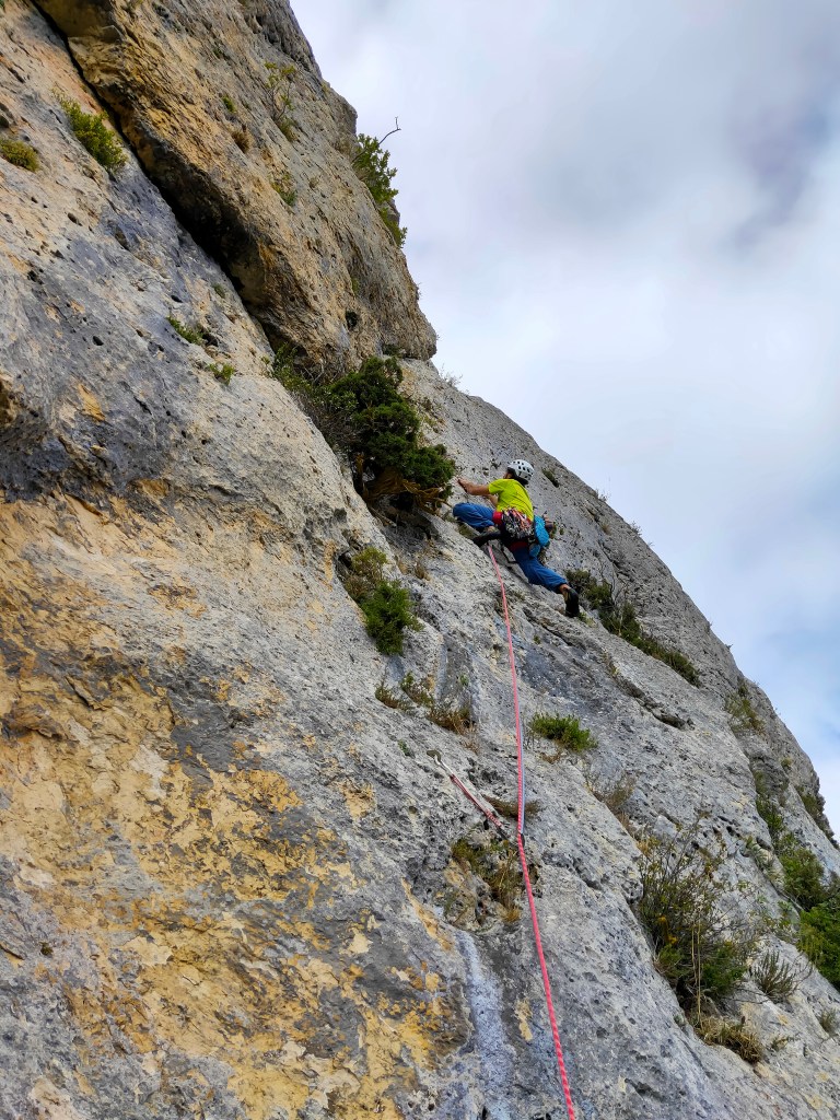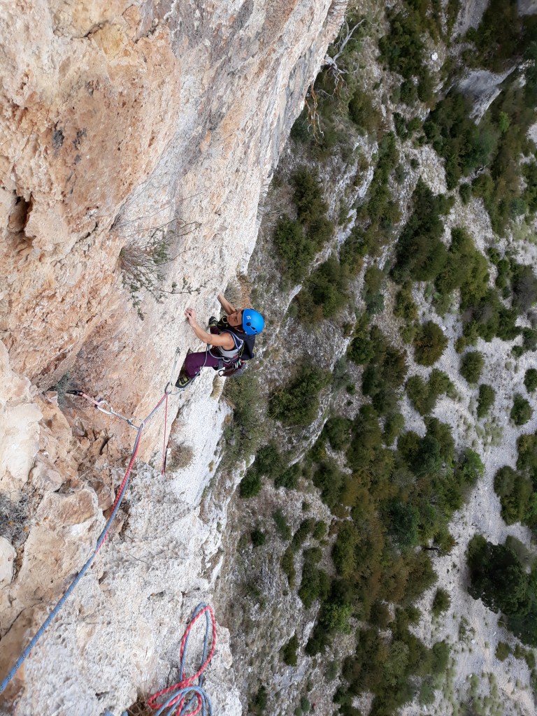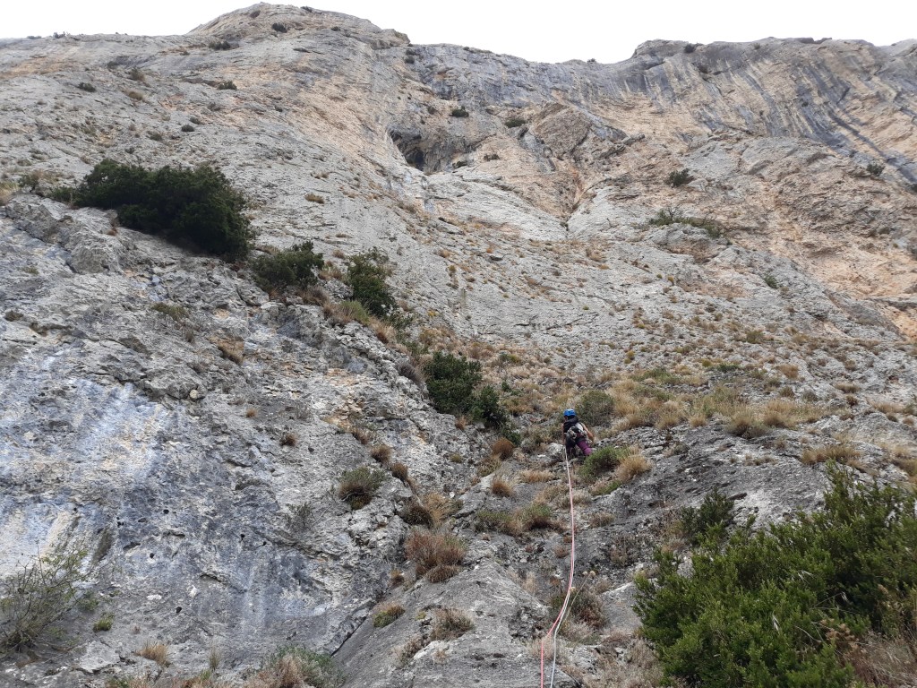 Largo 2, 6a+ (30 metros): Muro tieso de roca delicada y mucho arbustillo al principio. Hay que escalar con temple ya que cuesta ver dónde instalar las protecciones. Hay posibilidad de lacear 2 puentes de roca, pero están sin cordino. Después encontraremos 2 bolts y la siguiente reunión a mano derecha, a los pies de un diedro.