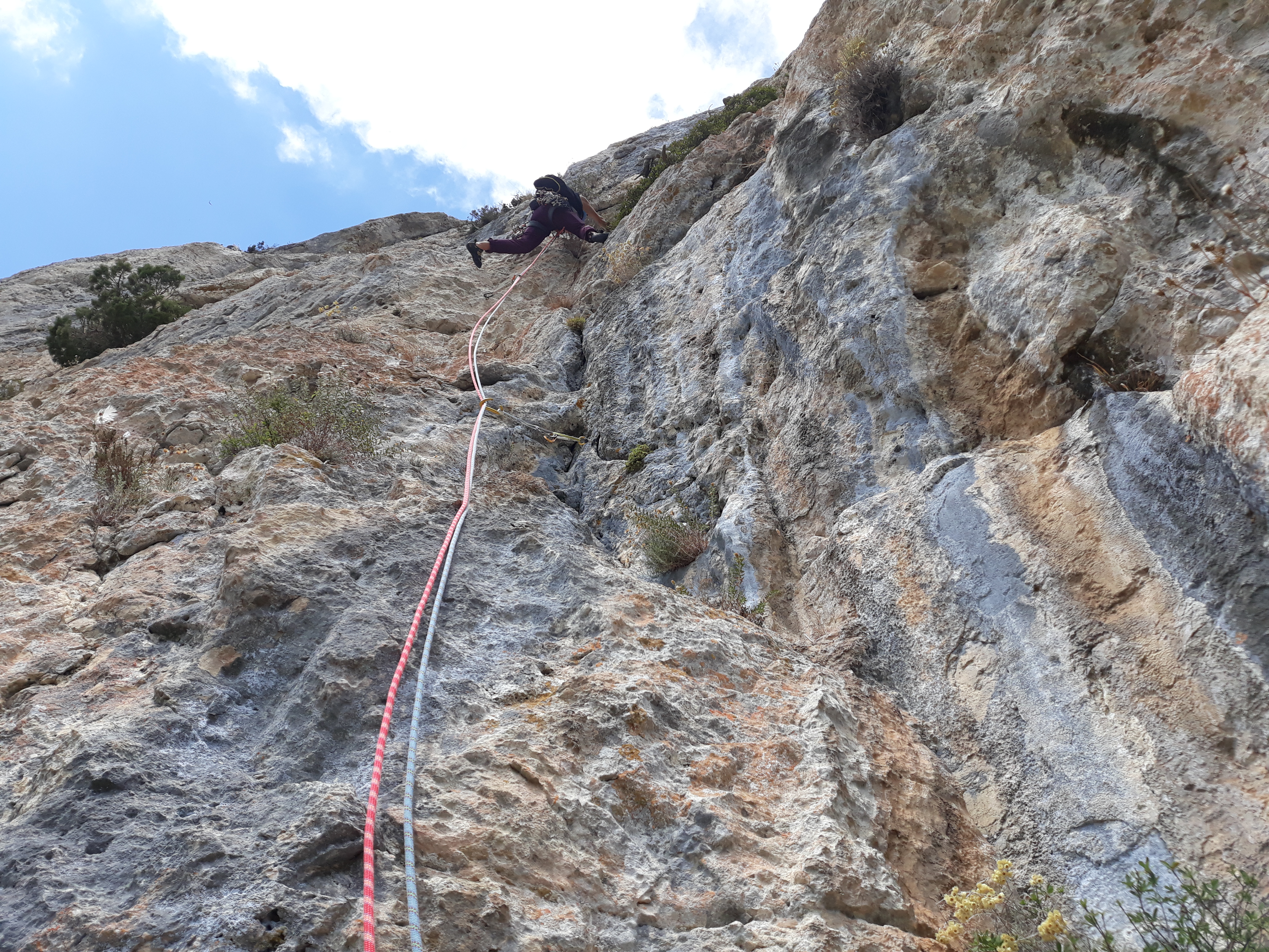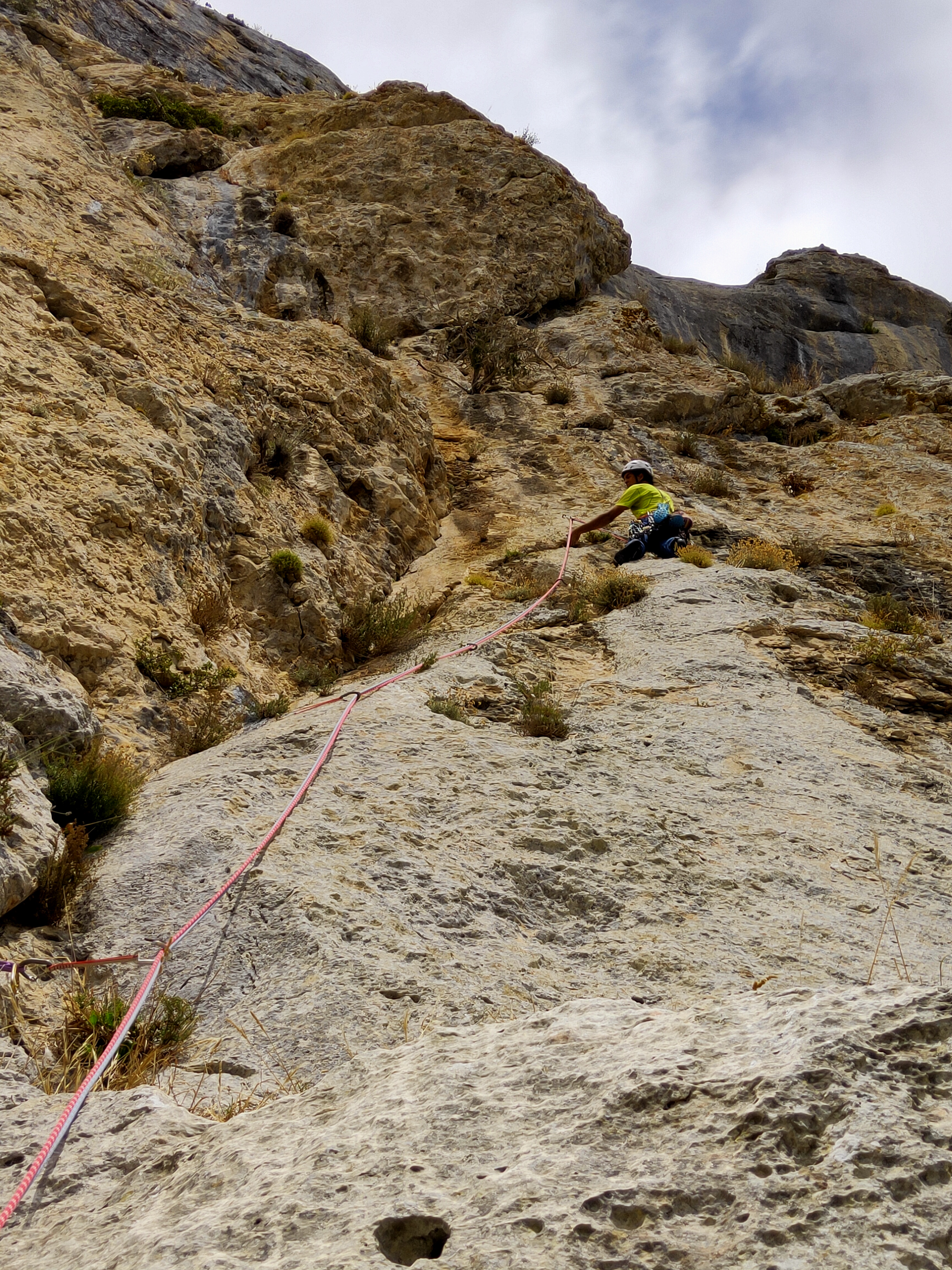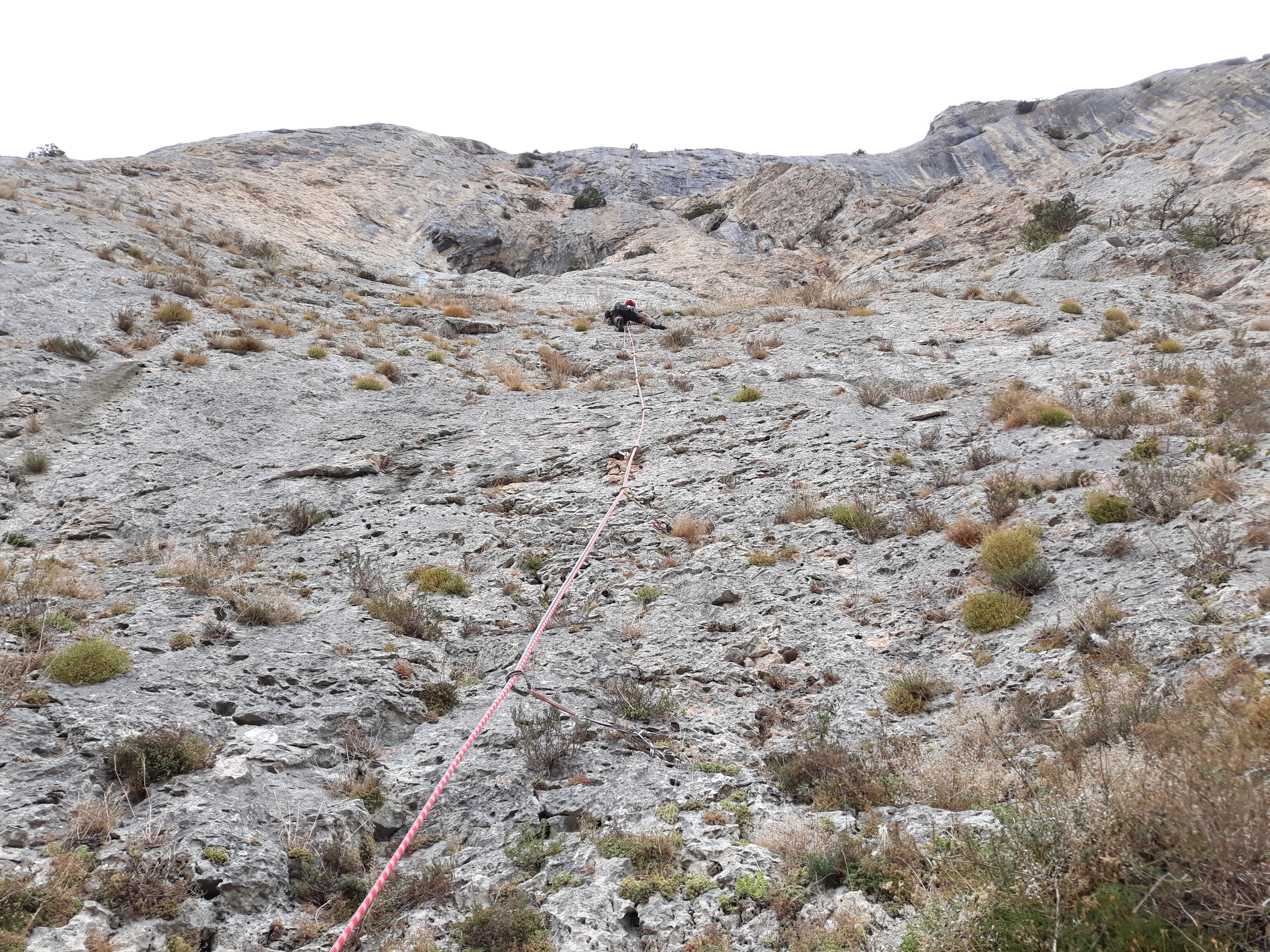 Largo 2, 6a+ (30 metros): Muro tieso de roca delicada y mucho arbustillo al principio. Hay que escalar con temple ya que cuesta ver dónde instalar las protecciones. Hay posibilidad de lacear 2 puentes de roca, pero están sin cordino. Después encontraremos 2 bolts y la siguiente reunión a mano derecha, a los pies de un diedro.