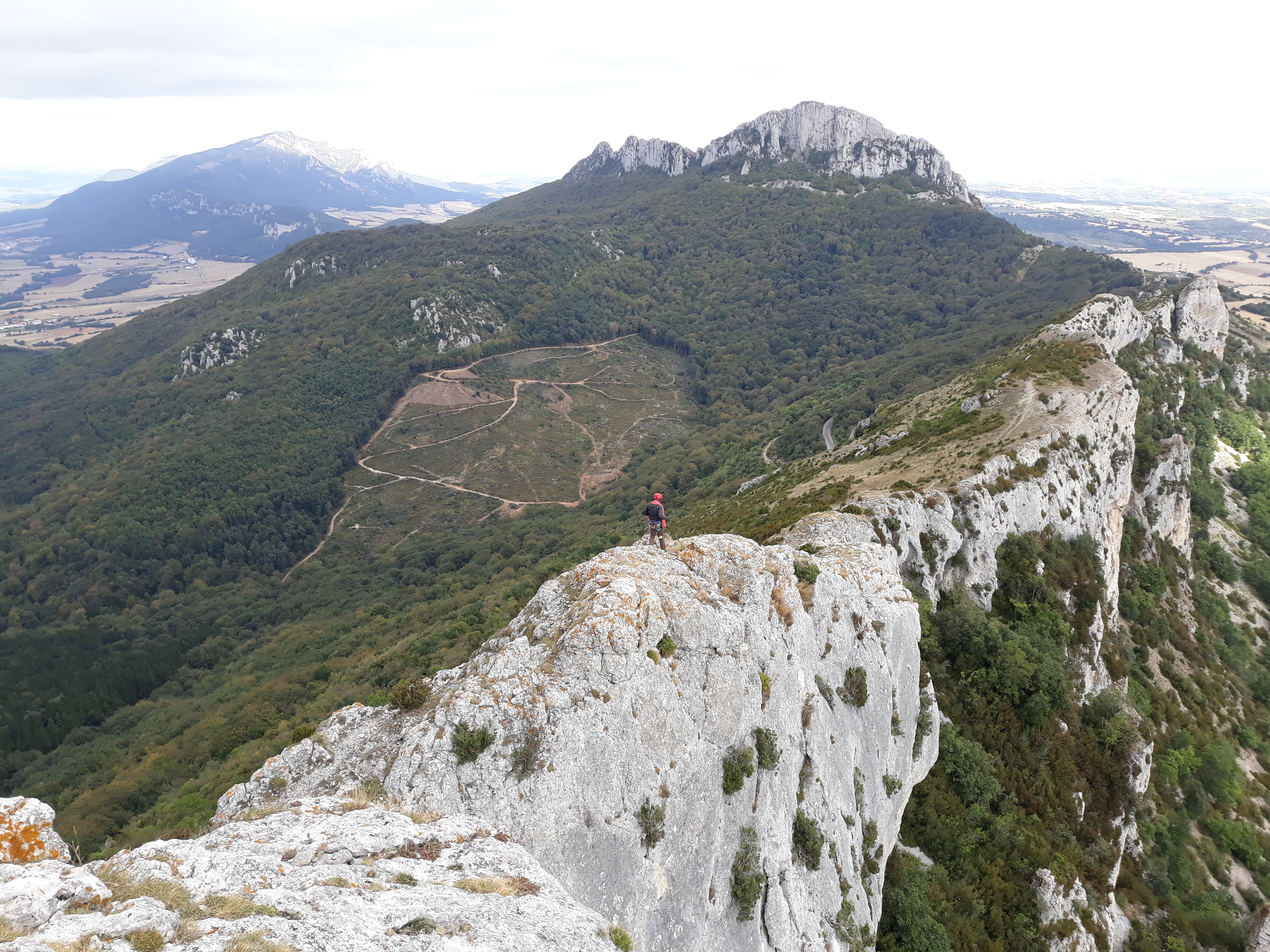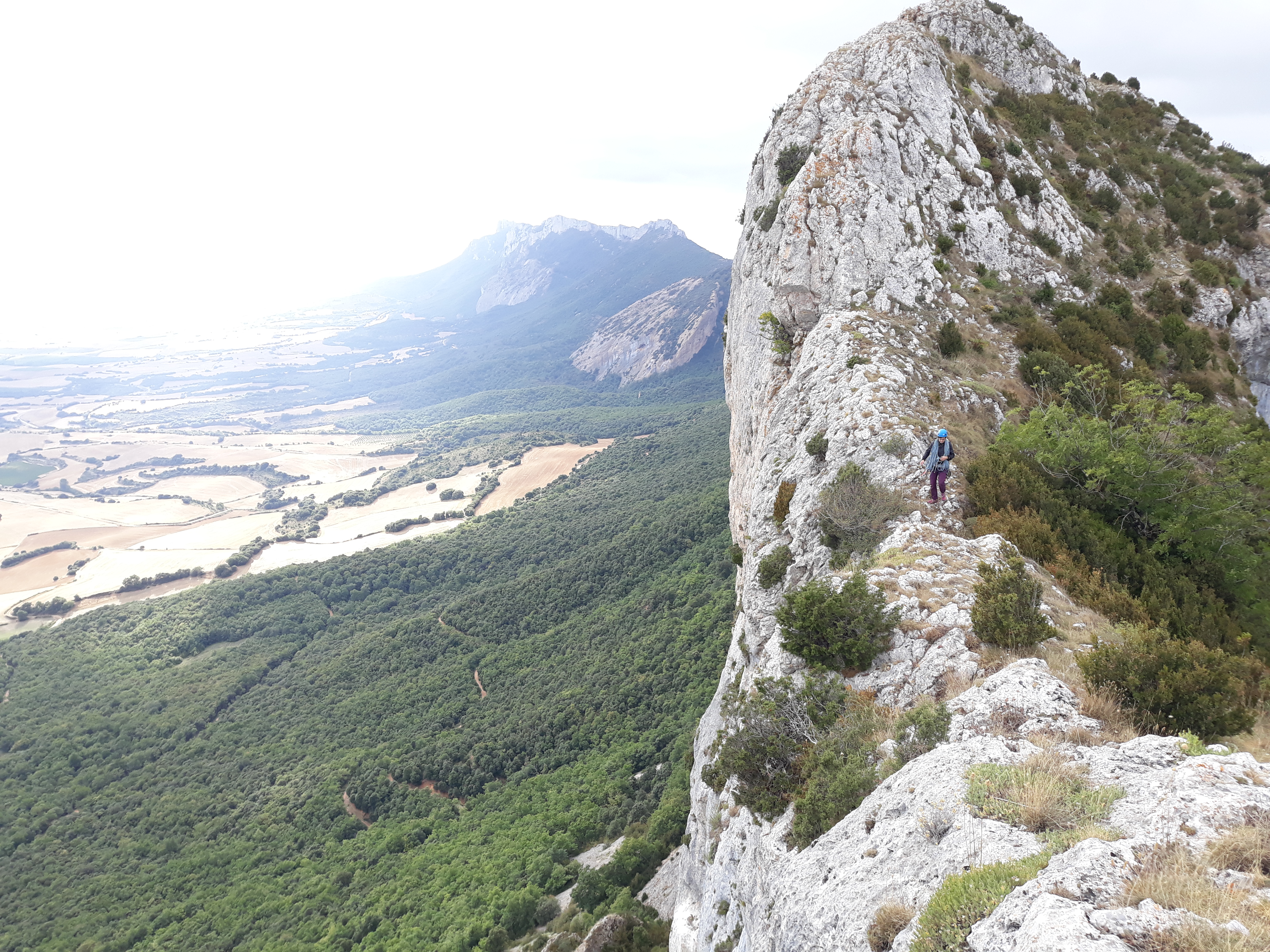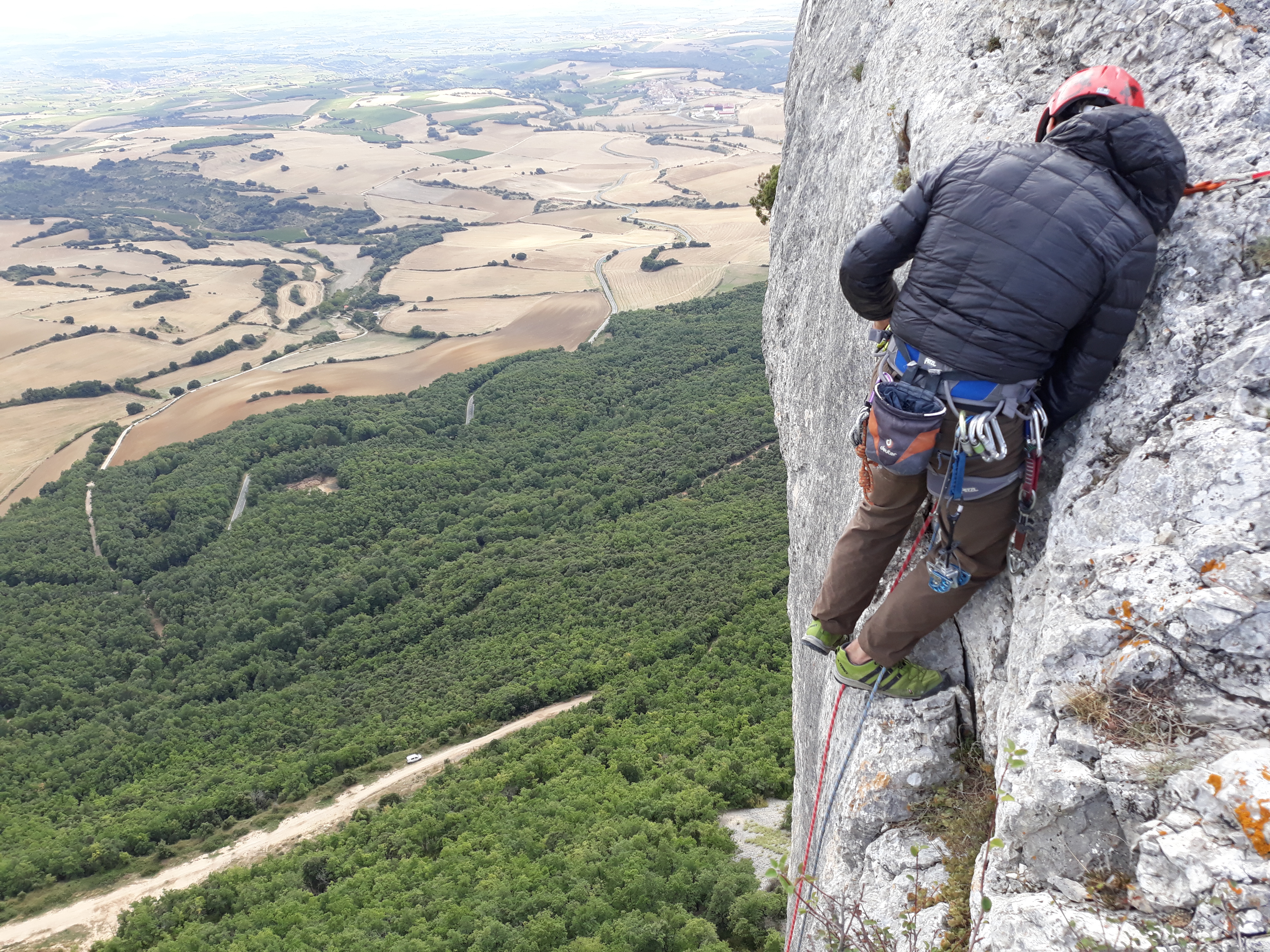 Largo 2, 6a+ (30 metros): Muro tieso de roca delicada y mucho arbustillo al principio. Hay que escalar con temple ya que cuesta ver dónde instalar las protecciones. Hay posibilidad de lacear 2 puentes de roca, pero están sin cordino. Después encontraremos 2 bolts y la siguiente reunión a mano derecha, a los pies de un diedro.