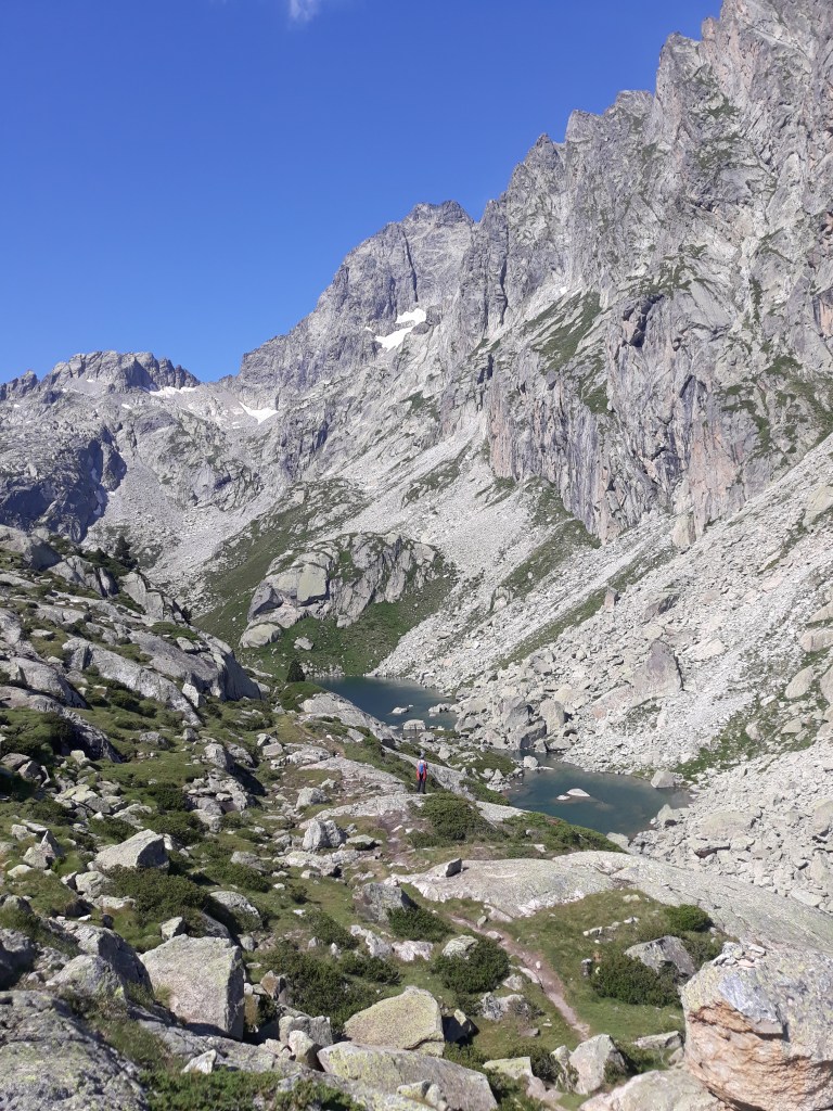 Bordearemos el lago grande por su izquierda para encontrarnos de frente con el Triangle D´Or , una gran pared anaranjada cortada por una gran grieta de derecha a izquierda.