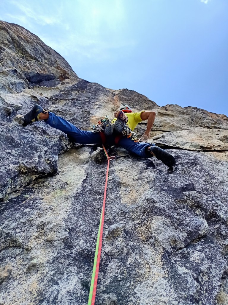 Largo 2, IV+: Seguimos en vertical por los tafonis. Hay un spit pero me costó mucho verlo. Un pasito para montarse en una rampa que nos llevará a la siguiente reunión.