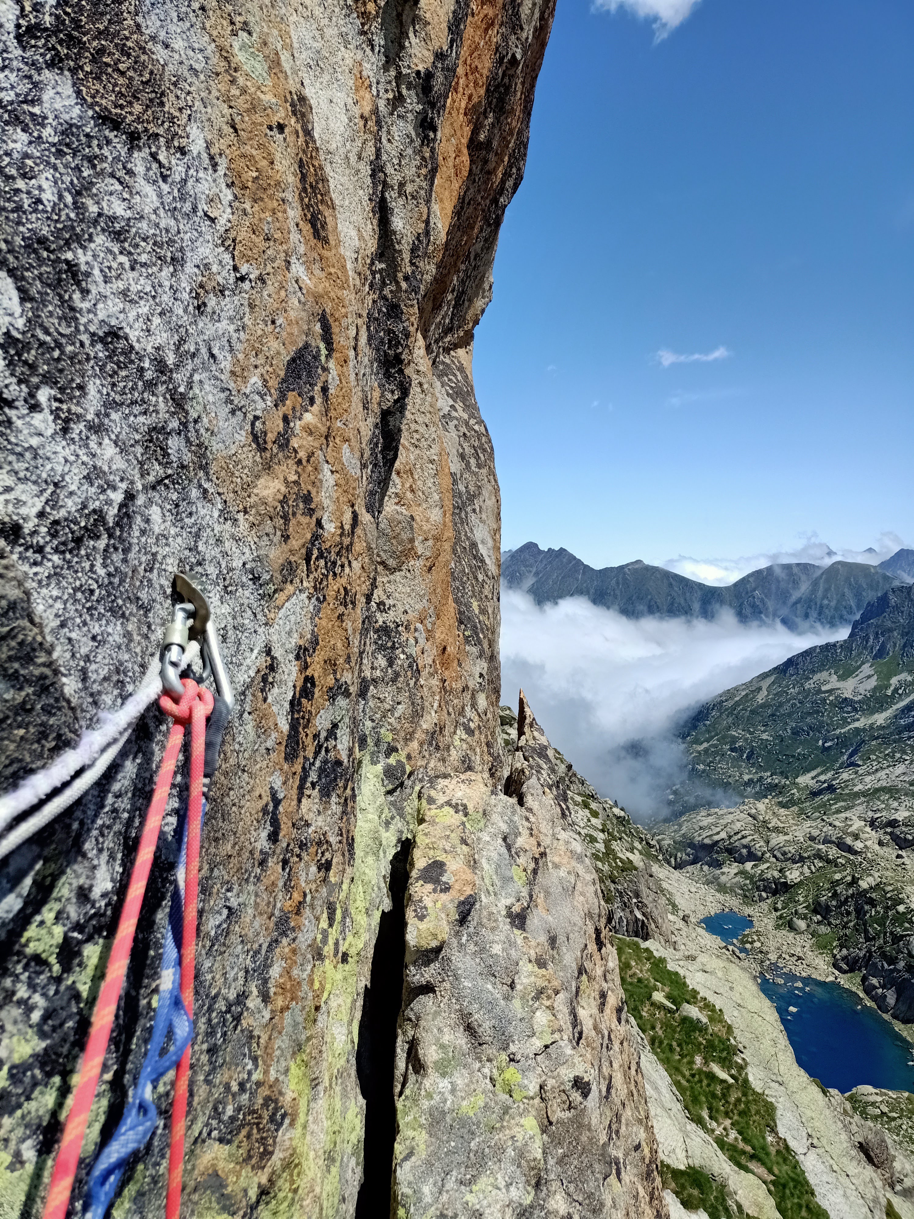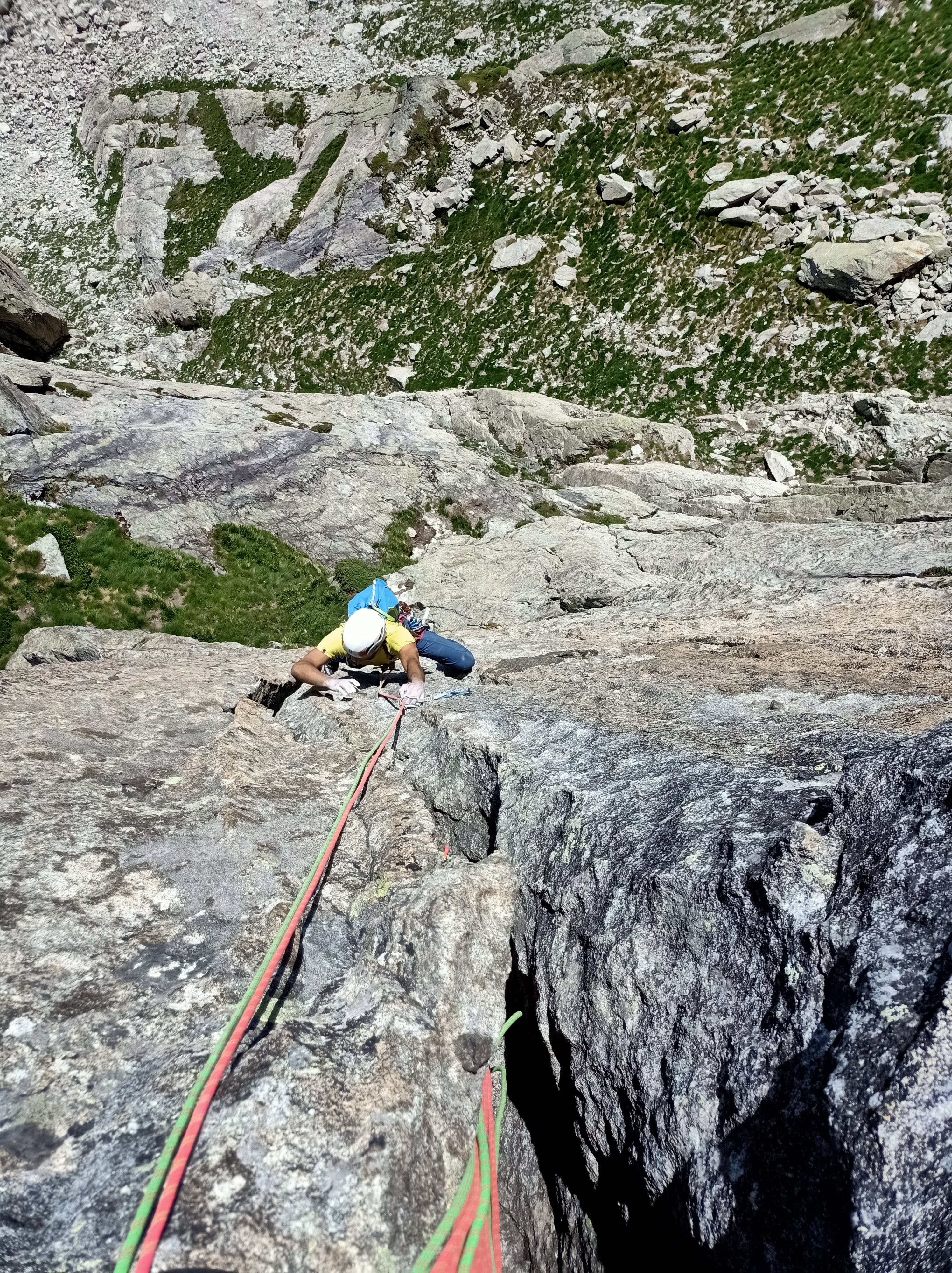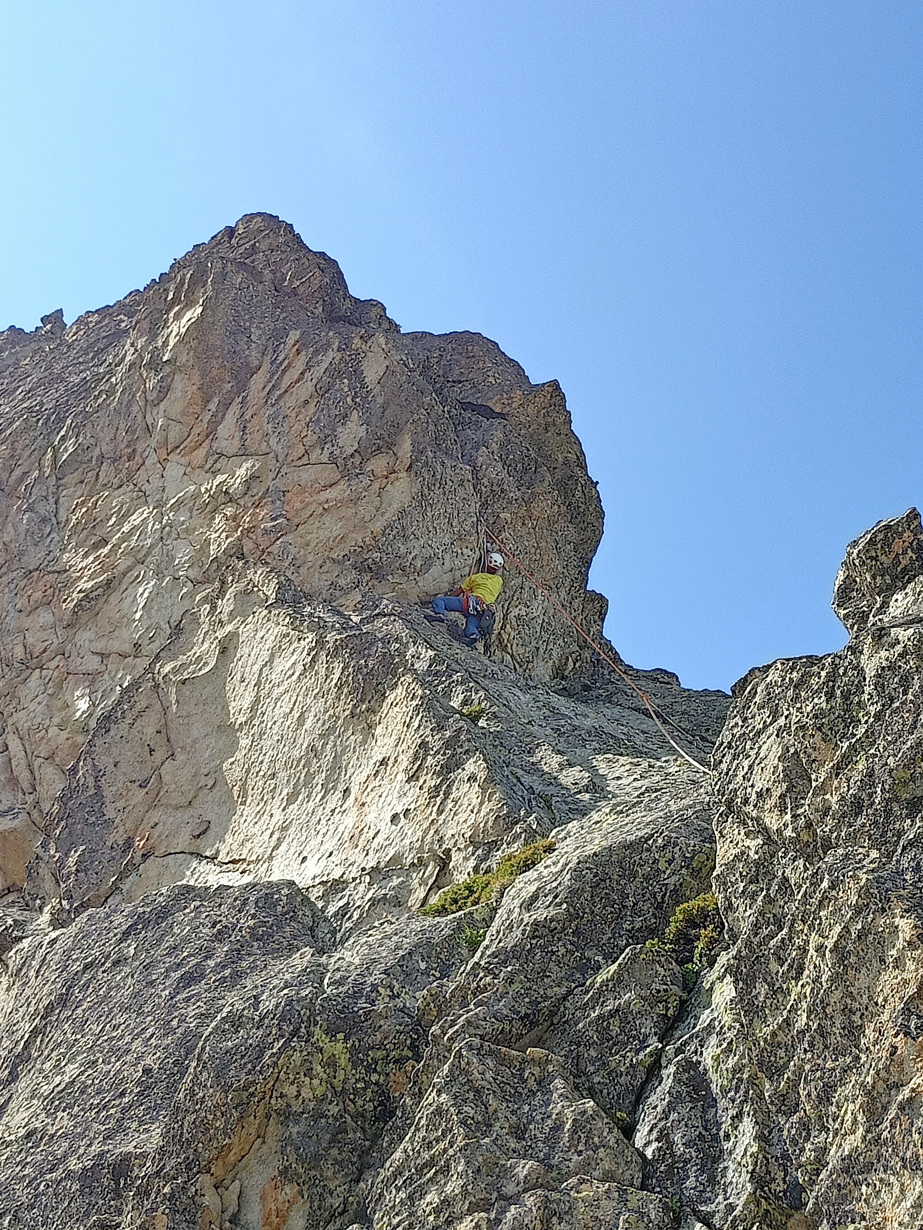 Largo 5, V+: Diedro a la izquierda, alcanzar el filo y montarnos en unas dobles fisuras que seguiremos hasta la reunión.
