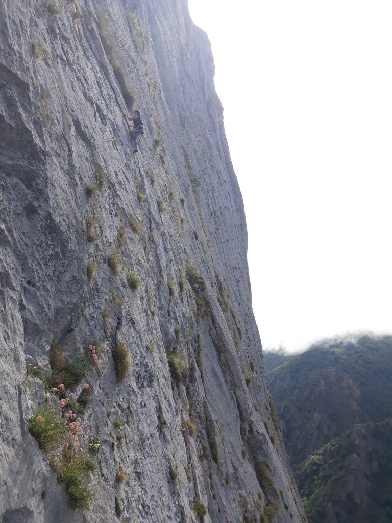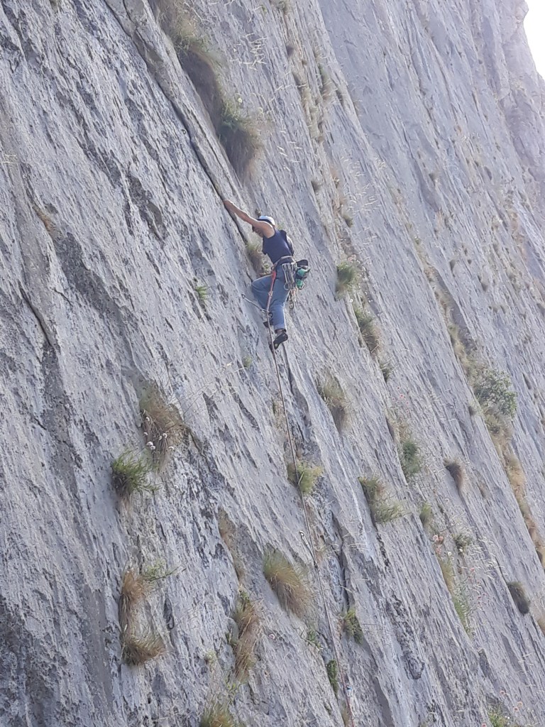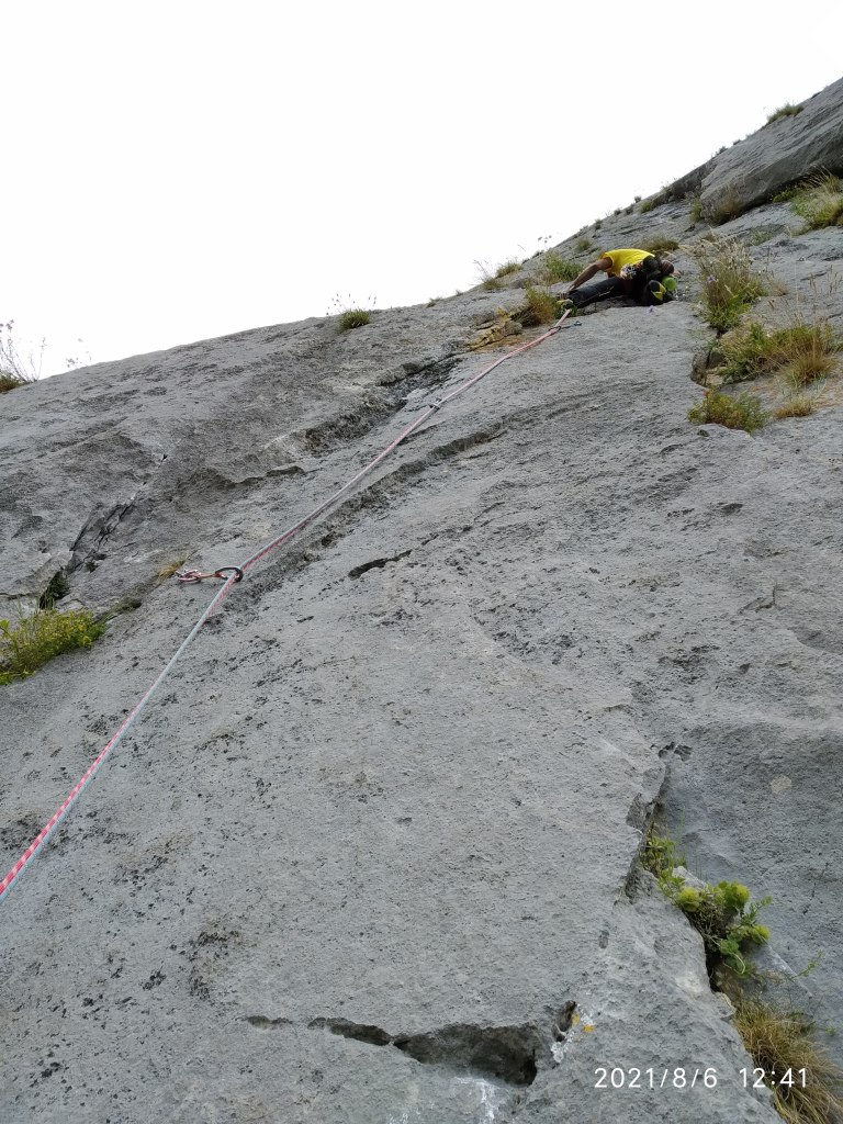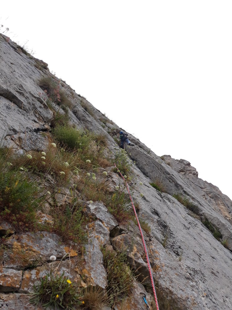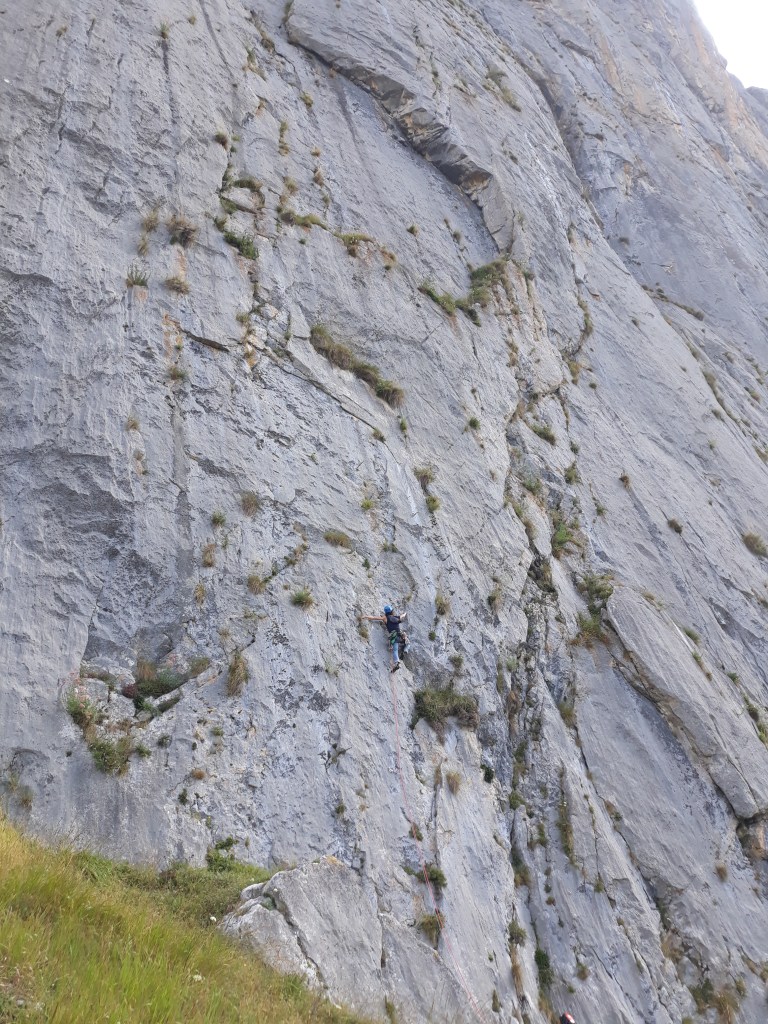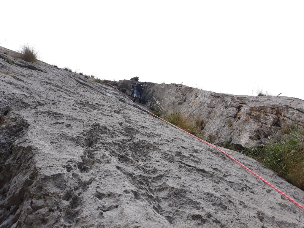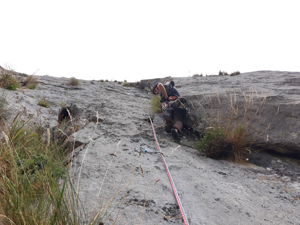 Largo 1, 6a+: Tirada vertical sobre buenas lajas. Con un pasito tontorrón de adherencia sobre agarres invertidos. Llega a la reunión sobre bloques dudosos.
