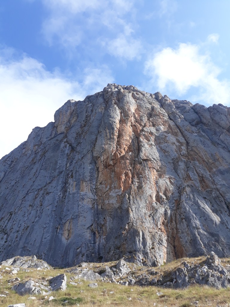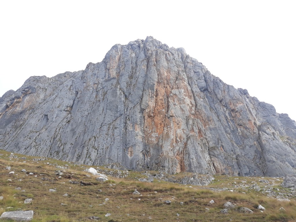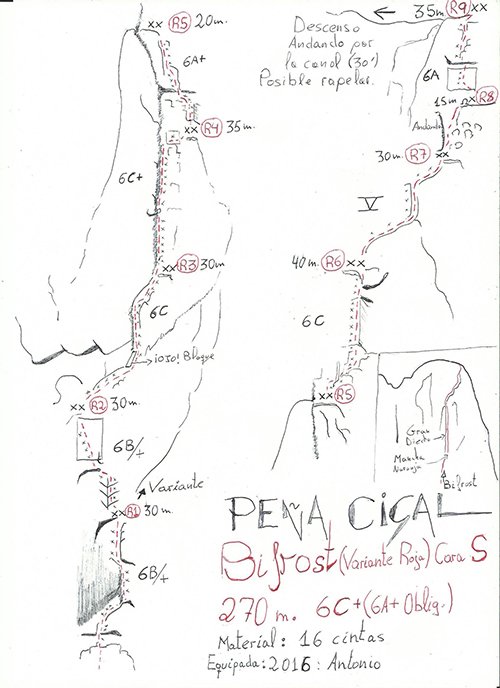 Esta modesta cumbre de 1.532 metros, en las estribaciones de los Picos de Europa y custodiada por la pequeña localidad de Caloca, contiene un paredón calizo de 250 metros en su vertiente suroeste. La vía Bifrost surca su parte central por la zona anaranjada. Dos largos de placa sobre roca pinchuda nos depositan en una sucesión de diedros Ordesianos. Es una pena que la vía transcurra tan a menudo sobre roca dudosa en su parte central, obligándonos a prestar atención en muchos pasajes, porque la vía es buenísima.