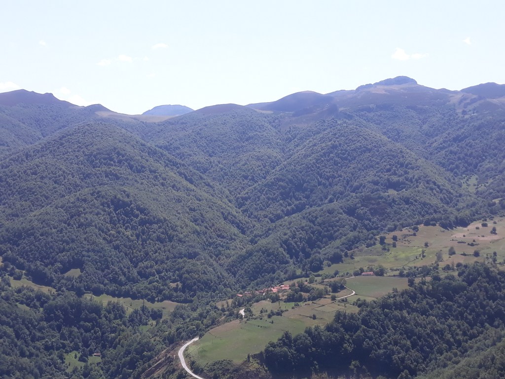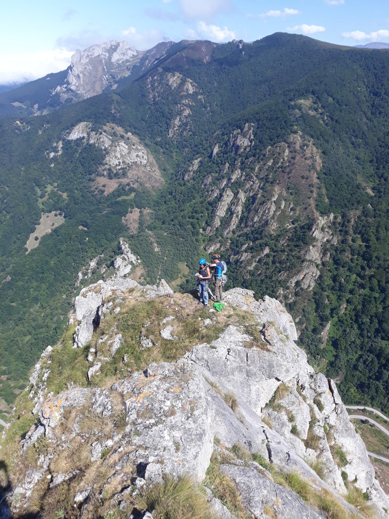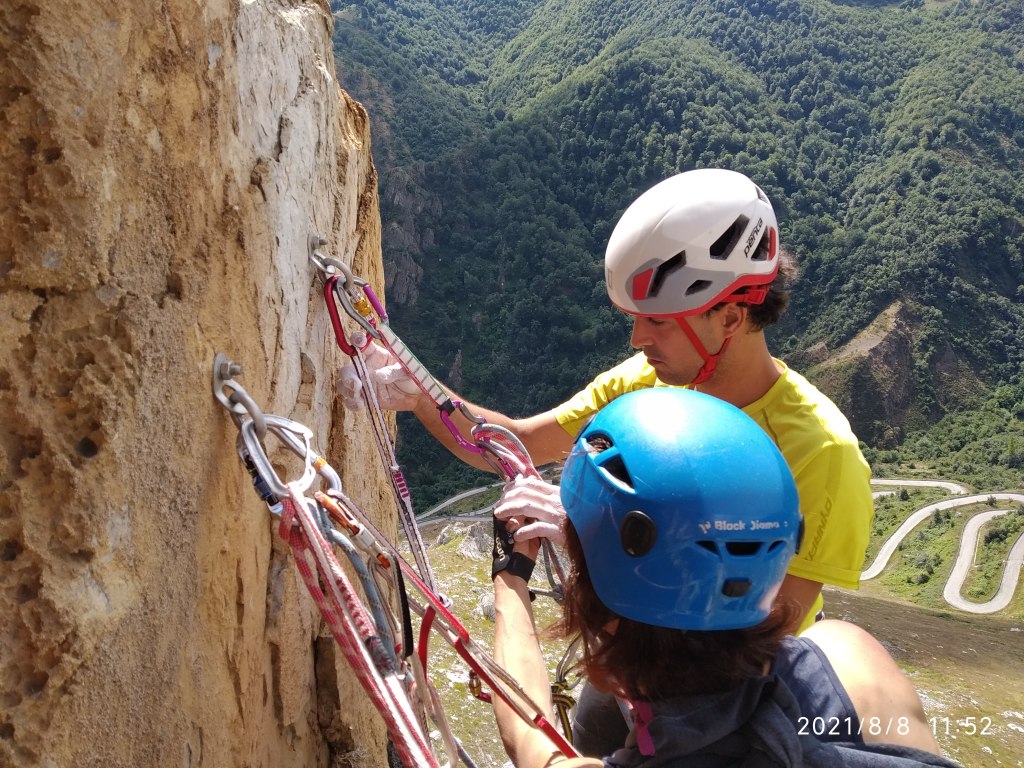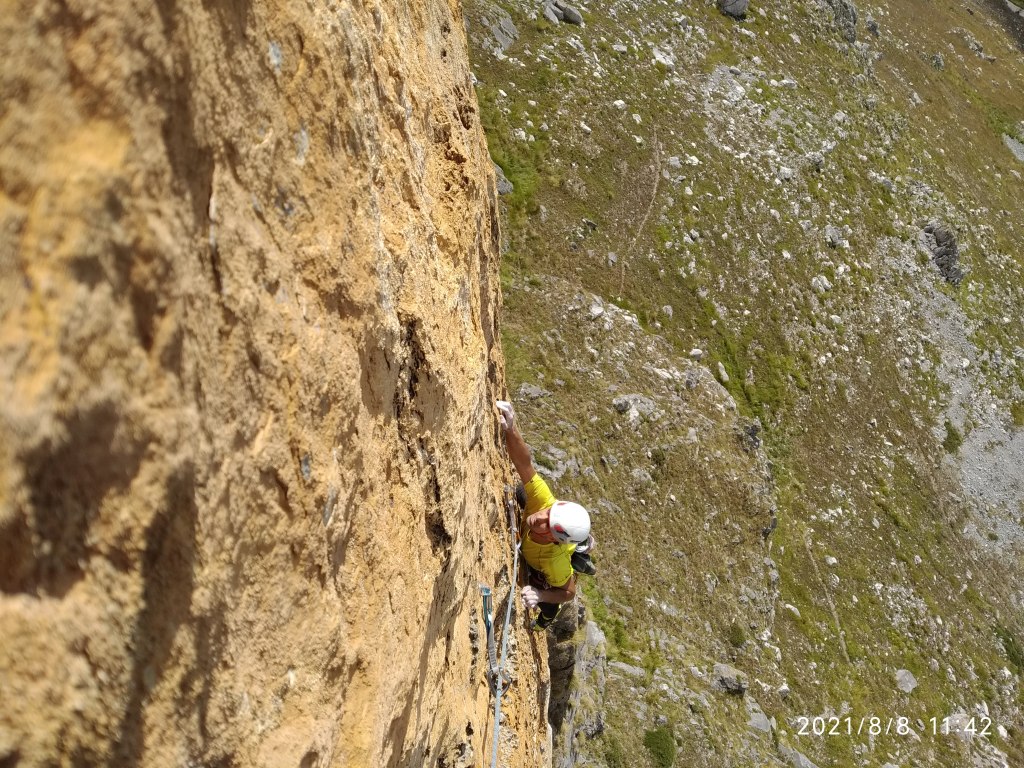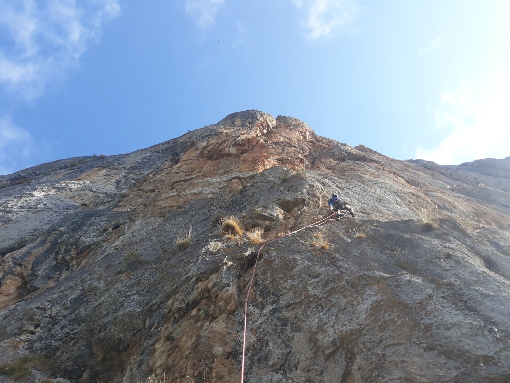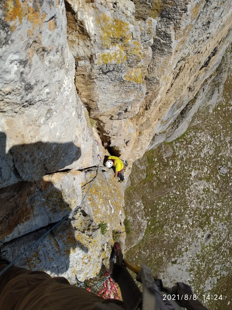 Largo 7, V+: Tras un descanso en una terraza herbosa para digerir tanta roca rota, afrontamos esta chimenea de quinto grado y con roca dudosa. Abajo podemos ver el pintoresco pueblo de Caloca y el denso bosque frecuentado por osos.
