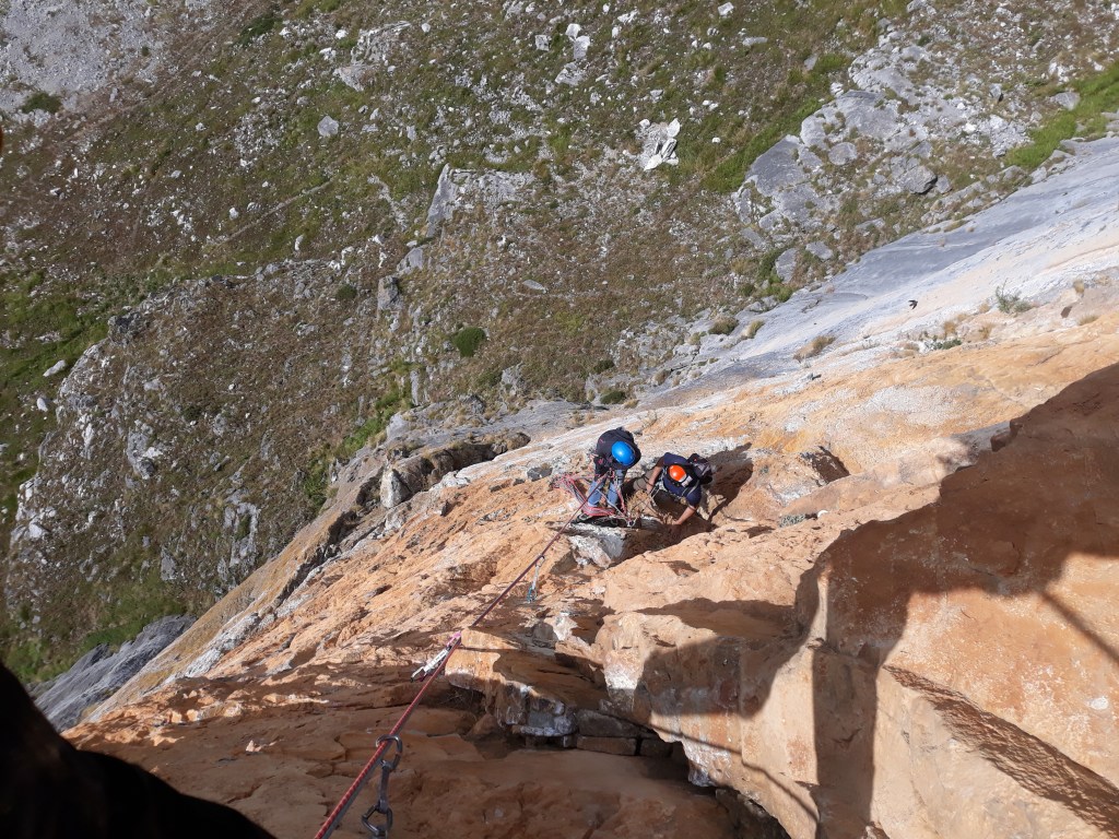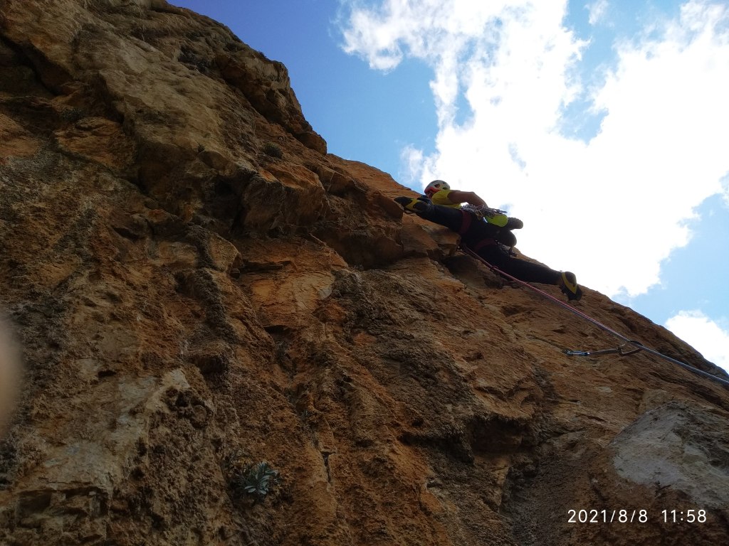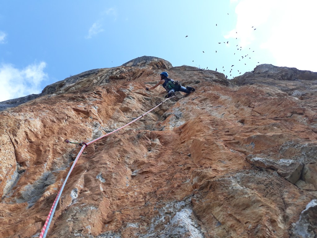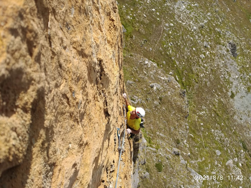 Largo 8, 6a+: Para alcanzar este largo debemos andar por una franja herbosa de la pared. Tanta roca naranja y rota contrasta con esta placa de típica caliza gris y compacta. Una vez superada la placa hacia la derecha (fácil colarse y verse en apuros).