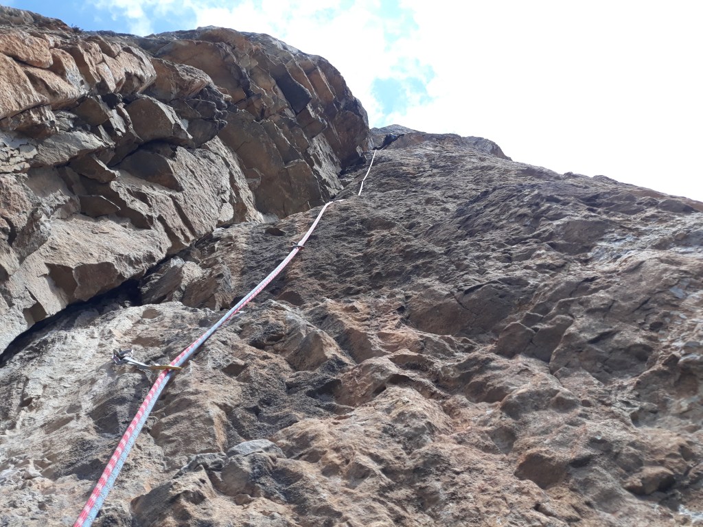 Largo 1, 6b+, 30 metros: Pasito fino para montarse a la pared, después por terreno más fácil hasta otro paso. Se pone vertical sobre roca abrasiva hasta la reunión.