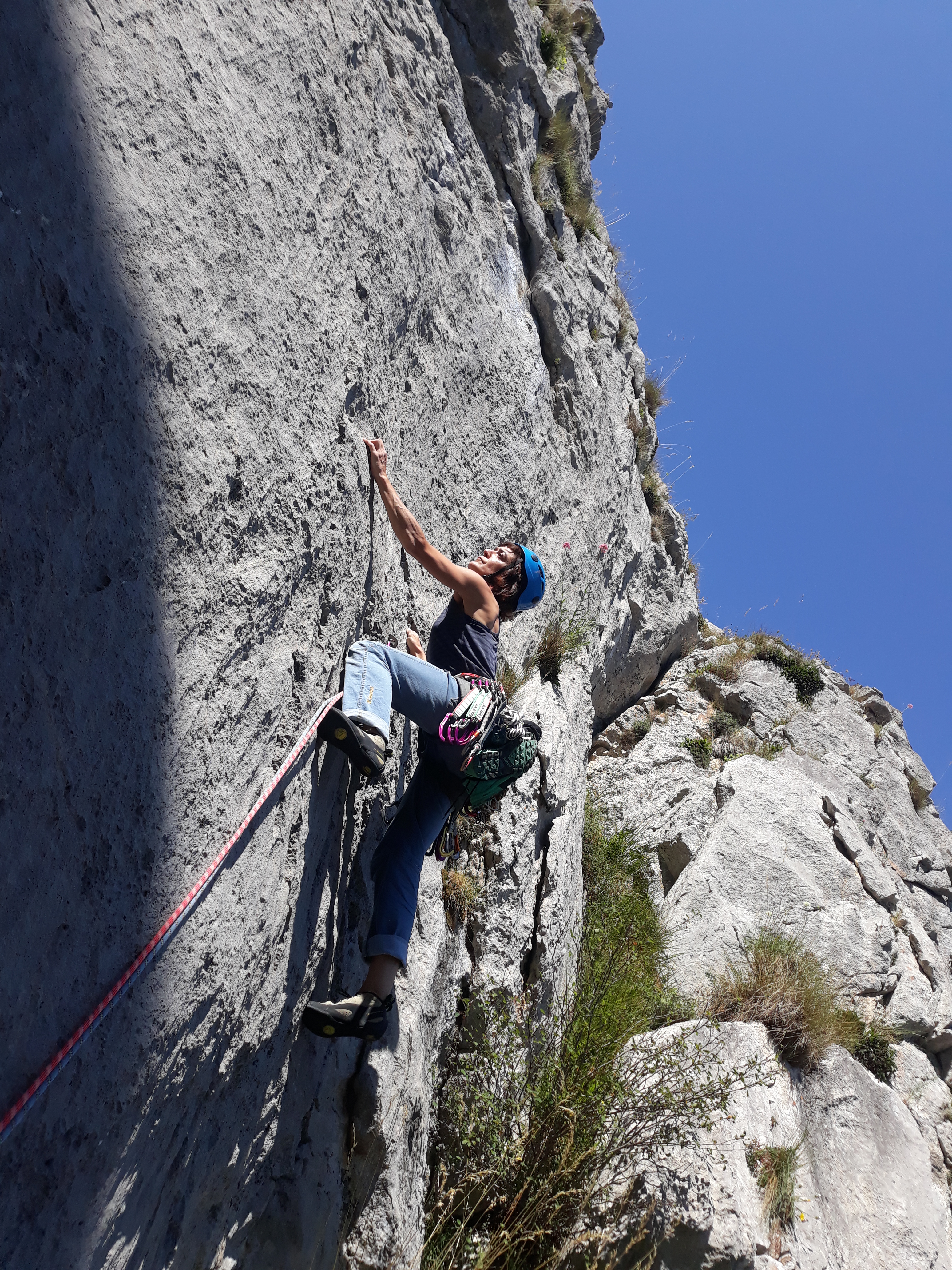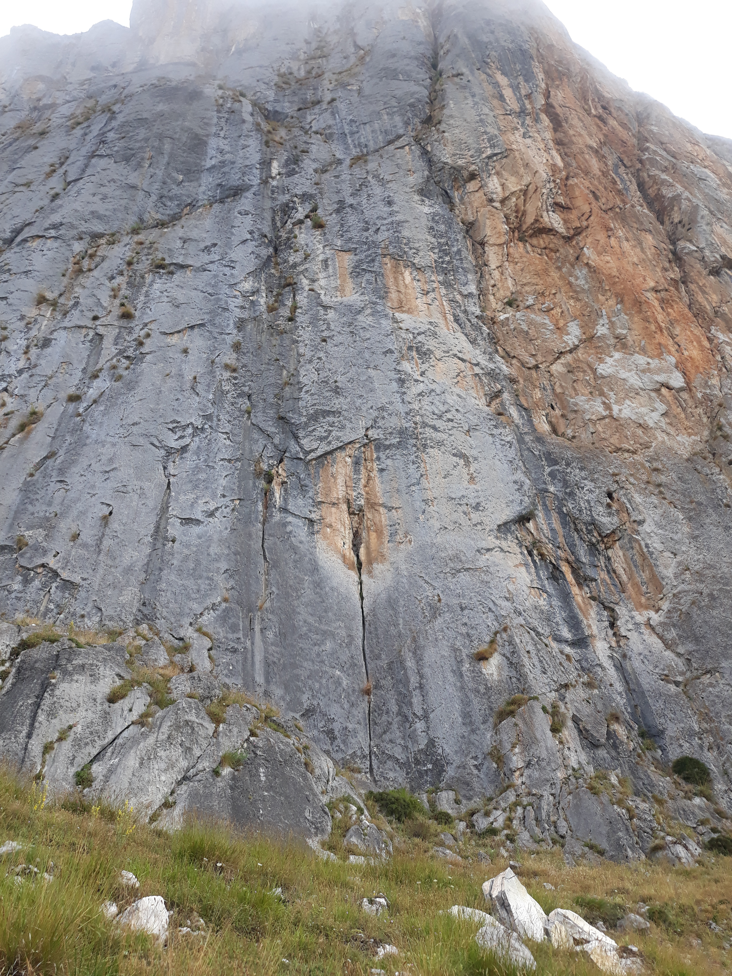 Largo 8, 6a+: Para alcanzar este largo debemos andar por una franja herbosa de la pared. Tanta roca naranja y rota contrasta con esta placa de típica caliza gris y compacta. Una vez superada la placa hacia la derecha (fácil colarse y verse en apuros).
