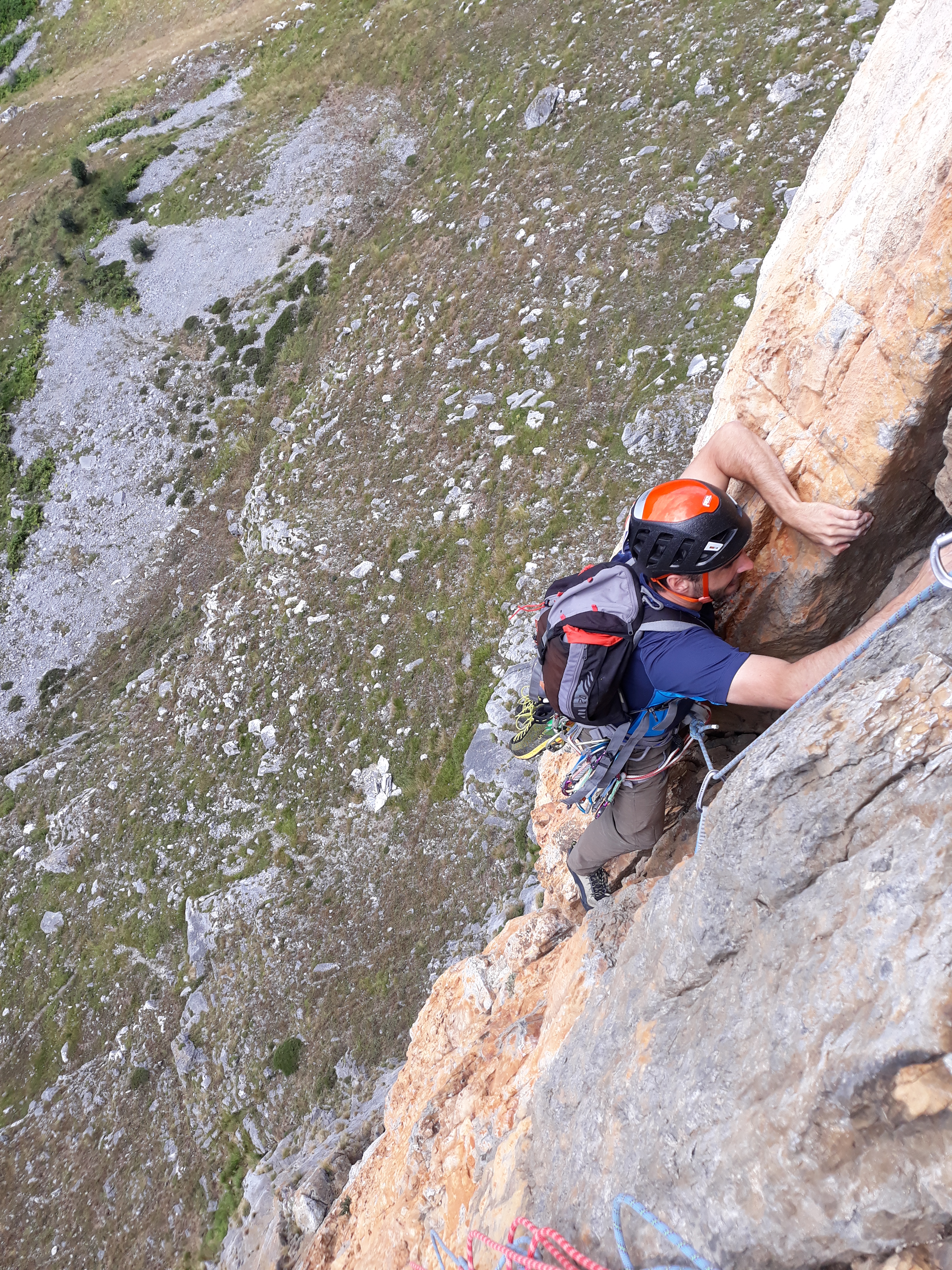 Largo 7, V+: Tras un descanso en una terraza herbosa para digerir tanta roca rota, afrontamos esta chimenea de quinto grado y con roca dudosa. Abajo podemos ver el pintoresco pueblo de Caloca y el denso bosque frecuentado por osos.