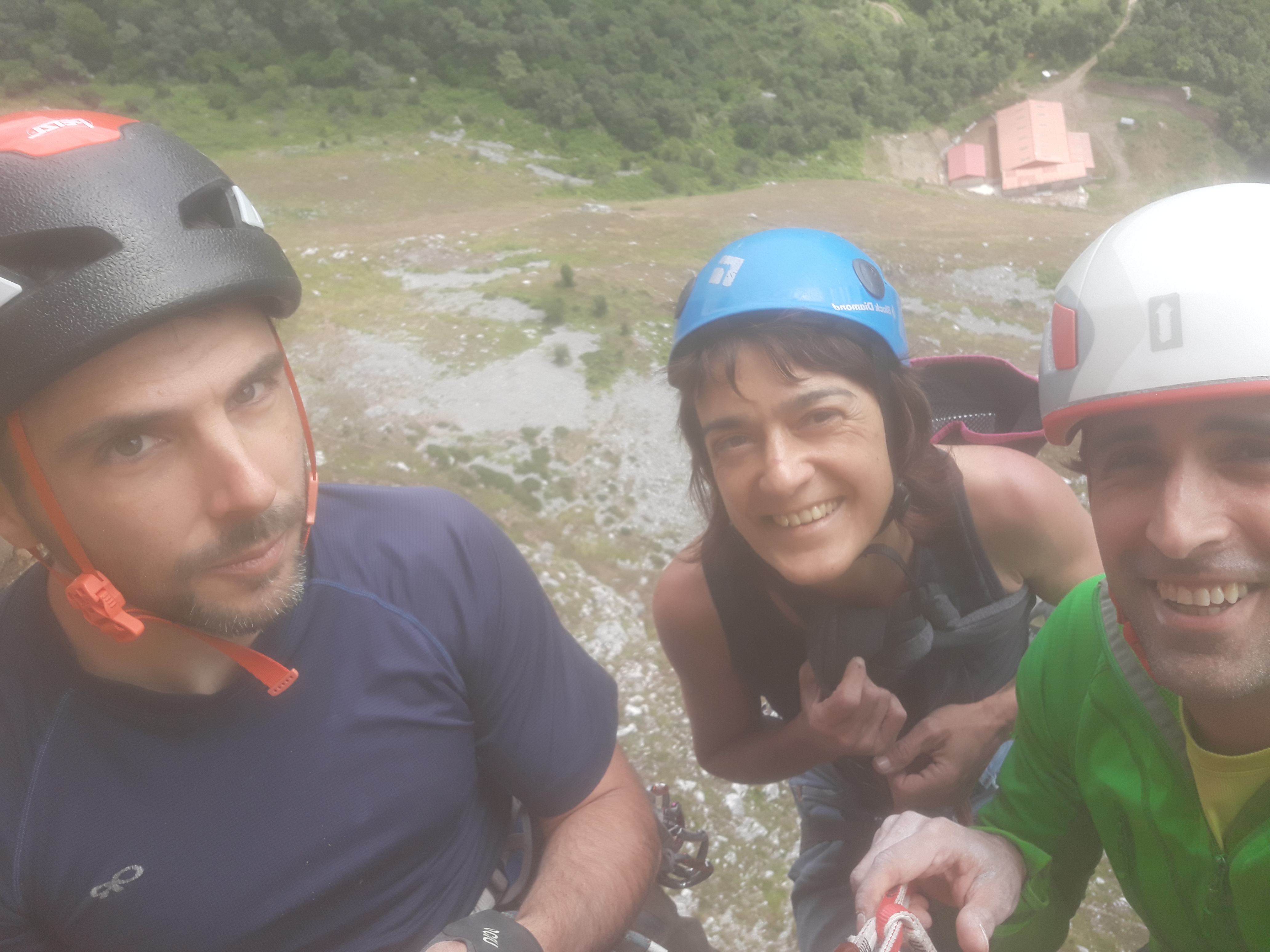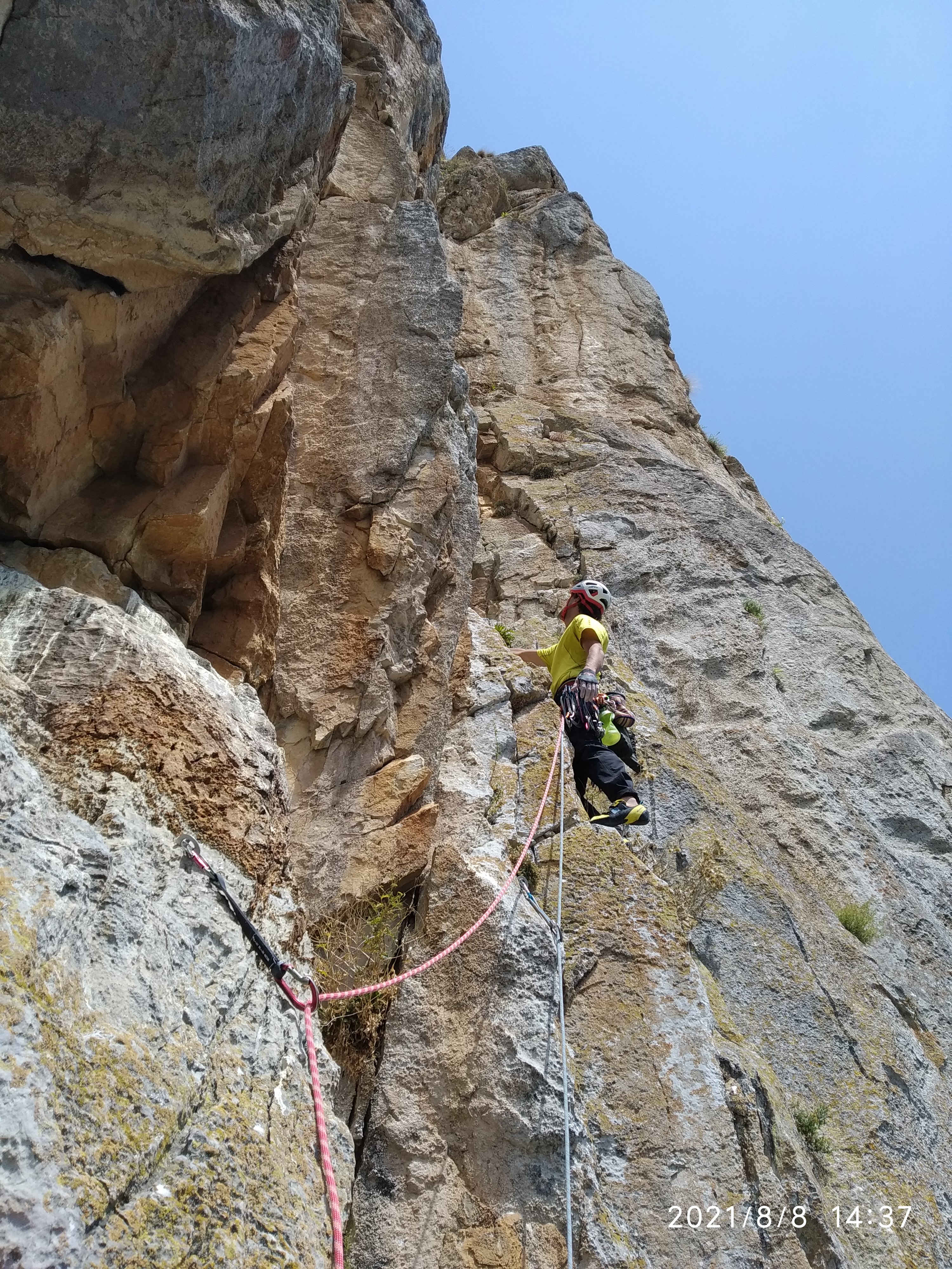 Largo 1, 6b+, 30 metros: Pasito fino para montarse a la pared, después por terreno más fácil hasta otro paso. Se pone vertical sobre roca abrasiva hasta la reunión.