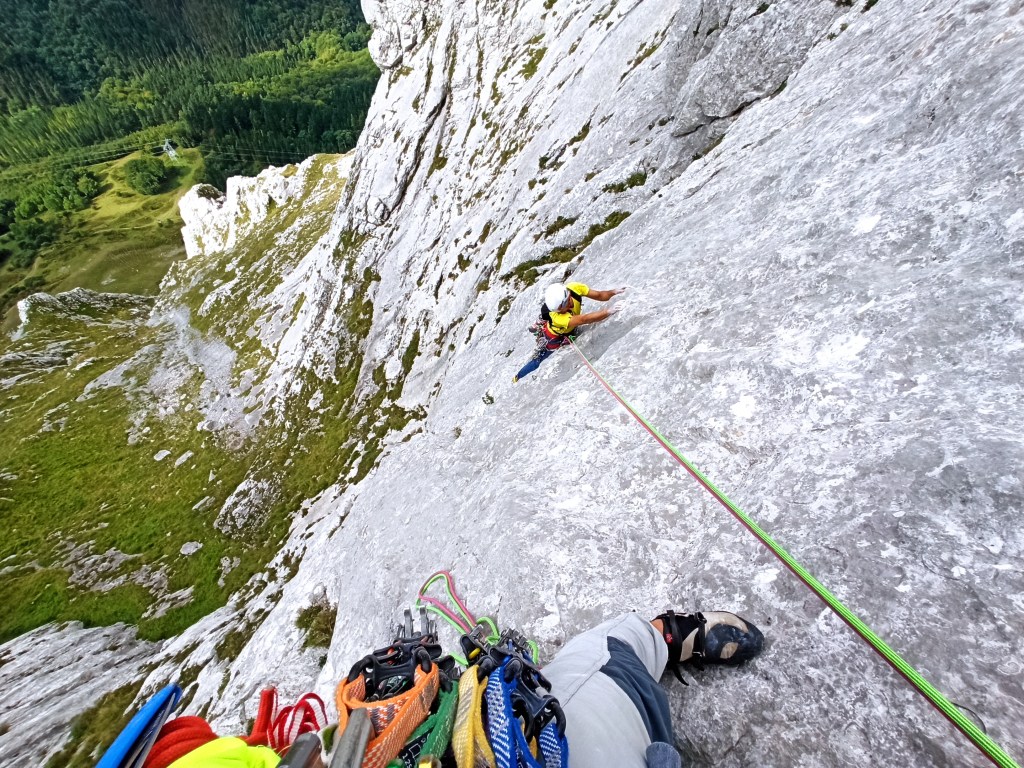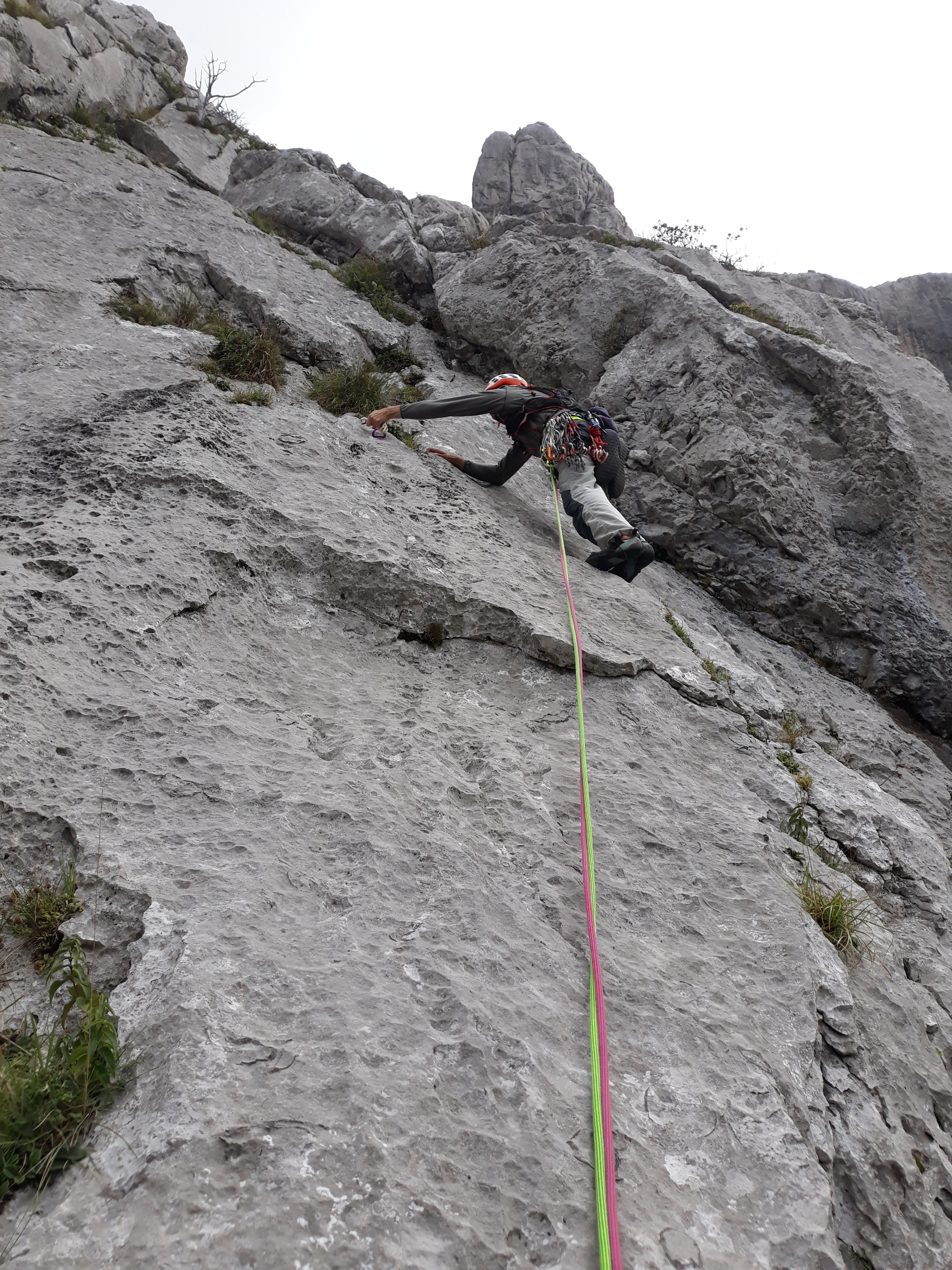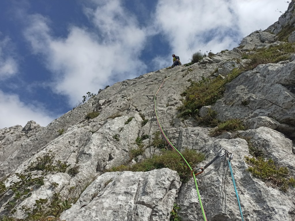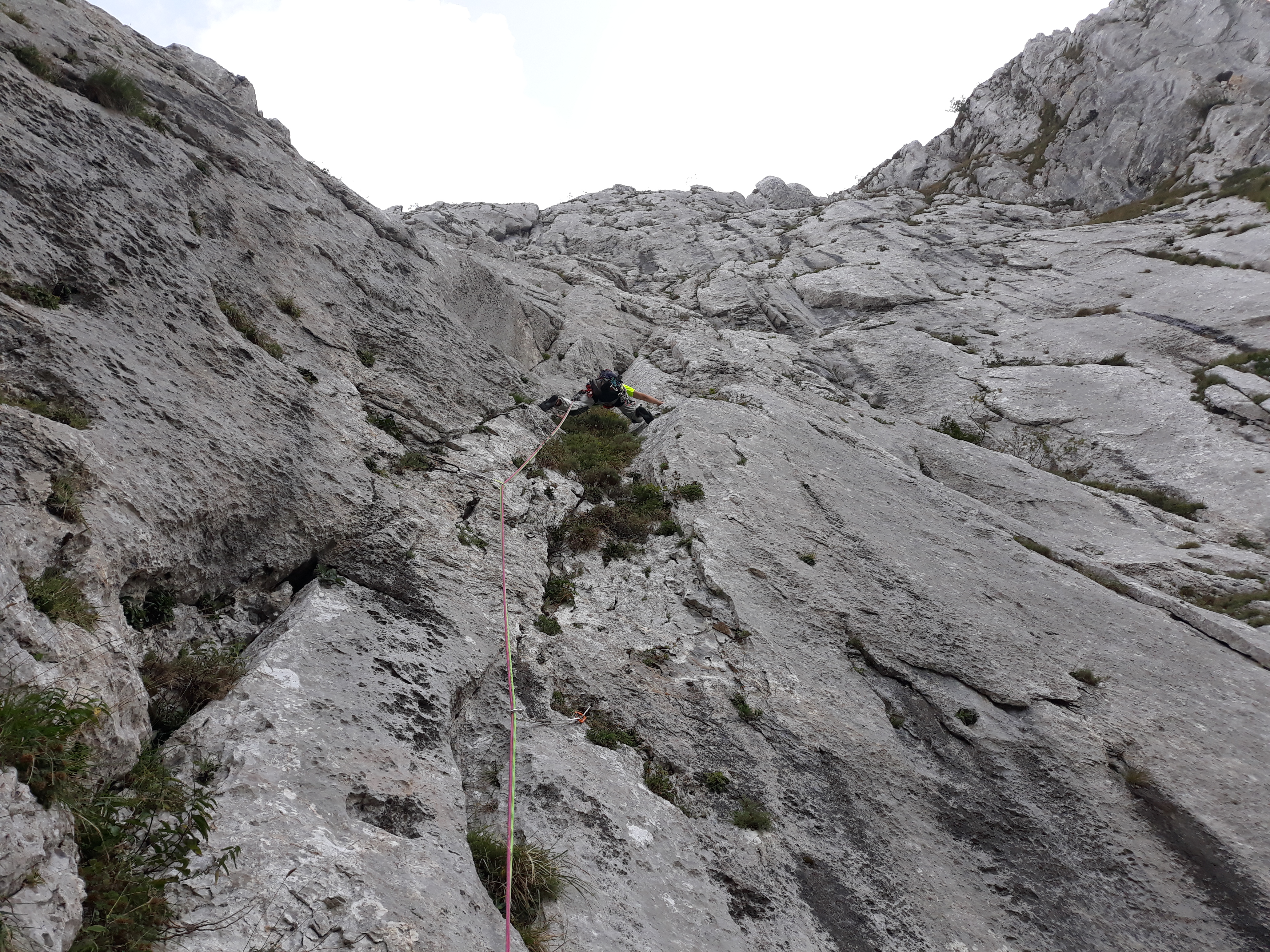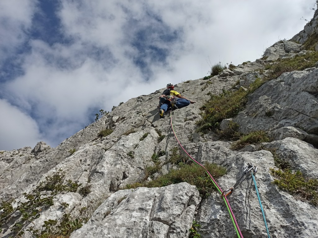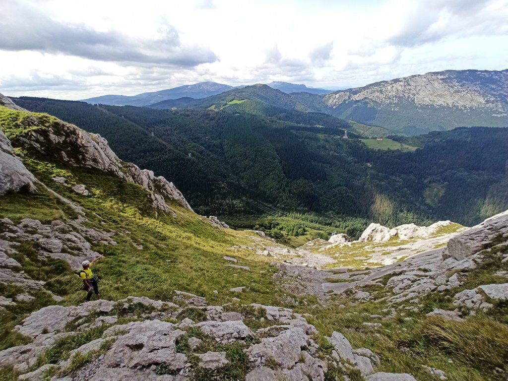Largo 9, 6a (40 metros): Precioso largo de placa fina al principio y típicas lajas «atxarteras» después, sobre roca espectacular. El perfecto broche para una vía que nos ha encantado.