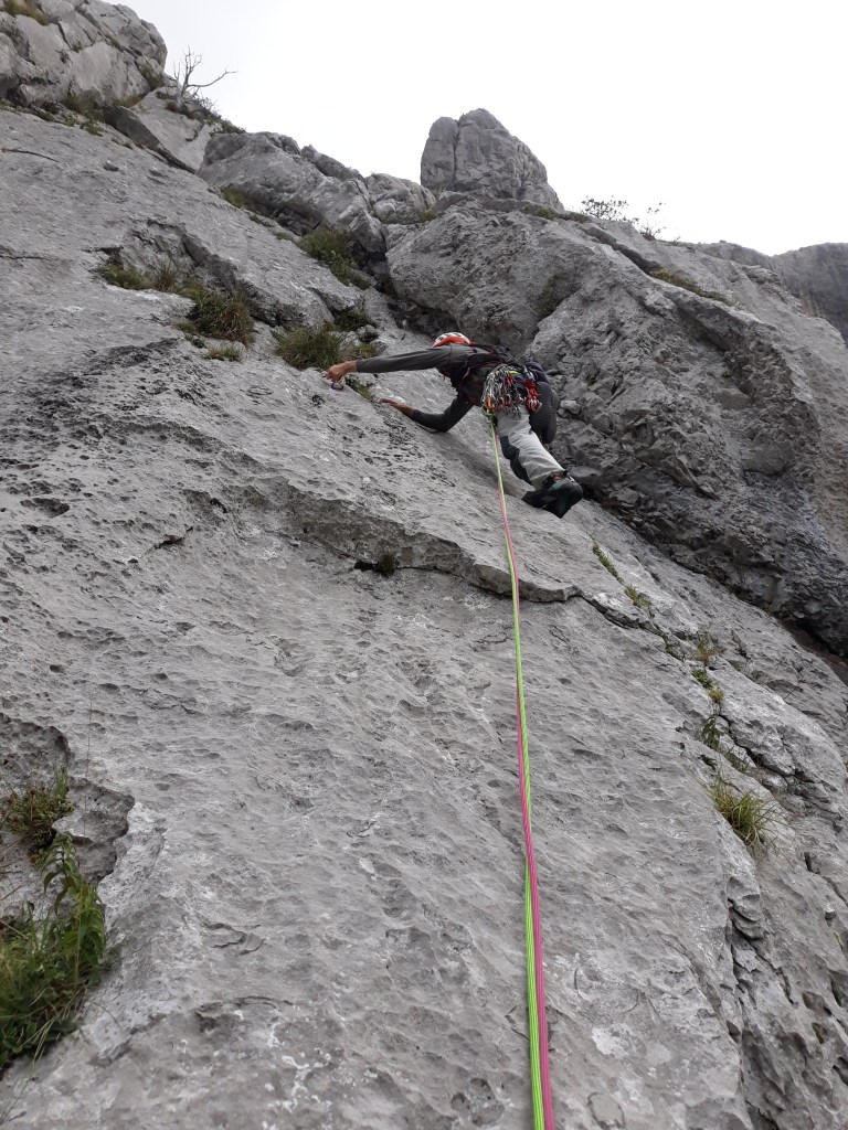 Largo 3, III+ (45 metros): Preciosas placas tumbadas y unas trepadas nos llevan a la siguiente reunión (dos puentes de roca).