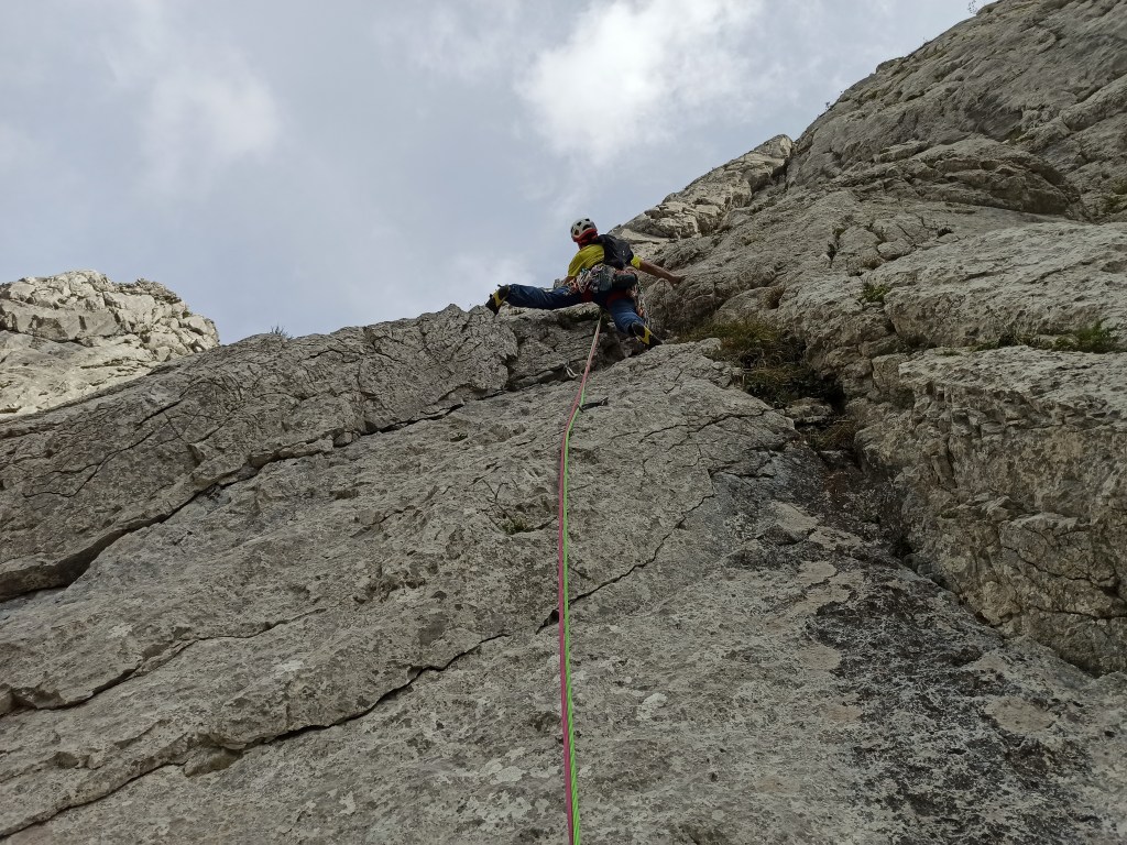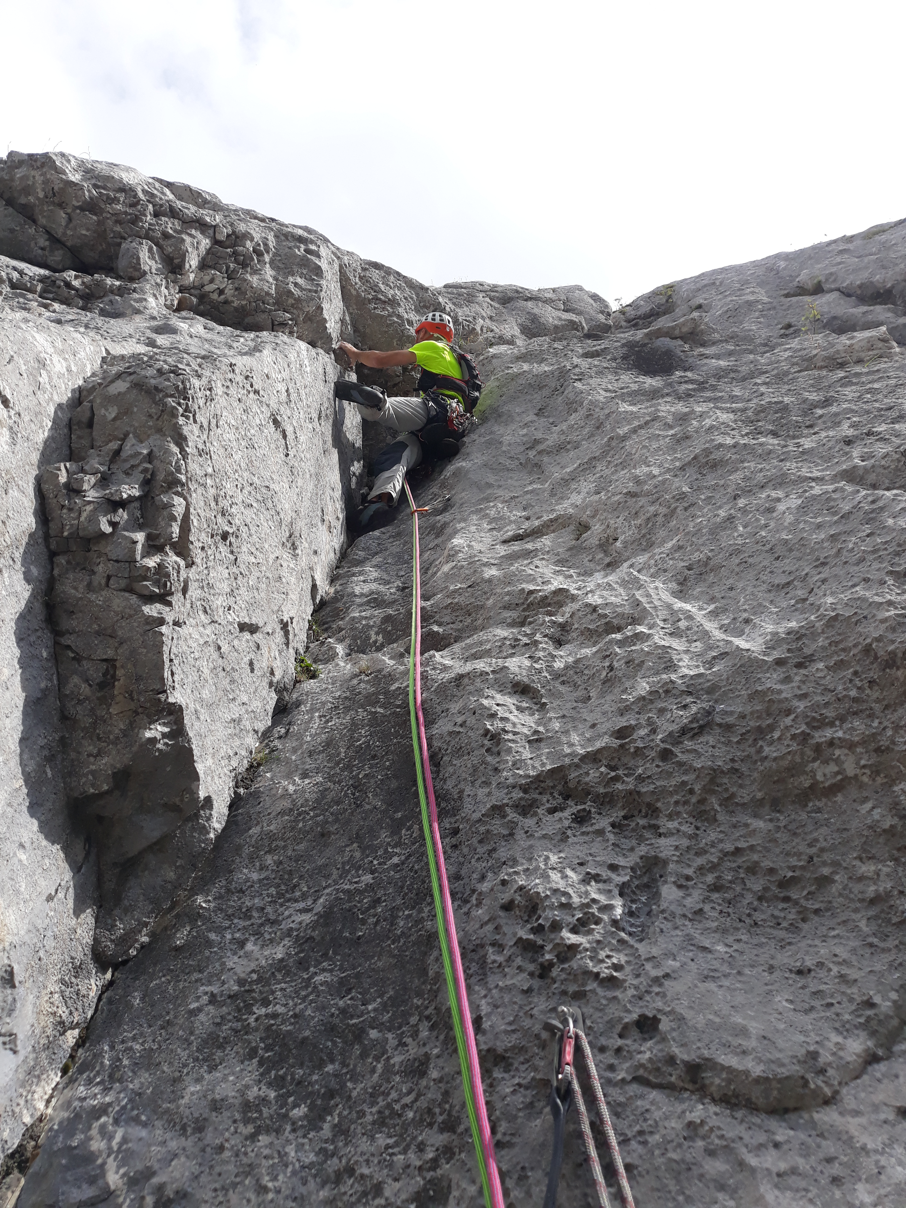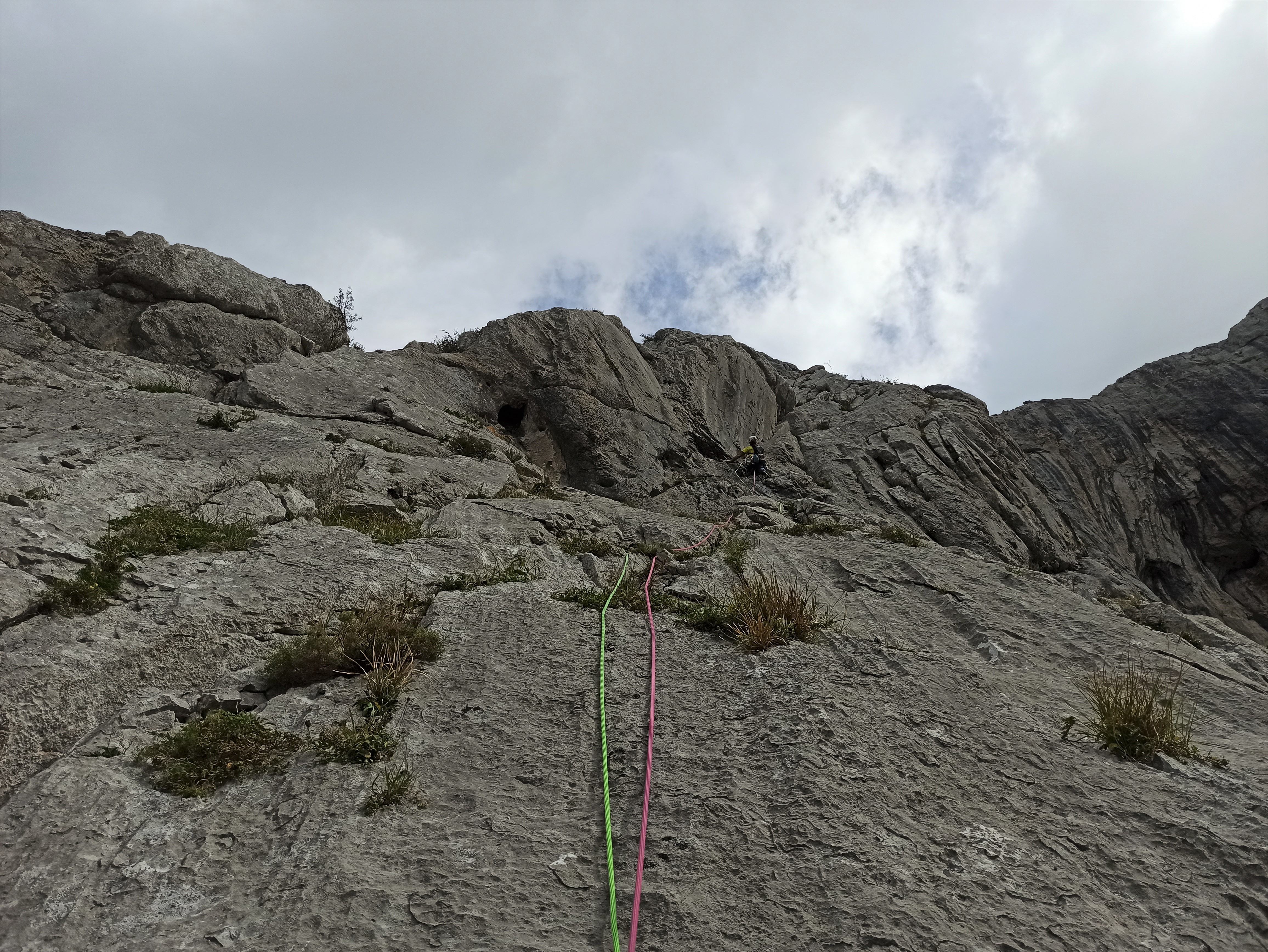 Largo 5, 6a (45 metros): Unas trepadas nos permiten alcanzar el diedro, con un par de pasos de 6a.
