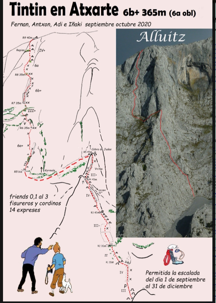 La vía transcurre por una serie de placas en la parte baja del Alluitz para luego surcar de forma soberbia la pared a la izquierda del espolón de los Eibarreses, por donde transita la ya clasica » La cabra de Judas». De dificultad no excesiva pero expuesta en algunos tramos. Los largos superiores a la grada herbosa no nos dejarán indiferentes. Una bonita vía de aventura en la que disfrutaremos de la soledad de la vertiente suroeste del Alluitz.