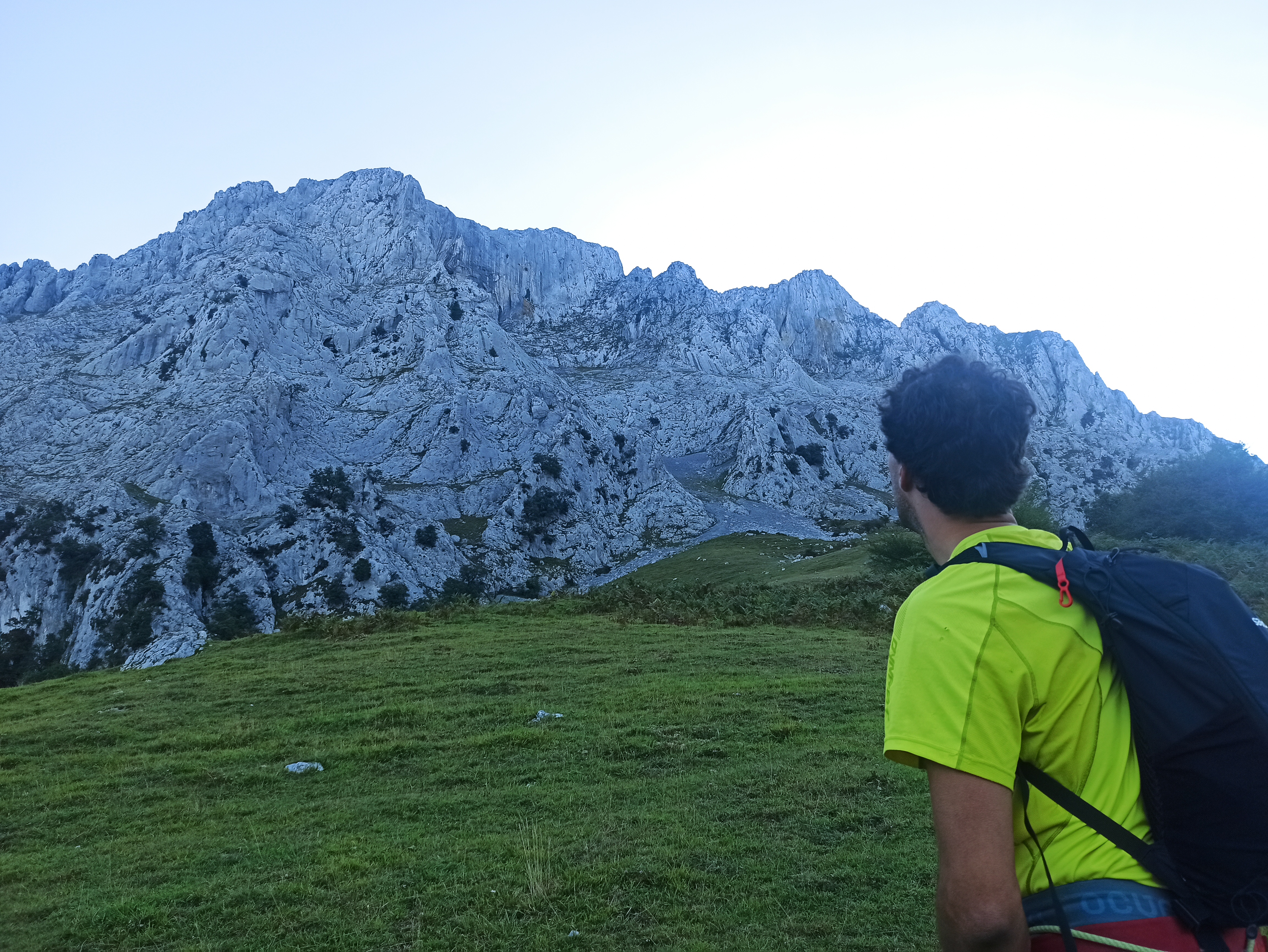 Largo 1, IV+ (55 metros): Unas sencillas trepadas de III nos sitúan en la característica placa de gotas de agua. Después travesía a izquierda hasta alcanzar la reunión (dos puentes de roca).