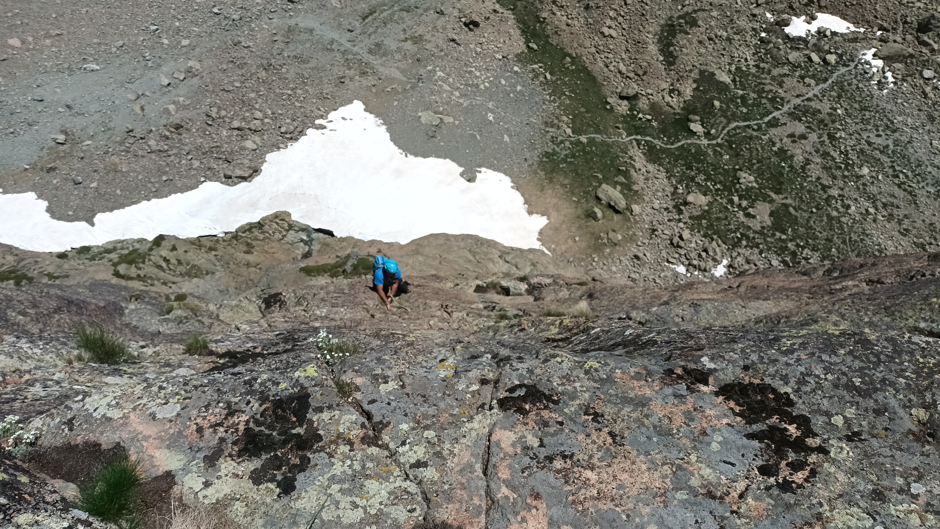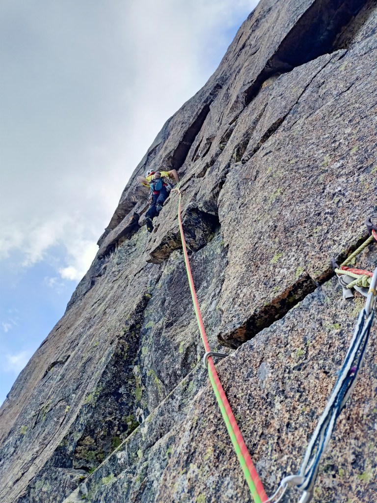 Largo 7, 6b, 40 metros: Salimos por fisura de dedos tumbada, tras un reposo nos metemos en un diedro/offwith que se va dejando aunque intimida. Escalada técnica de gesto. Llegamos a otro buen reposo para coger aliento, hay una reunión antigua llena de cordinos en mal estado (probablemente la que montaron los Ravier en su día) que nos saltamos. A partir de ahí espectacular fisura de manos hasta la reunión. Sólo por este largo merece la pena hacer esta vía. Espectacular.
