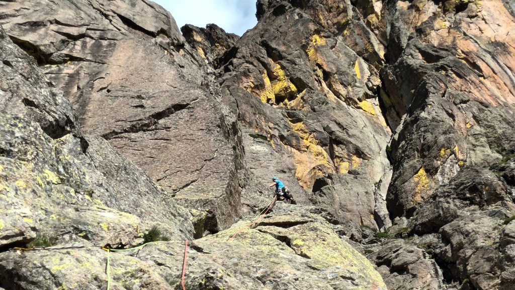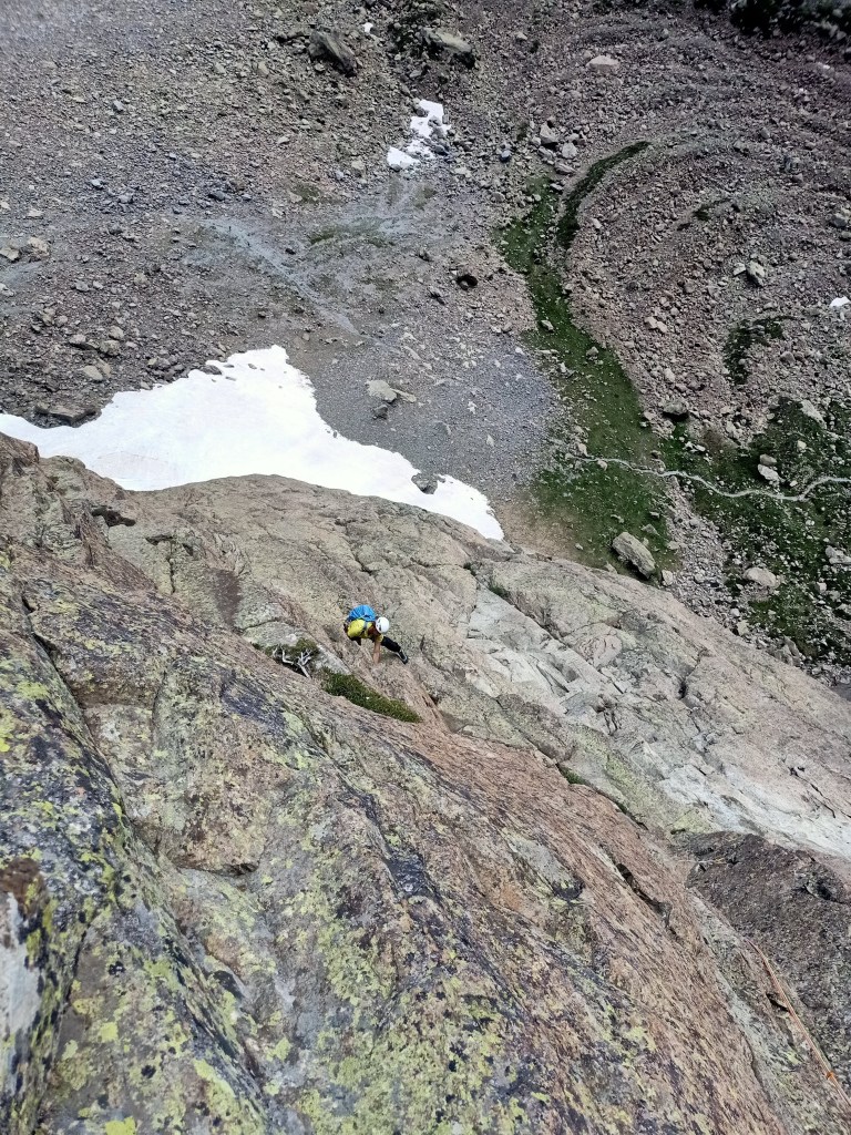 Largo 6, V, 45 metros: Superamos un diedro con un poco de deplome (dos clavos). Después seguimos en recto por otro diedro herboso que nos empuja a salirnos hacia su izquierda en busca de la bavaresa que nos dejará en la siguiente reunión, a los pies de la fisura del último largo. Muy buen largo.
