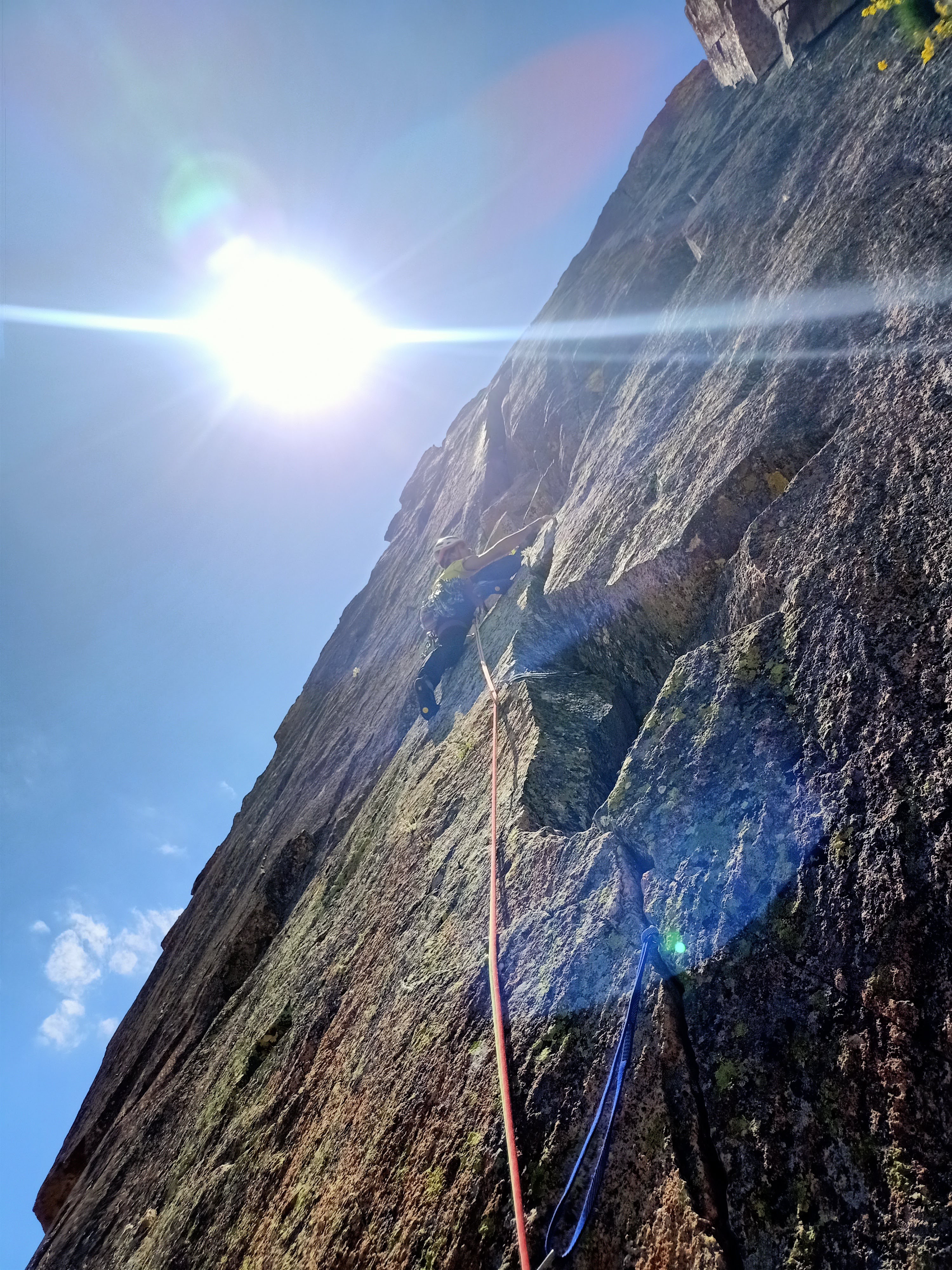 Largo 2, V+, 35 metros: Salida a bloque, y continuamos por un bonito y estético diedro. Al final salimos a la izquierda en busca de una incómoda reunión en placa. Reunión de 3 clavos.