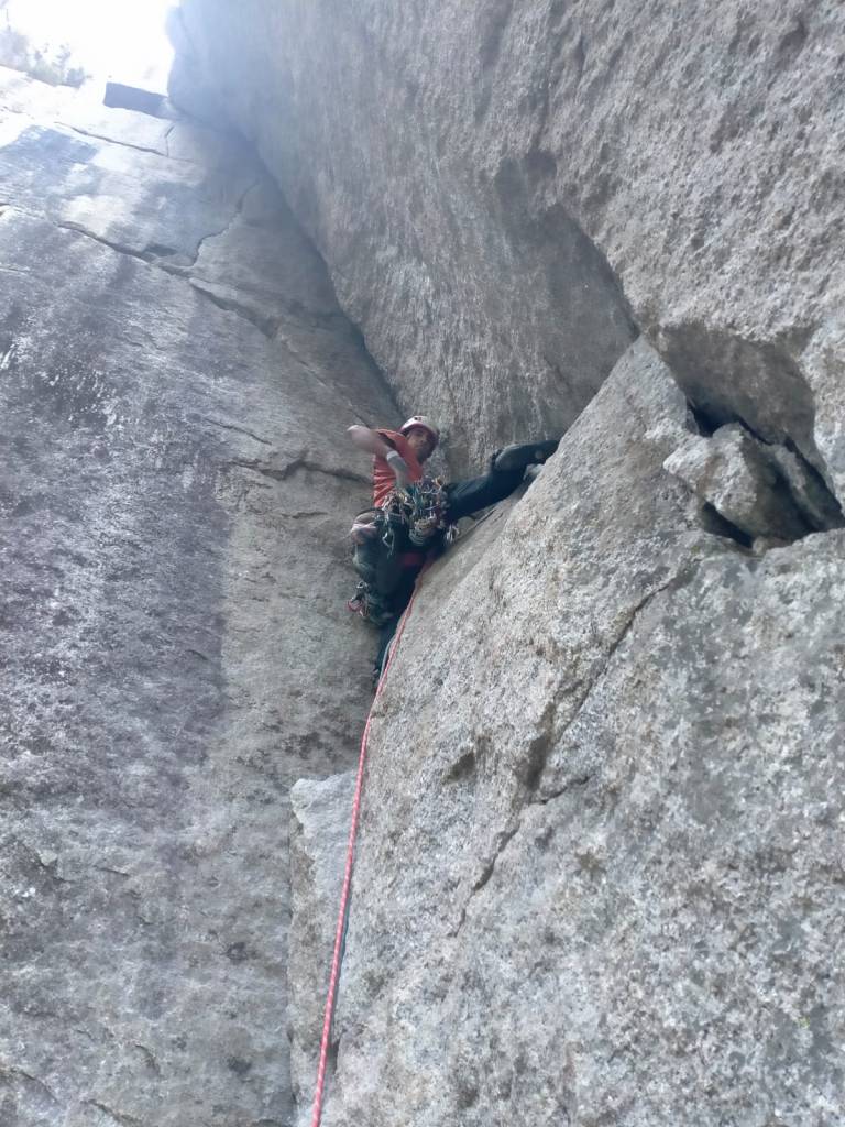 Largo 3 (5.9) 20 m : Afrontamos el diedro que tenemos encima. Tiene algún movimiento un poco raro, mitad chimenea. Después un slab en travesía a la izquierda nos deja en la reunión de bolts.