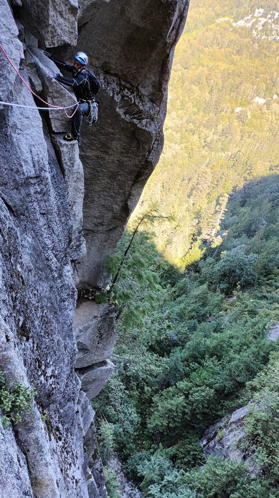 Se trata de 4 tiradas a cada cual mejor, destacando el cuarto largo; un impresionante diedro continuo de 50 metros.
