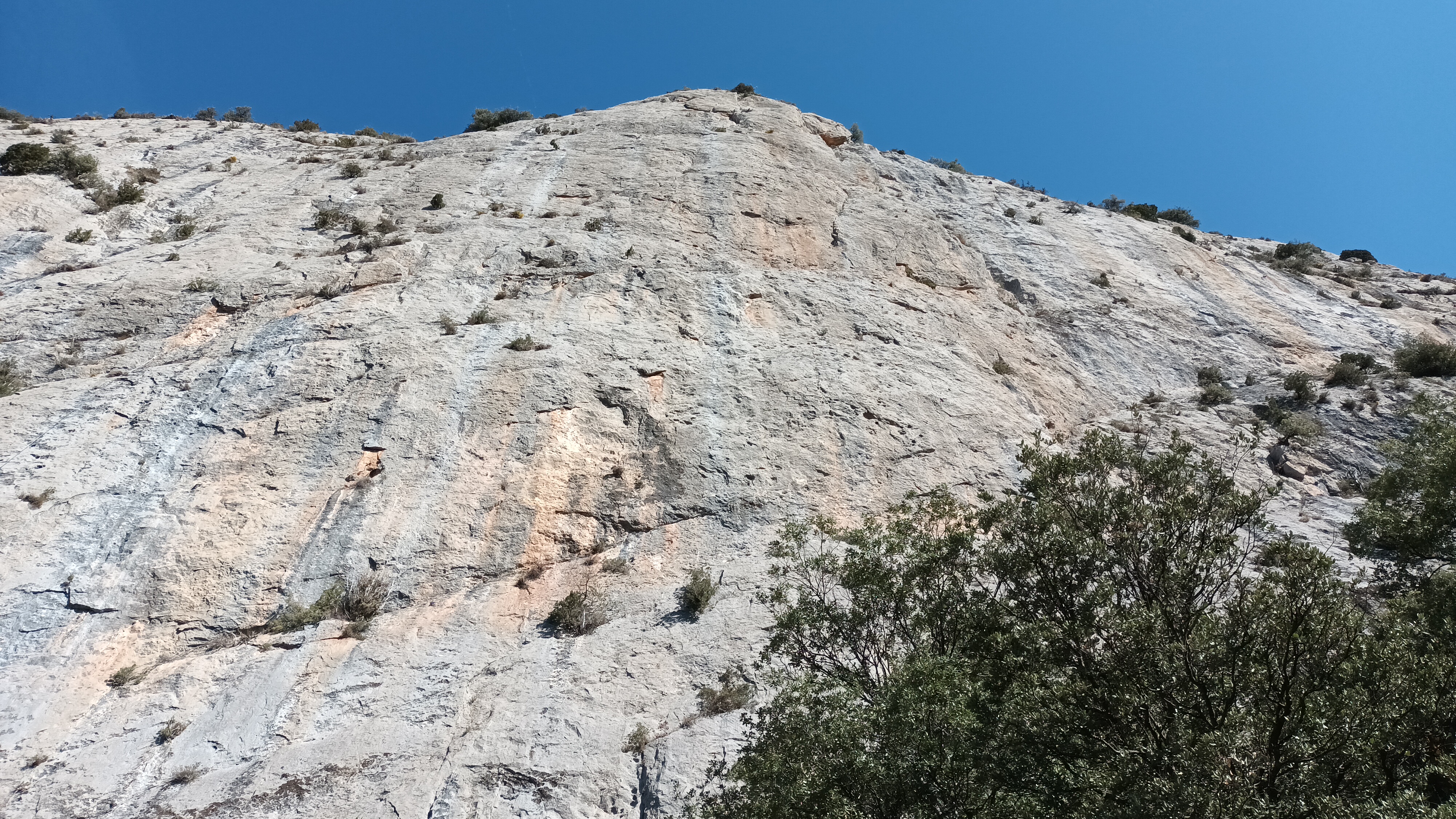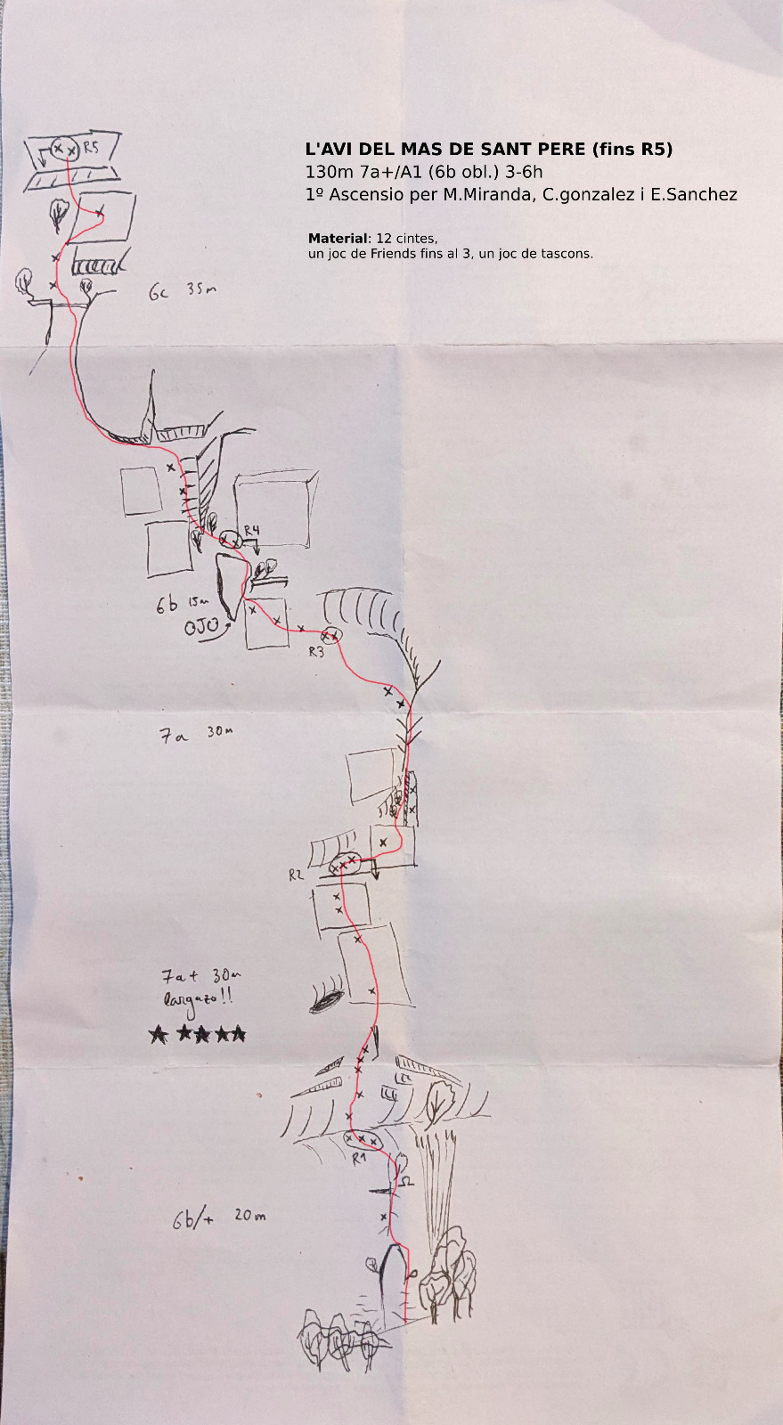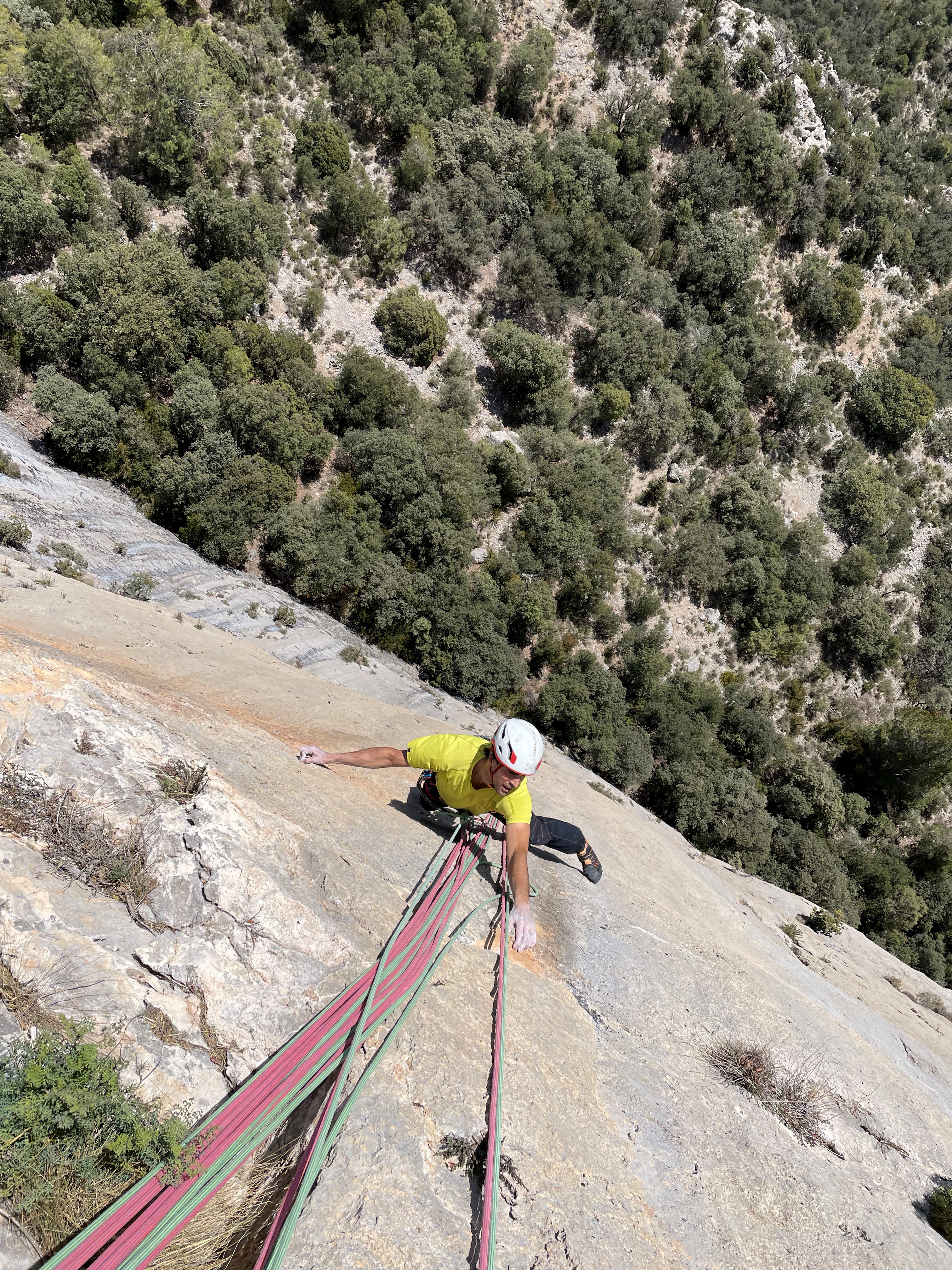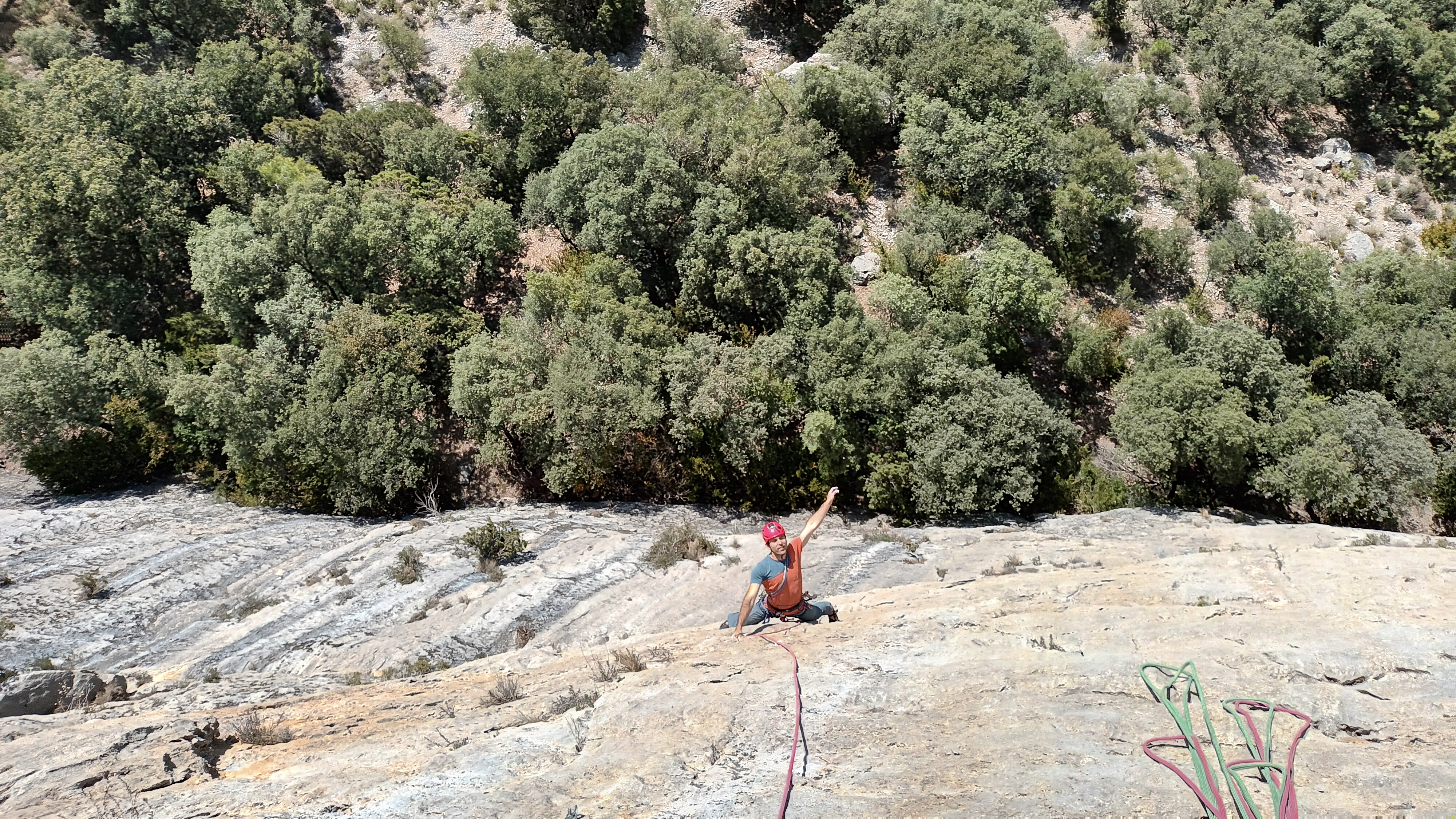 «L´avi del mas de Sant Pere» (El abuelo de la masía de Sant Pere) es una vía semiequipada sobre una caliza impresionante. Surca la parte central de la pared de manera muy directa por algunos paños de roca inmejorables, especialmente el segundo largo, un 7a+ que nos recordará a nuestras mejores escaladas en la Oeste del Picu.