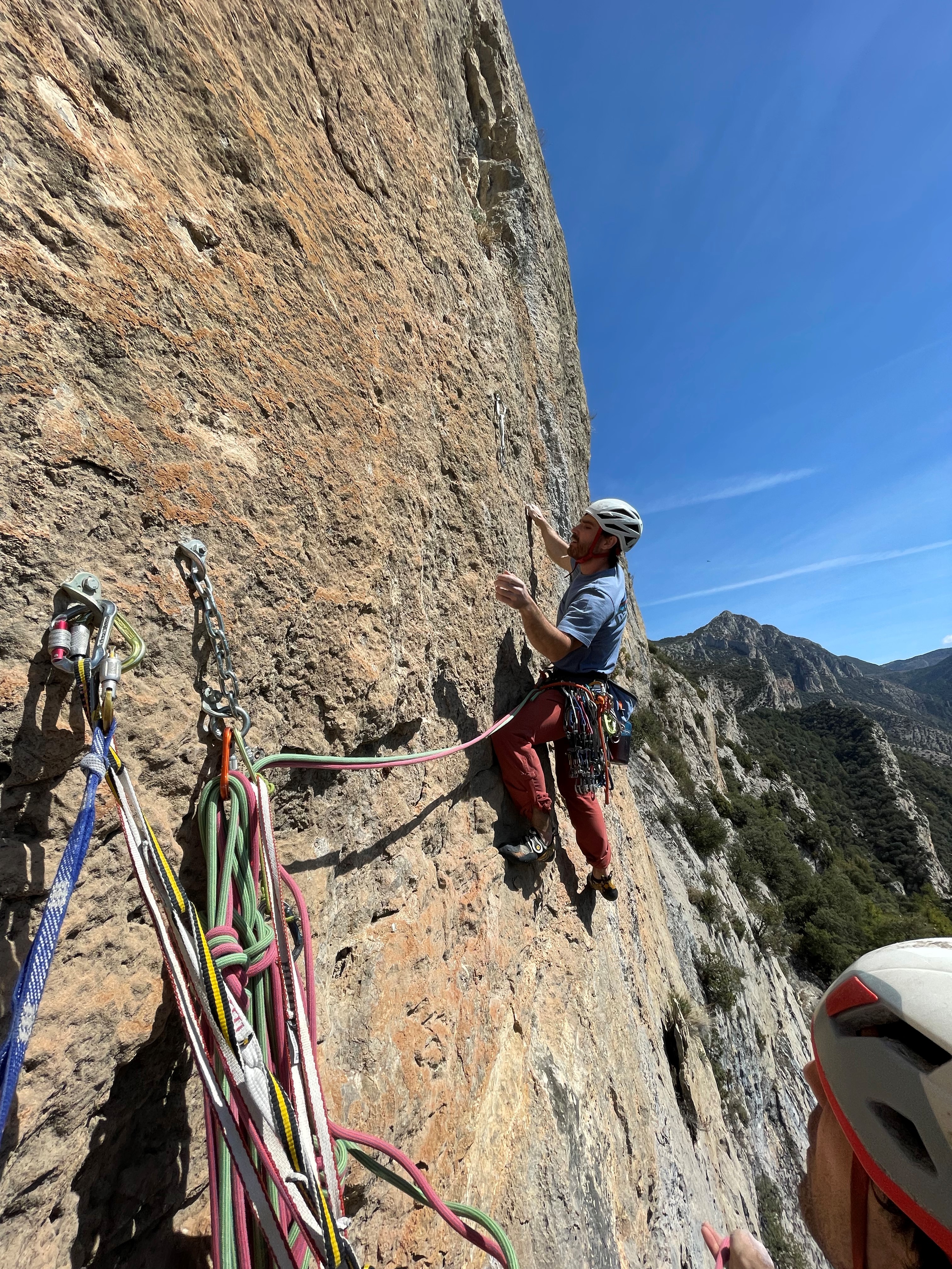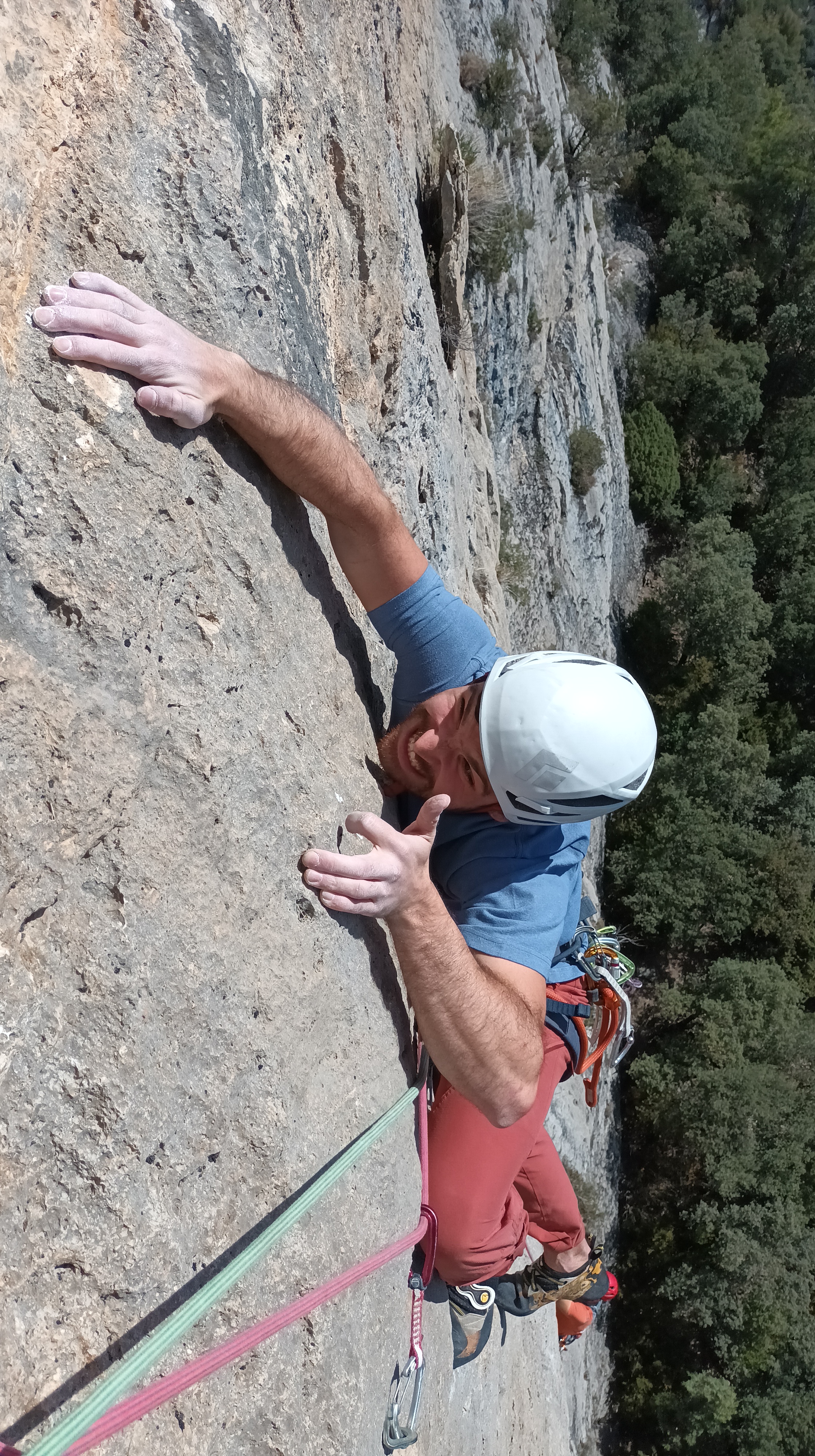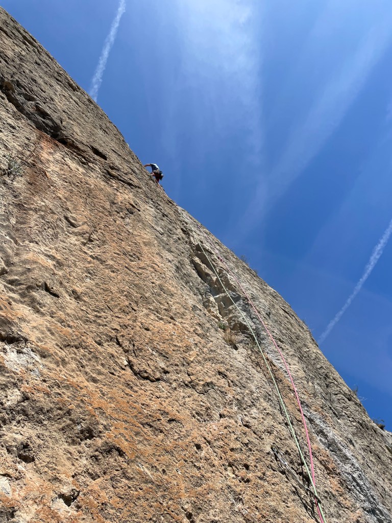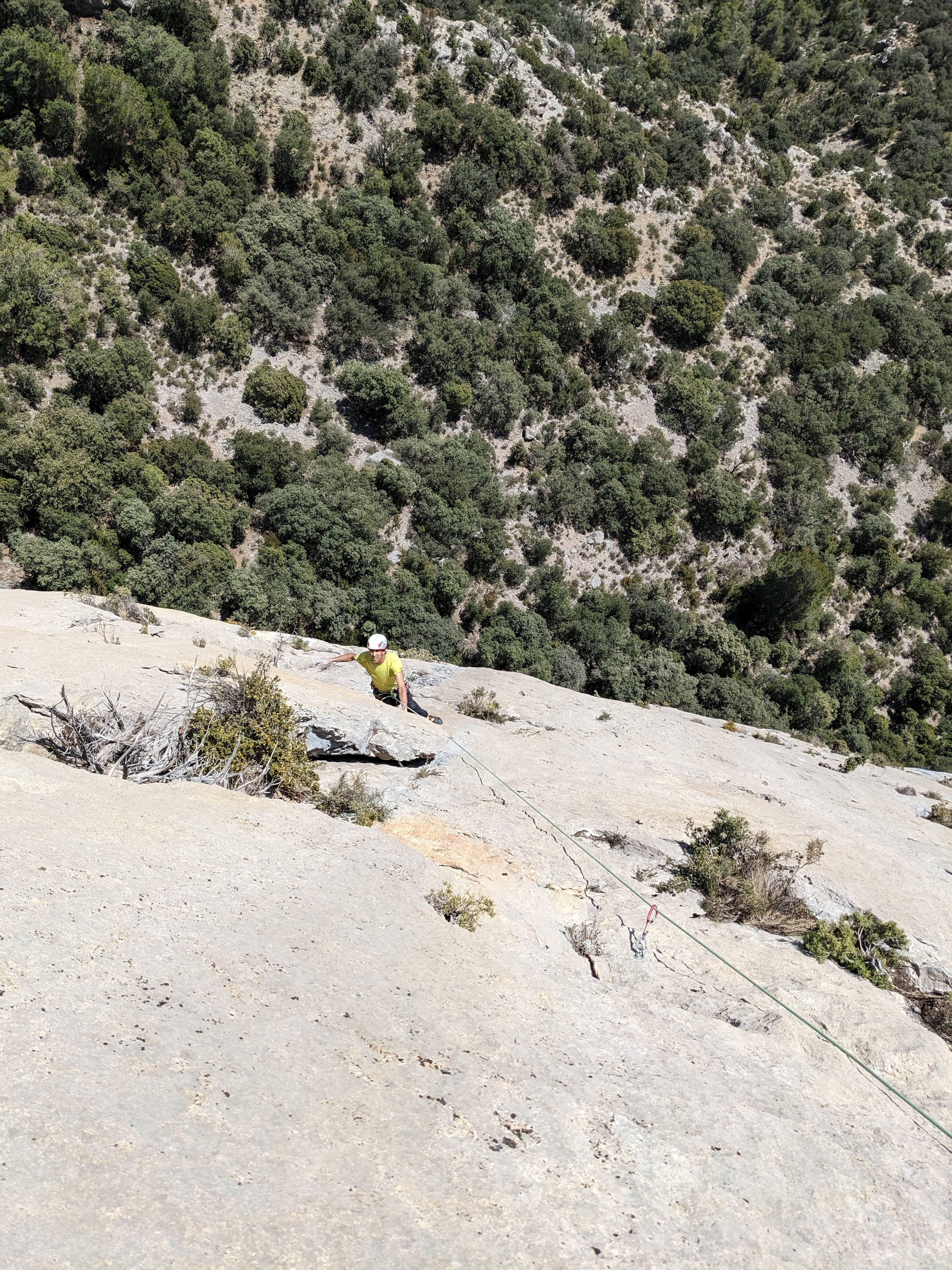 «L´avi del mas de Sant Pere» (El abuelo de la masía de Sant Pere) es una vía semiequipada sobre una caliza impresionante. Surca la parte central de la pared de manera muy directa por algunos paños de roca inmejorables, especialmente el segundo largo, un 7a+ que nos recordará a nuestras mejores escaladas en la Oeste del Picu.