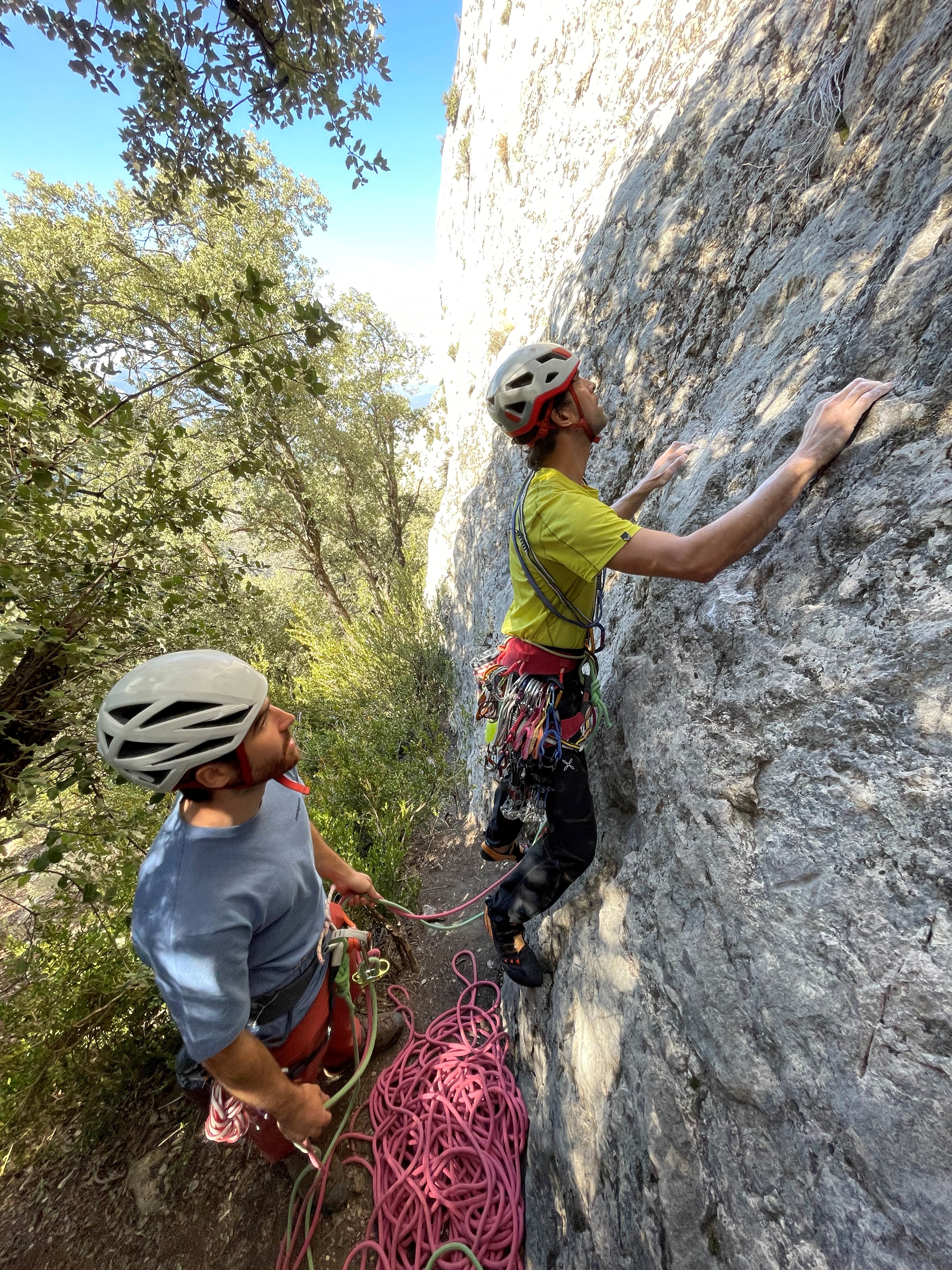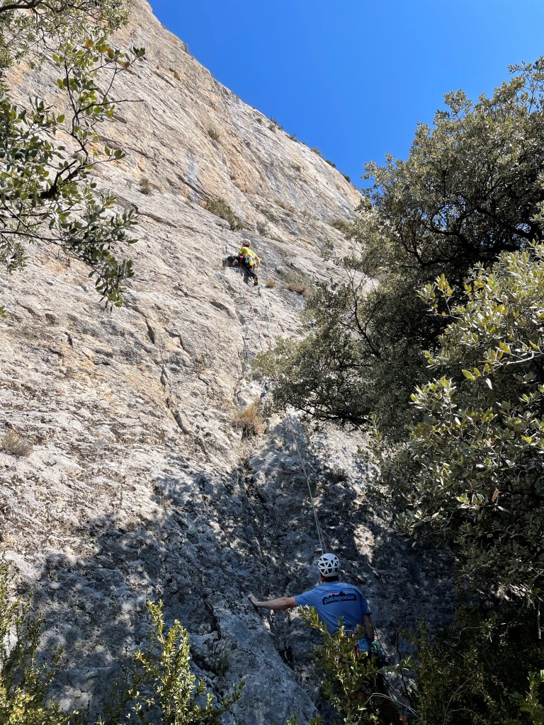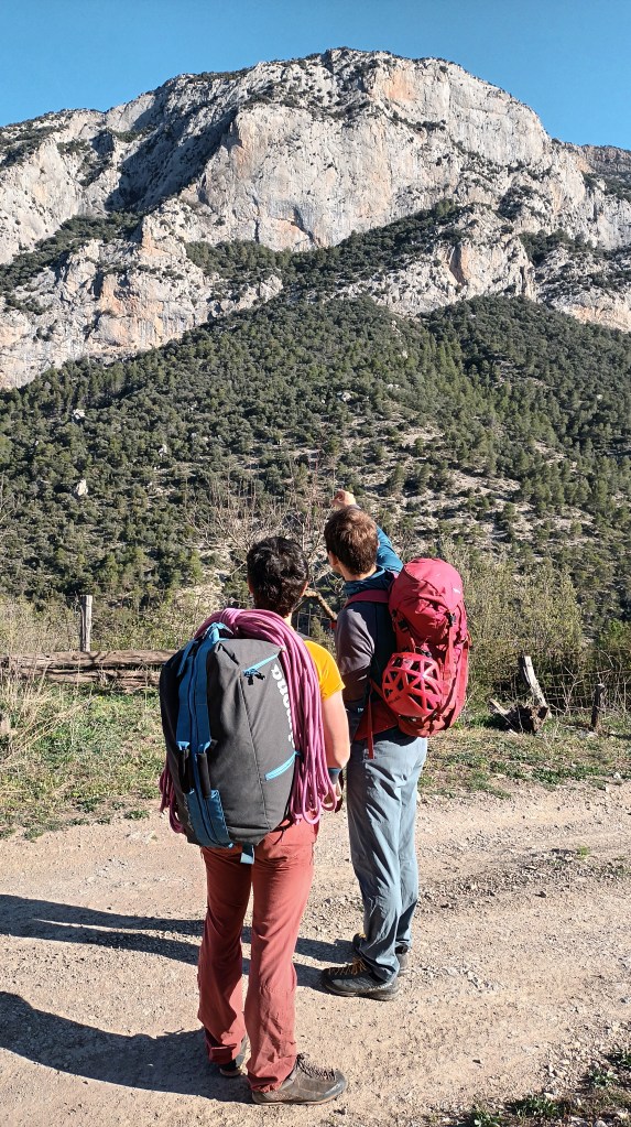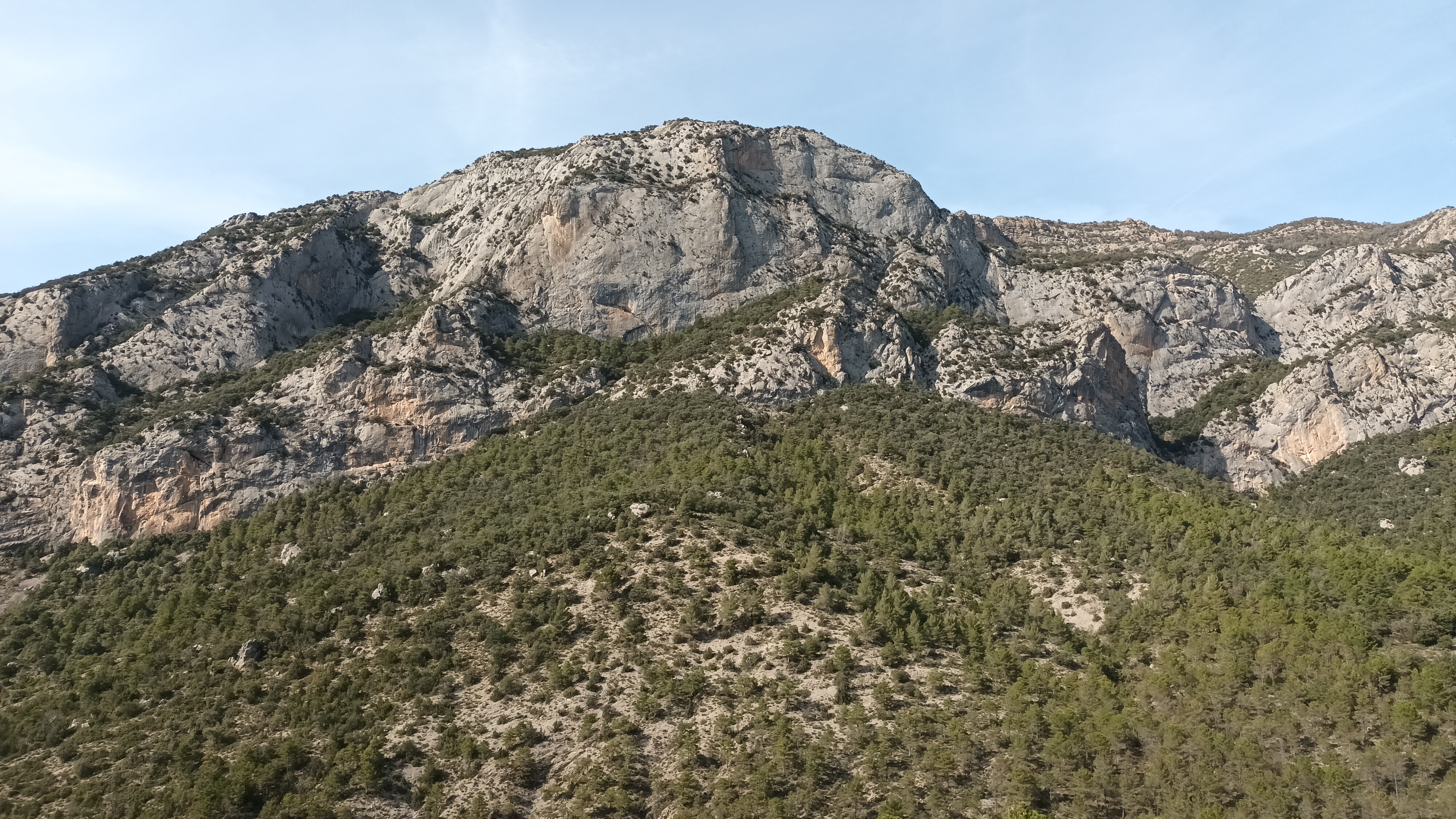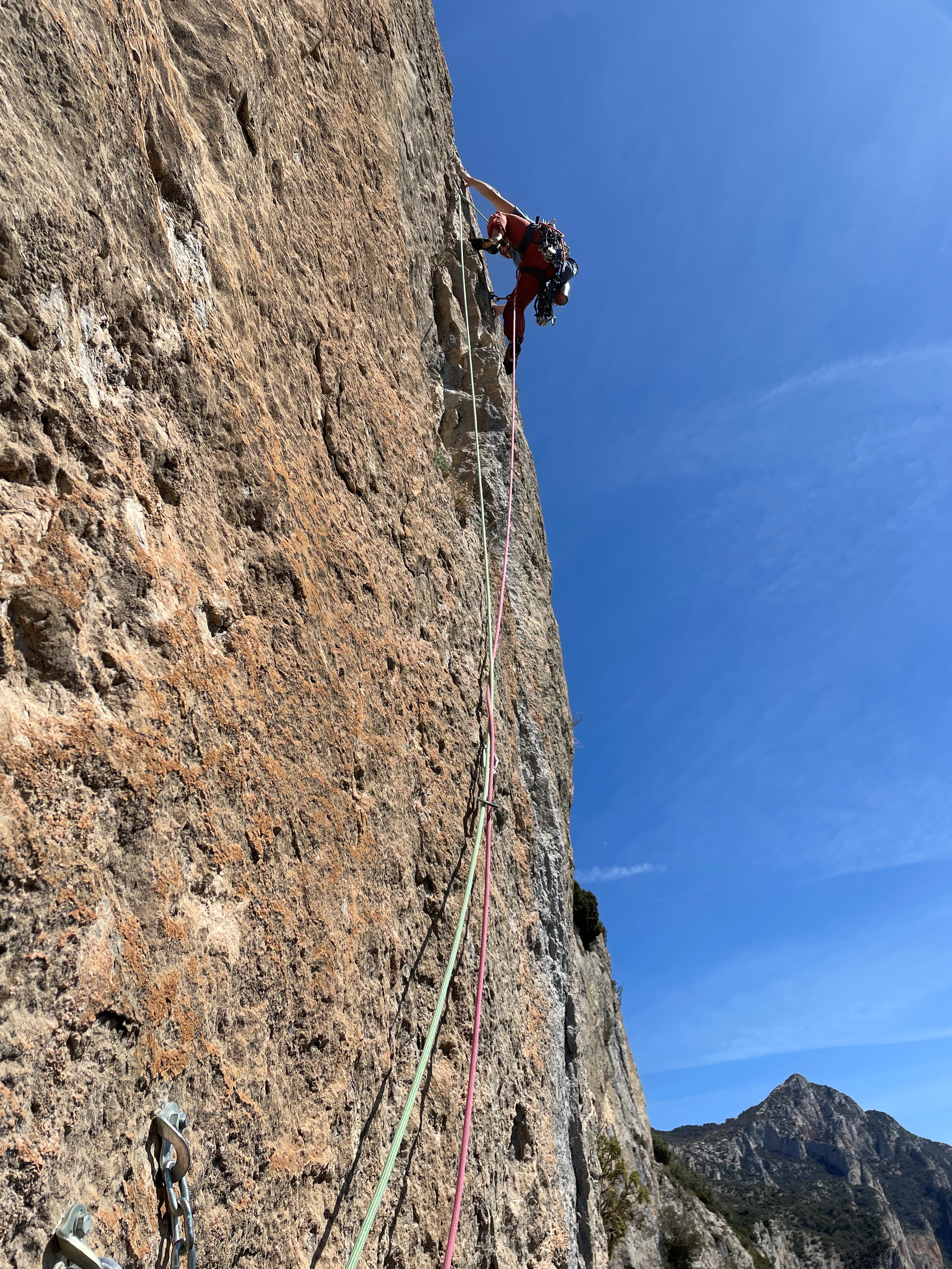 «L´avi del mas de Sant Pere» (El abuelo de la masía de Sant Pere) es una vía semiequipada sobre una caliza impresionante. Surca la parte central de la pared de manera muy directa por algunos paños de roca inmejorables, especialmente el segundo largo, un 7a+ que nos recordará a nuestras mejores escaladas en la Oeste del Picu.