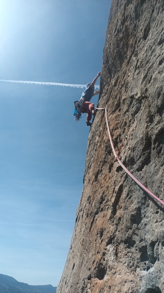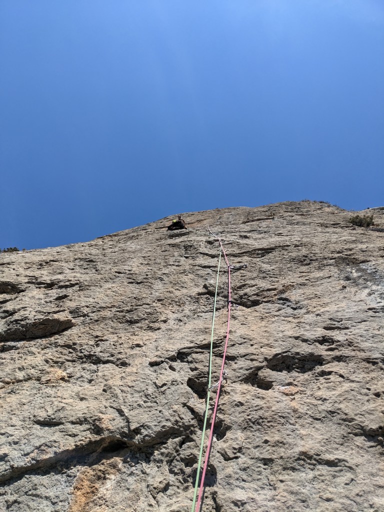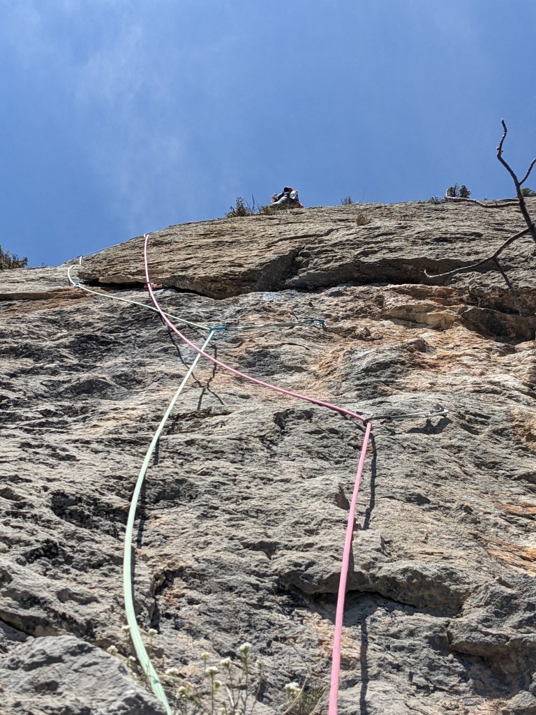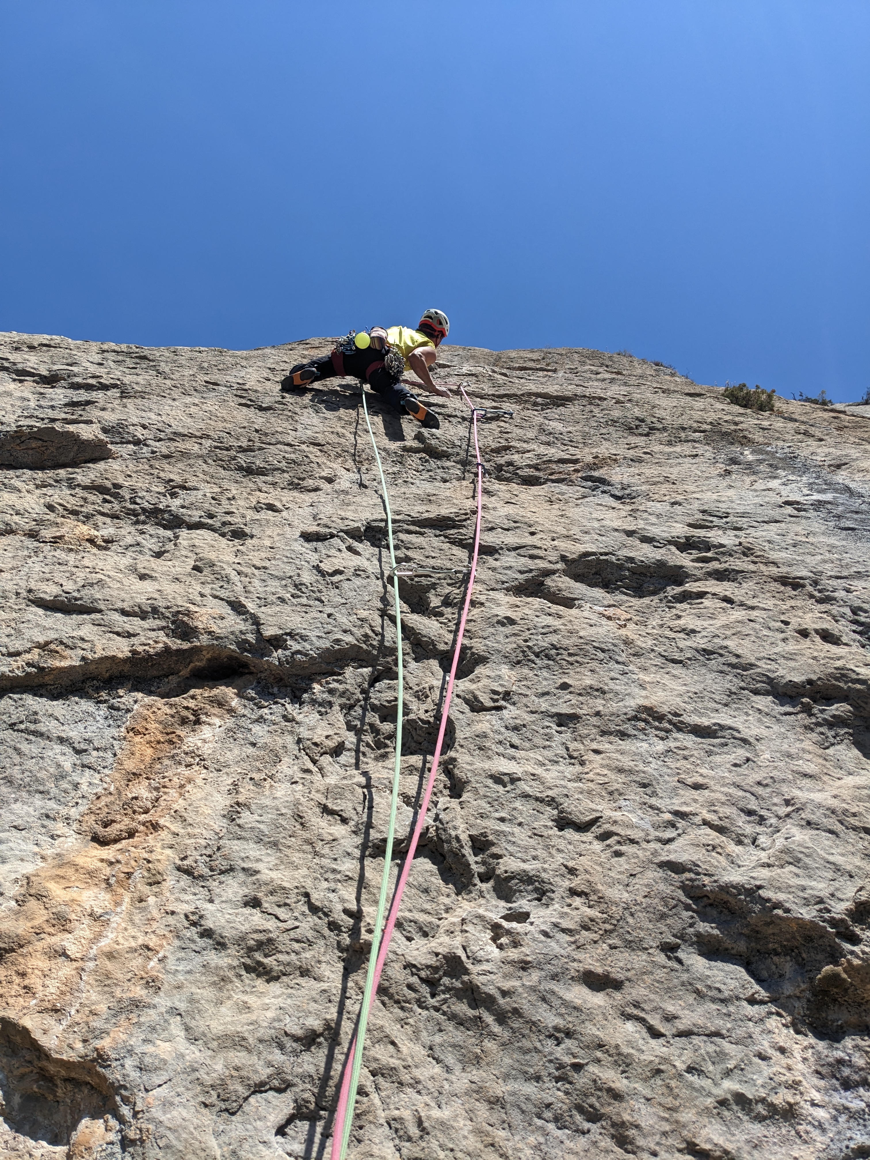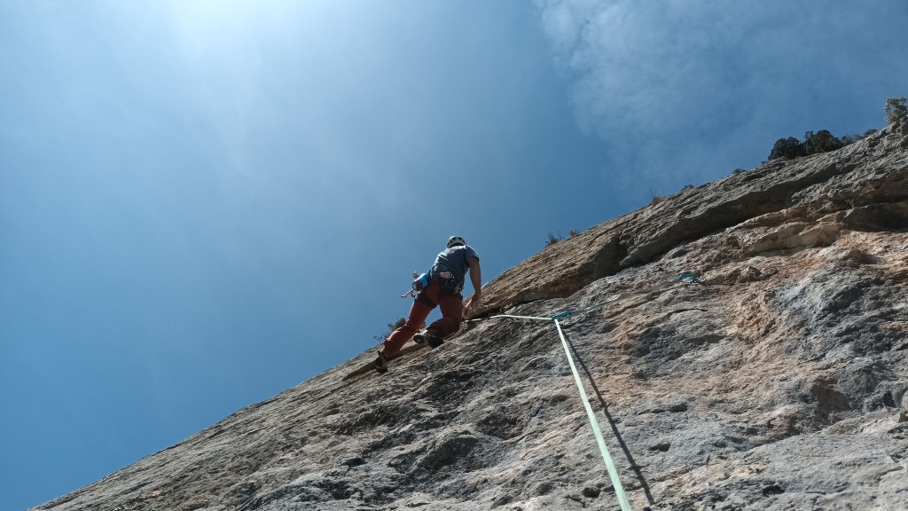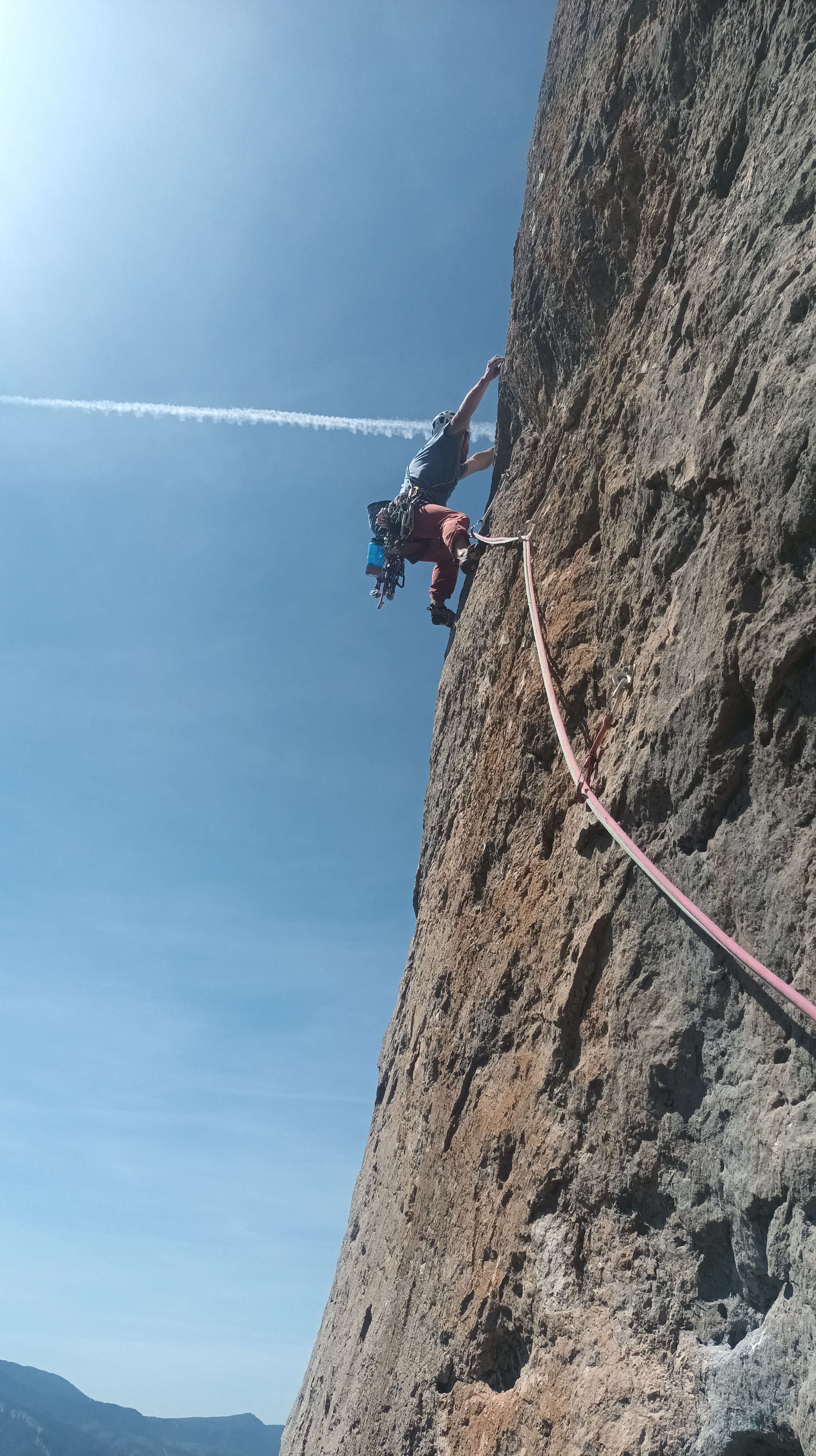 Largo 5, 6c, 30 metros: Una placa técnica protegido por dos bolts nos lleva a una bavaresa limpia. Después una bonita sobre roca excelente. Hasta el rabo todo es toro.
