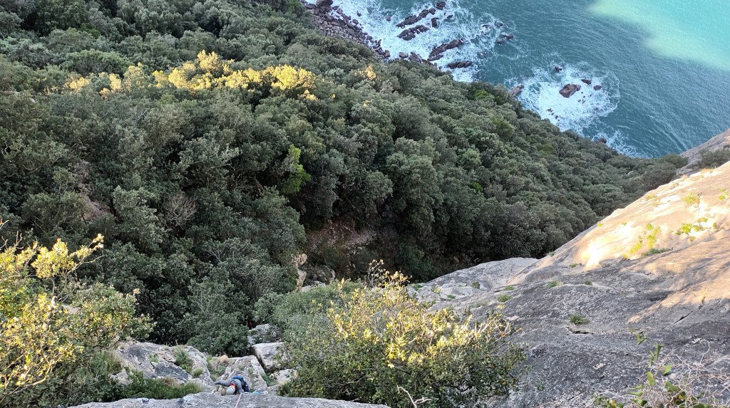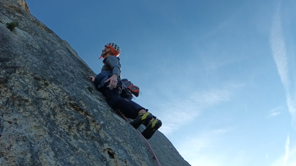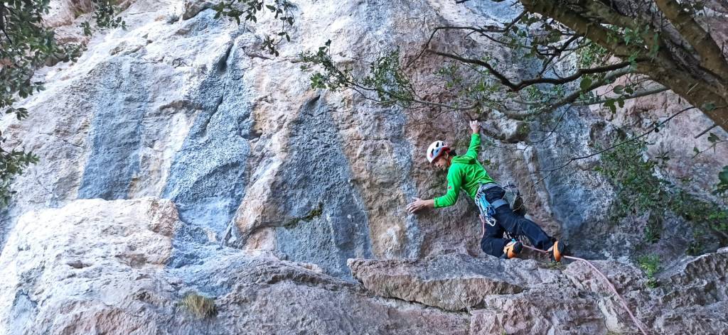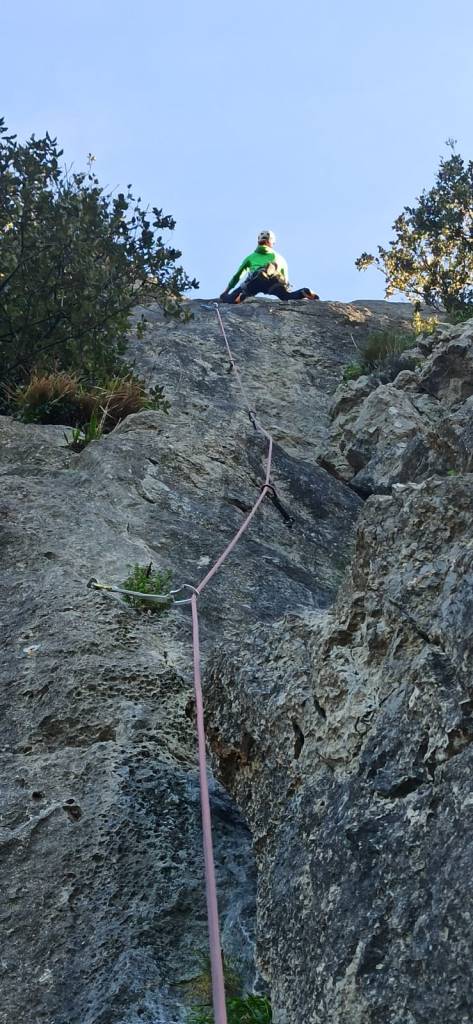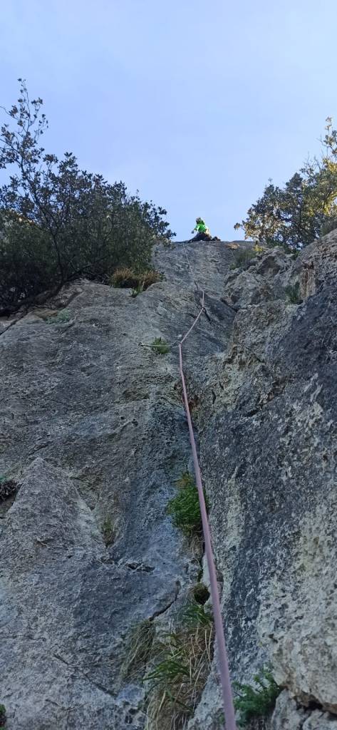 Largo 2, 6b: Ascendemos en recto por terreno sencillo hasta encontrarnos el bloquecito que da grado al largo. Un paso muy estético si lo lees bien.