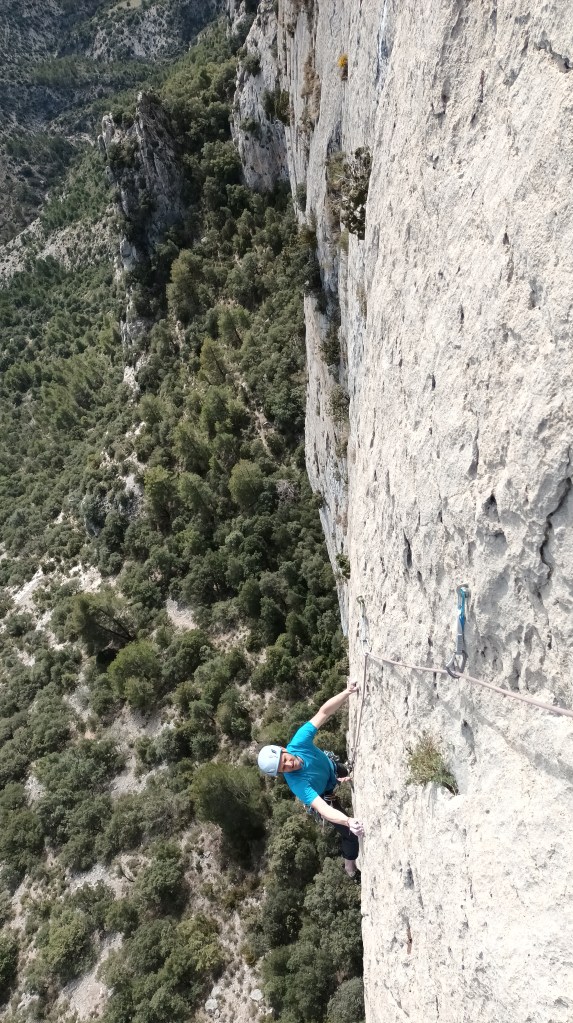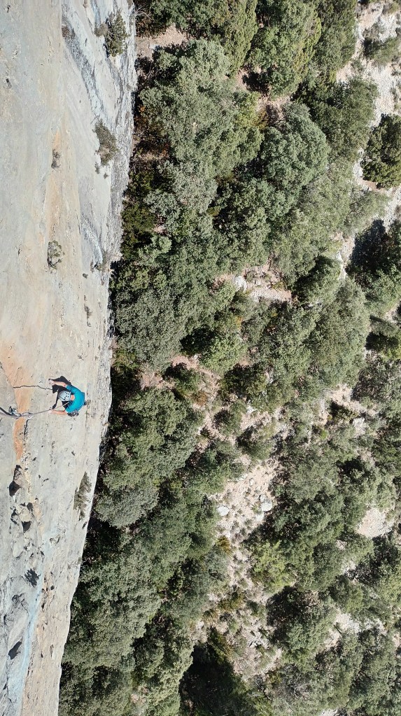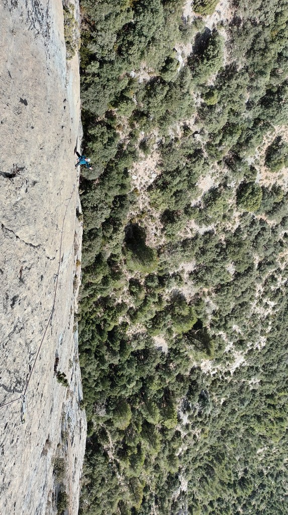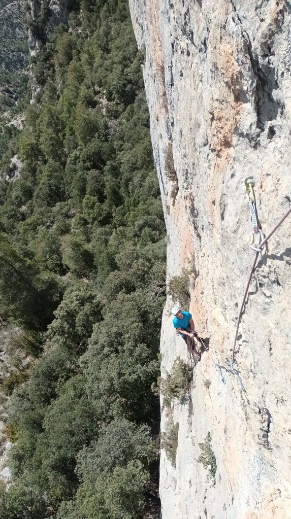 Largo 2, 6a+: La vía continua con la misma dinámica. Placas muy verticales con ambiente. Salimos de la reunión hacia la izquierda, unos pasos en artificial a mitad del largo y después volvemos a escalar en libre hasta la reunión. Buenísimo.