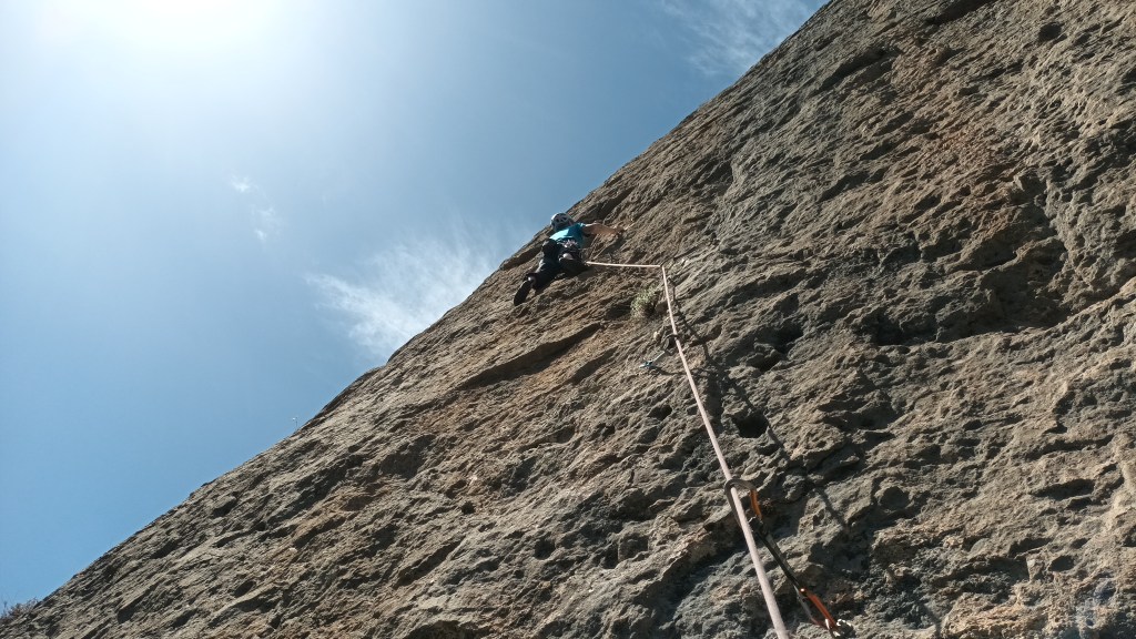 Largo 1, 6a: Unos primeros pasos de Ae y después 6a+ hasta la reunión, que se encuentra en una cómoda repisa.